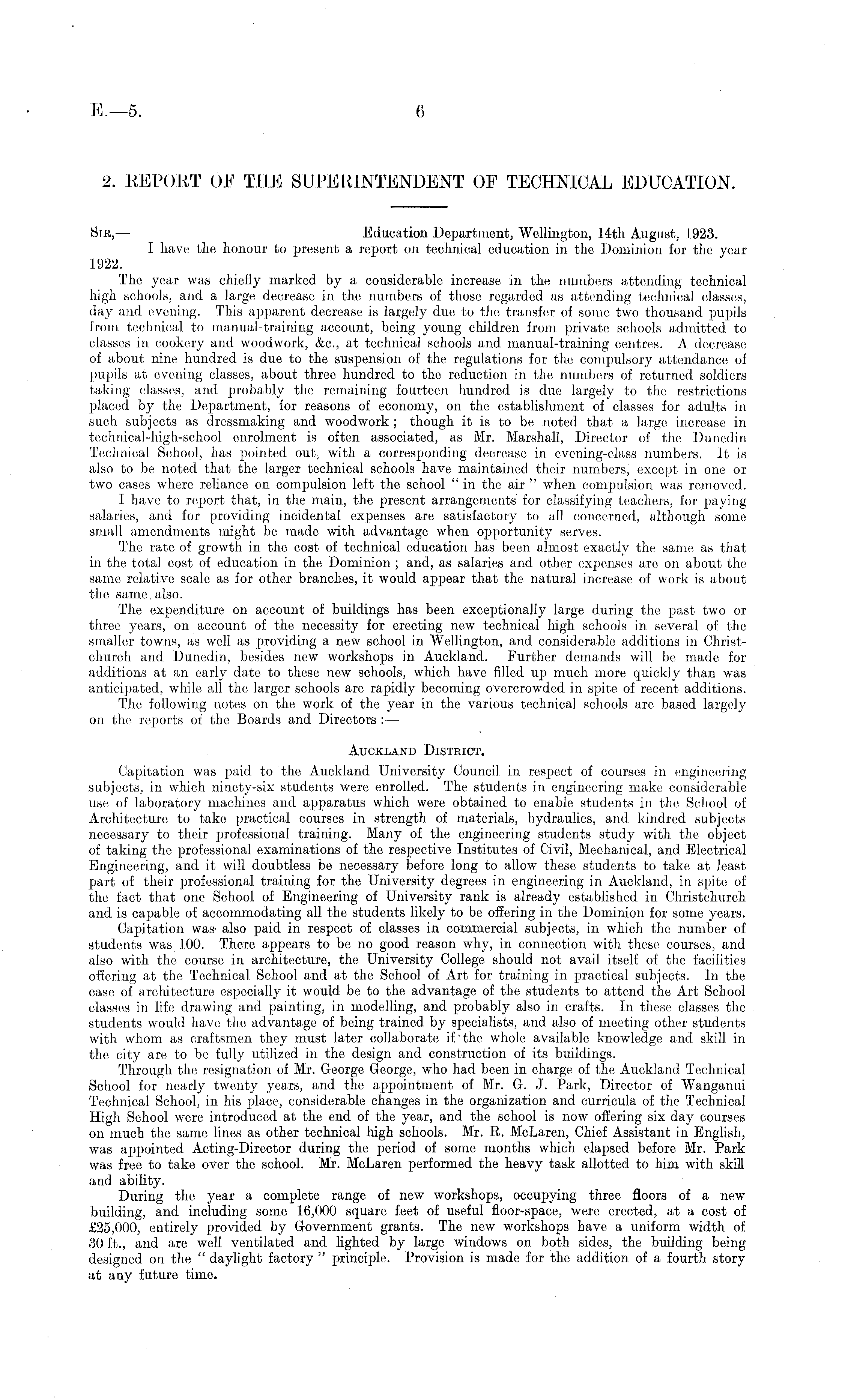 2. EEPOET OE THE SUPERINTENDENT OE TECHNICAL EDUCATION. Sir, — Education Department, Wellington, 14th August. 1923. I have the honour to present a report on technical education in the Dominion for the year 1922. The year was chiefly marked by a considerable increase in the numbers attending technical high schools, and a large decrease in the numbers of those regarded as attending technical classes, day and evening. This apparent decrease is largely due to the transfer of some two thousand pupils from technical to manual-training account, being young children from, private schools admitted to classes in cookery and woodwork, &c, at technical schools and manual-training centres. A decrease of about nine hundred is due to the suspension of the regulations for the compulsory attendance of pupils at evening classes, about three hundred to the reduction in. the numbers of returned, soldiers taking classes, and probably the remaining fourteen hundred is due largely to the restrictions placed by the Department, for reasons of economy, on the establishment of classes for adults in such subjects as dressmaking and. woodwork ; though it is to be noted that a large increase in technical-high-school enrolment is often associated, as Mr. Marshall, Director of the Dunedin Technical School, has pointed out, with a corresponding decrease in evening-class numbers. It is also to be noted that the larger technical schools have maintained their numbers, except in one or two cases where reliance on compulsion left the school " in the air " when compulsion was removed. I have to report that, in the main, the present arrangements for classifying teachers, for paying salaries, and for providing incidental expenses are satisfactory to all concerned, although some small amendments might be made with advantage when opportunity serves. The rate of growth in the cost of technical education has been almost exactly the same as that in the total cost of education in the Dominion ; and, as salaries and other expenses are on about the same relative scale as for other branches, it would appear that the natural increase of work is about the same. also. The expenditure on account of buildings has been exceptionally large during the past two or three years, on account of the necessity for erecting new technical high schools in several of the smaller towns, as well, as providing a new school in Wellington, and considerable additions in Christchurch and Dunedin, besides new workshops in Auckland. Further demands will be made for additions at an early date to these new schools, which have filled up much more quickly than was anticipated, while all the larger schools arc rapidly becoming overcrowded in spite of recent additions. The following notes on the work of the year in the various technical schools are based largely on the reports of the Boards and Directors : — Auckland District. Capitation was paid to the Auckland University Council in respect of courses in engineering subjects, in which ninety-six students were enrolled. The students in. engineering make considerable use of laboratory machines and apparatus which were obtained to enable students in the School of Architecture to take practical courses in strength of materials, hydraulics, and. kindred subjects necessary to their professional training. Many of the engineering students study with the object of taking the professional examinations of the respective Institutes of Civil, Mechanical, and Electrical Engineering, and it will doubtless be necessary before long to allow these students to take at least part of their professional training for the University degrees in engineering in Auckland, in spite of the fact that one School of Engineering of University rank is already established in Christchurch and is capable of accommodating all the students likely to be offering in the Dominion for some years. Capitation was- also paid in respect of classes in commercial subjects, in which the number of students was 100. There appears to be no good reason why, in connection with these courses, and also with the course in architecture, the University College should not avail itself of the facilities offering at the Technical School and at the School of Art for training in practical subjects. In the case of architecture especially it would be to the advantage of the students to attend the Art School classes in life drawing and painting, in modelling, and probably also in crafts. In these classes the students would have the advantage of being trained by specialists, and also of meeting other students with whom as craftsmen they must later collaborate if "the whole available knowledge and skill in the city an; to be fully utilized in the design and construction of its buildings. Through the resignation of Mr. George George, who had been in charge of the Auckland Technical School for nearly twenty years, and the appointment of Mr. G. J. Park, Director of Wanganui Technical School, in his place, considerable changes in the organization and curricula of the Technical High School were introduced at the end of the year, and the school is now offering six day courses on much the same lines as other technical high schools. Mr. R. McLaren, Chief Assistant in English, was appointed Acting-Director during the period of some months which elapsed before Mr. Park was free to take over the school. Mr. McLaren performed the heavy task allotted to him with skill and ability. During the year a complete range of new workshops, occupying three floors of a new building, and including some 16,000 square feet of useful floor-space, were erected, at a cost of £25,000, entirely provided by Government grants. The new workshops have a uniform width of 30 ft., and are well ventilated and lighted by large windows on both sides, the building being designed on the " daylight factory " principle. Provision is made for the addition, of a fourth story at any future time.
