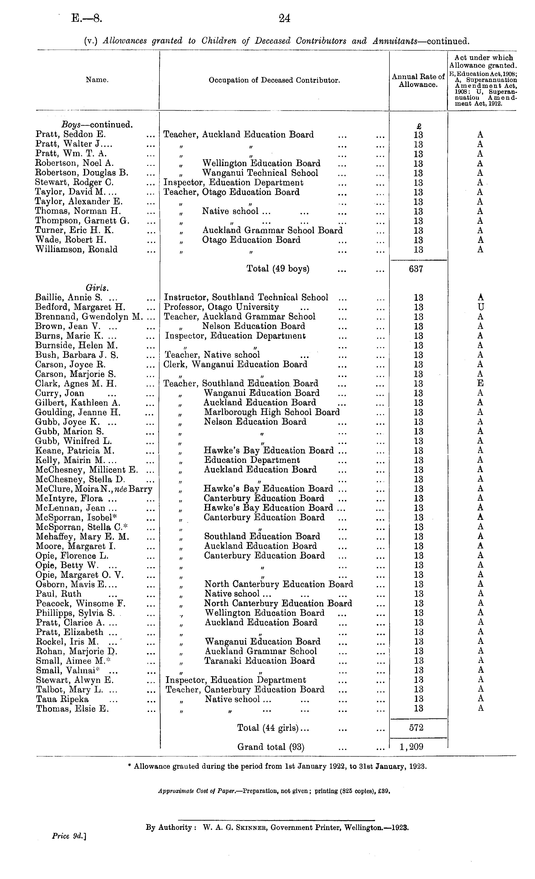 Name. Occupation of Deceased Contributor. Annual Rate of Allowance. Act under which Ailowance granted. E, Education Act, 1908; A, Superannuation Amendment Act, 1908: U, Superannuation Amendment Act, 1912. Boys —continued. Pratt, Seddon E. Pratt, Walter J.... Pratt, Wm. T. A. Robertson, Noel A. Robertson, Douglas B. Stewart, Rodger C. Taylor, David M. ... Taylor, Alexander E. Thomas, Norman H. Thompson, Garnett G. Turner, Eric H. K. Wade, Robert H. Williamson, Ronald Teacher, Auckland Education Board a a ... n a ... „ Wellington Education Board „ Wanganui Technical School Inspector, Education Department Teacher, Otago Education Board £ 13 13 13 13 13 13 13 13 18 13 13 13 13 A A A A A A A A A A A A A It It ■ • • „ Native school ... n a ... ... ... „ Auckland Grammar School Board „ Otago Education Board a a ... Girls. Baillie, Annie S. ... Bedford, Margaret H. Brennand, Gwendolyn M. ... Brown, Jean V. ... Burns, Marie K. ... Burnside, Helen M. Bush, Barbara J. S. Carson, Joyce R. Carson, Marjorie S. Clark, Agnes M. H. Curry, Joan Gilbert, Kathleen A. Goulding, Jeanne H. Gubb, Joyce K. ... Gubb, Marion S. Gubb, Winifred L. Keane, Patricia M. Kelly, Mairin M. ... McChesney, Millicent E. ... McChesney, Stella D. McClure,MoiraN.,w<5eBarry Mclntyre, Flora ... McLennan, Jean ... McSporran, Isobel* McSporran, Stella C* Mehaffey, Mary E. M. Moore, Margaret I. Opie, Florence L. Opie, Betty W. ... Opie, Margaret 0. V. Osborn, Mavis E Paul, Ruth Peacock, Winsome F. Phillipps, Sylvia S. Pratt, Clarice A. ... Pratt, Elizabeth ... Rockel, Iris M. ..." Rohan, Marjorie D. Small, Aimee M.* Small, Vahnai* ... Stewart, Alwyn E. Talbot, Mary L. ... Taua Ripeka Thomas, Elsie E. Total (49 boys) 637 Instructor, Southland Technical School ... Professor, Otago University Teacher, Auckland Grammar School „ Nelson Education Board Inspector, Education Department Teacher, Native school Clerk, Wanganui Education Board it a • • • Teacher, Southland Education Board „ Wanganui Education Board „ Auckland Education Board „ Marlborough High School Board „ Nelson Education Board a it n Hawke's Bay Education Board ... „ Education Department „ Auckland Education Board a a • • • „ Hawke's Bay Education Board ... „ Canterbury Education Board „ Hawke's Bay Education Board ... „ Canterbury Education Board 13 13 13 13 13 13 13 13 13 13 13 13 13 13 13 13 13 13 13 13 13 13 13 13 13 13 13 13 13 13 13 13 13 13 13 13 13 13 13 13 13 13 13 13 A U A A A A A A A B A A A A A A A A A A A A A A A A A A A A A A A A A A A A A A A A A A // a ... „ Southland Education Board „ Auckland Education Board „ Canterbury Education Board a tt ... „ North Canterbury Education Board „ Native school... „ North Canterbury Education Board ., Wellington Education Board „ Auckland Education Board „ Wanganui Education Board „ Auckland Grammar School „ Taranaki Education Board Inspector, Education Department Teacher, Canterbury Education Board „ Native school ... a a • • • ■ • ■ • • ■ Total (44 girls)... 572 Grand total (93) 1,209 * Allowance grauted during the period from 1st January 1922, to 31st Jam lary, 1923.