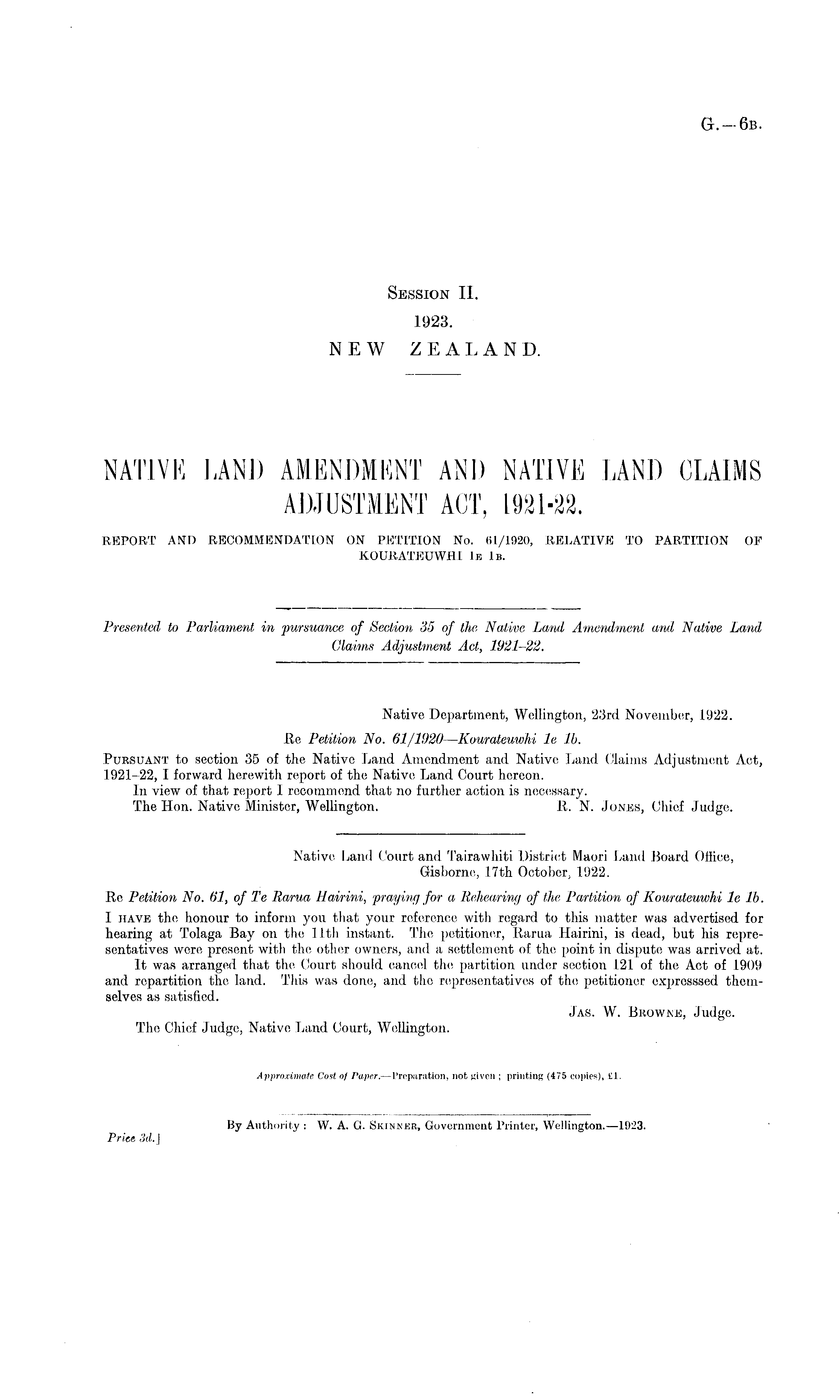 NATIVE LAND AMENDMENT AND NATIVE LAND CLAIMS ADJUSTMENT ACT, 1921-22. REPORT AND RECOMMENDATION ON PETITION No. 61/1920, RELATIVE TO PARTITION OF KOURATEUWHI 1e 1b.