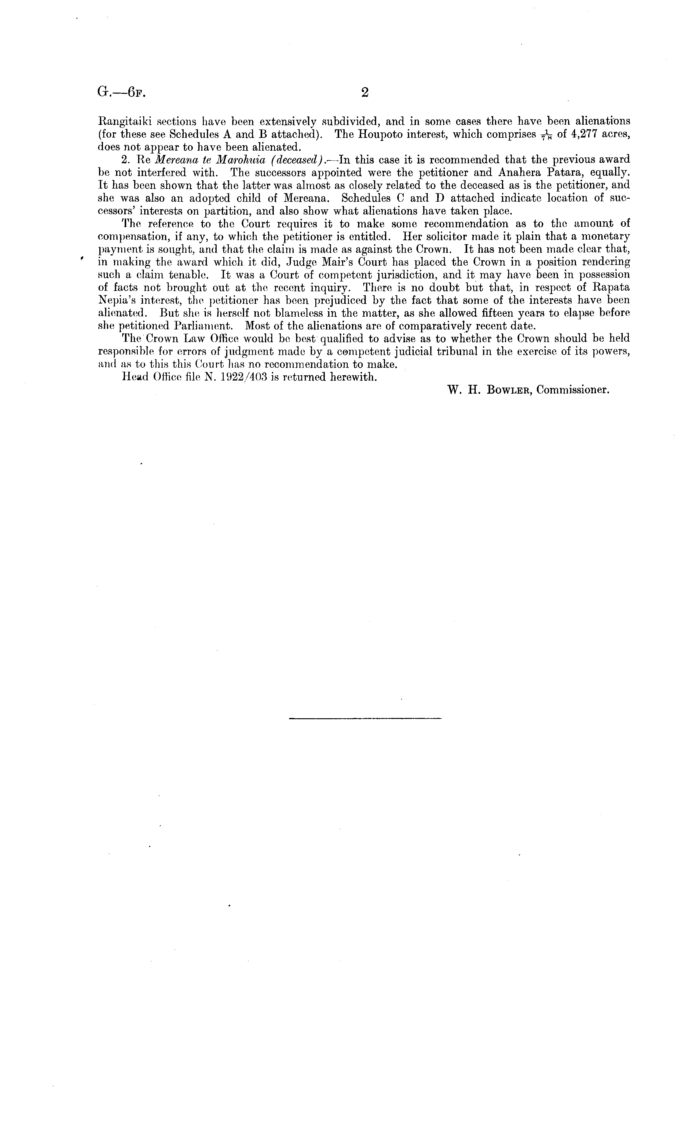 Rangitaiki sections have been extensively subdivided, and in some cases there have been alienations (for these see Schedules A and B attached). The Houpoto interest, which comprises T V 0I 4,277 acres, does not appear to have been alienated. 2. Re Mereana. te Marohuia (deceased).- —In this case it is recommended that the previous award be not interfered with. The successors appointed were the petitioner and Anahera Patara, equally. It has been shown that the latter was almost as closely related to the deceased as is the petitioner, and she was also an adopted child of Mereana. Schedules C and. D attached indicate location of successors' interests on partition, and also show what alienations have taken place. The reference to the Court requires it to make some recommendation as to the amount of compensation, if any, to which the petitioner is entitled. Her solicitor made it plain that a monetary payment is sought, and that the claim is made as against the Crown. It has not been made clear that, in making the award which it did, Judge Mair's Court has placed the Crown in a position rendering such a claim tenable. It was a Court of competent jurisdiction, and it may have been in possession of facts not brought out at the recent inquiry. There is no doubt but that, in respect of Rapata Nepia's interest, the petitioner has been prejudiced by the fact that some of the interests have been alienated. But she is herself not blameless in the matter, as she allowed fifteen years to elapse before she petitioned Parliament. Most of the alienations are of comparatively recent date. The Crown Law Office would be best qualified to advise as to whether the Crown should be held responsible for errors of judgment made by a competent judicial tribunal in the exercise of its powers, and as to this this Court has no recommendation to make. Head Office file N. 1922/403 is returned herewith. W. H. Bowler, Commissioner.