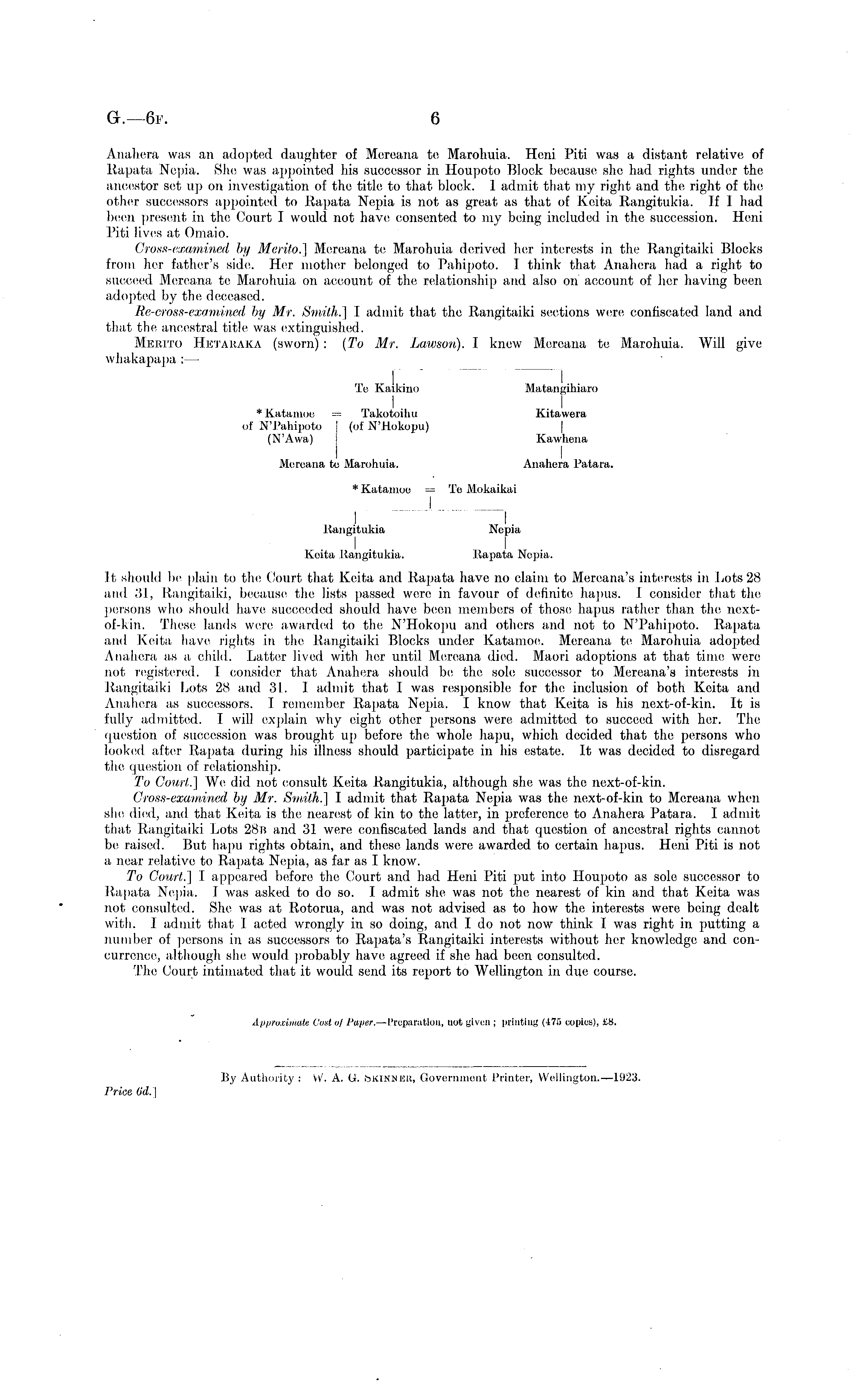 Anahera was an adopted daughter of Mereana te Marohuia. Heni Piti was a distant relative of Rapata Nepia. She was appointed his successor in Houpoto Blook because she had rights under the ancestor set up on investigation of the title to that block. I admit that my right and the right of the other successors appointed to Rapata Nepia is not as great as that of Keita Rangitukia. If I had been present in the Court I would not have; consented to my being included in the succession. Heni Piti lives at Omaio. Cross-examined by Merito.] Mereana te Marohuia derived her interests in the Rangitaiki Blocks from her father's side. Her mother belonged to Pahipoto. I think that Anahera had a right to succeed Mereana te Marohuia on account of the relationship and also on account of her having been adopted by the deceased. Re-cross-examined by Mr. Smith.] I admit that the Rangitaiki sections were confiscated land and that the ancestral title was extinguished. Merito Hetaraka (sworn) : (To Mr. Lawson). I knew Mereana te Marohuia. Will give whakapapa : — Te Kaikino Matangihiaro * Katamoe = Takotoiliu Kitawera of N'Pahipoto J (of N'Hokopu) | (N'Awa) Kawliena Mereana te Marohuia. Anahera Patara. * Katamoe — Te Mokaikai I ~ I Rangitukia Nepia Koita Rangitukia. Rapata Nepia. It should be plain to the Court that Keita and .Rapata have no claim to Mereana's interests in Lots 28 and 31, Rangitaiki, because the lists passed were in favour of definite hapus. 1 consider that the persons who should have succeeded should have been members of those hapus rather than the next-of-kin. These lands were awarded to the N'Hokopu and others and not to N'Pahipoto. Rapata and Keita have rights in the Rangitaiki Blocks under Katamoe. Mereana te Marohuia adopted Anahera as a child. Latter lived with her until Mereana died. Maori adoptions at that time were not registered. I consider that Anahera should be the sole successor to Mereana's interests in Rangitaiki Lots 28 and 31. I admit that I was responsible for the inclusion of both Keita and Anahera as successors. I remember Rapata Nepia. I know that Keita is his next-of-kin. lt is fully admitted, I will explain why eight other persons were admitted to succeed with her. The question of succession was brought up before the whole hapu, which decided that the persons who looked after Rapata during his illness should participate in his estate. It was decided to disregard the question of relationship. To Court.] We did not consult Keita Rangitukia, although she was the next-of-kin. Cross-examined by Mr. Smith.] I admit that Rapata Nepia was the next-of-kin to Mereana when she died, and that Keita is the nearest of kin to the latter, in preference to Anahera Patara. I admit that Rangitaiki Lots 28b and 31 were confiscated lands and that question of ancestral rights cannot be raised. But hapu rights obtain, and these lands were awarded to certain hapus. Heni Piti is not a near relative to Rapata Nepia, as far as I know. To Court.] I appeared before the Court and had Heni Piti put into Houpoto as sole successor to Rapata Nepia. I was asked to do so. I admit she was not the nearest of kin and that Keita was not consulted. She was at Rotorua, and was not advised as to how the interests were being dealt with. I admit that I acted wrongly in so doing, and Ido not now think I was right in putting a number of persons in as successors to Rapata's Rangitaiki interests without her knowledge and concurrence, although she would probably have agreed if she had. been consulted. Tho Court intimated that it would send its report to Wellington in due course.