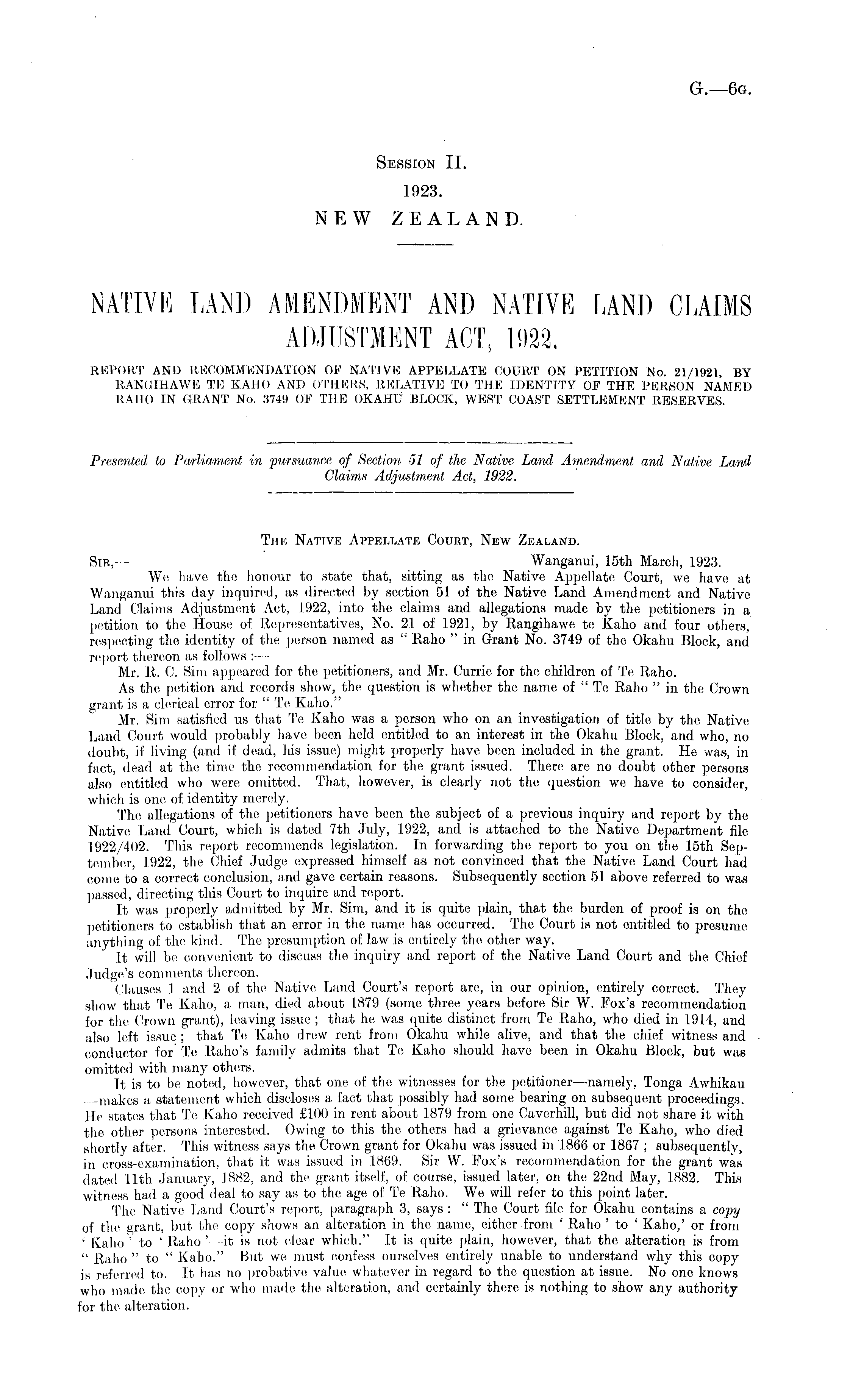The Native Appellate Court, New Zealand. Str — Wanganui, 15th March, 1923. We have the' honour to state that, sitting as the Native Appellate Court, wo have at Wanganui this day inquired, as directed by section 51 of the. Native Land Amendment and Native Land Claims Adjustment Act, 1922, into the claims and allegations made by the petitioners in a petition to the House of Representatives, No. 21 of 1921, by Rangihawe to kaho and four others, respecting the identity of the person named as " Raho " in Grant No. 3749 of tho Okahu Block, and report thereon as follows : — Mr. R. C. Sim appeared for the petitioners, and Mr. Currio for tho children of Te Raho. As the, petition and records show, the question is whether the name, of " To, Raho " in the Crown grant is a clerical error for " To Kaho." Mr. Sim satisfied us that Te Kaho was a person who on an investigation of title by tho Native Land Court would probably have been held entitled to an interest in the Okahu Block, and who, no doubt, if living (and if dead, his issue) might properly have been included in the grant. Ho was, in fact, dead at the time the recommendation for the grant issued. There are no doubt other persons also entitled who were omitted. That, however, is clearly not tho question we have to consider, which is one of identity merely. The allegations of the petitioners have been the subject of a previous inquiry and report by the Native Land Court, which is dated 7th July, 1922, and is attached to the Native Department file 1922/402. This report recommends legislation. In forwarding the report to you on tho 15th September, 1922, the Chief Judge expressed himself as not convinced that tho Native Land Court had come to a correct conclusion, and gave certain reasons. Subsequently section 51 above referred to was passed, directing this Court to inquire and report. It was properly admitted by Mr. Sim, and it is quite plain, that the burden of proof is on tho petitioners to establish that an error in the name has occurred. Tho Court is not entitled to presume anything of the kind. The presumption of law is entirely the other way. It will be convenient to discuss the inquiry and report of the Native Land Court and the Chief Judge's comments thereon. Clauses 1 and 2 of the Native Land Court's report are, in our opinion, entirely correct. They show that Te, Kaho, a man, died about 1879 (some three years before Sir W. Fox's recommendation for the Crown grant), leaving issue ; that he was quite distinct from Te Raho, who died in 1914, and also left issue ; that Te Kaho drew rent from Okahu while alive, and that the chief witness and conductor for Te Raho's family admits that Te Kaho should have been in Okahu Block, but was omitted with many others. It is to be noted, however, that one of the witnesses for the petitioner—namely, Tonga Awhikau makes a statement which discloses a fact that possibly had some bearing on subsequent proceedings. He states that Te Kaho received £100 in rent about 1879 from one Caverhill, but did not share it with the other persons interested. Owing to this the others had a grievance against Te Kaho, who died shortly after. This witness says the Crown grant for Okahu was issued in .1866 or 1867 ; subsequently, in cross-examination, that it was issued in 1869. Sir W. Fox's recommendation for the grant was dated 11th January, 1882, and tho, grant itself, of course, issued later, on tho 22nd May, 1882. This witness had a good deal to say as to the ago of Te Raho. We will refer to this point later. The Native Land Court's report, paragraph 3, says : " Tho Court file for Okahu contains a copy of the, grant, but the copy shows an alteration in the name, either from ' Raho ' to ' Kaho,' or from ' Kaho 'to ' Raho '- -it is not clear which." It is quite plain, however, that tho alteration is from " Raho " to " Kaho." But wo must confess ourselves entirely unable to understand why this copy is referred to. It has no probative value whatever in regard to the question at issue. No one knows who made the copy or who made the alteration, and certainly there, is nothing to show any authority for the alteration.
