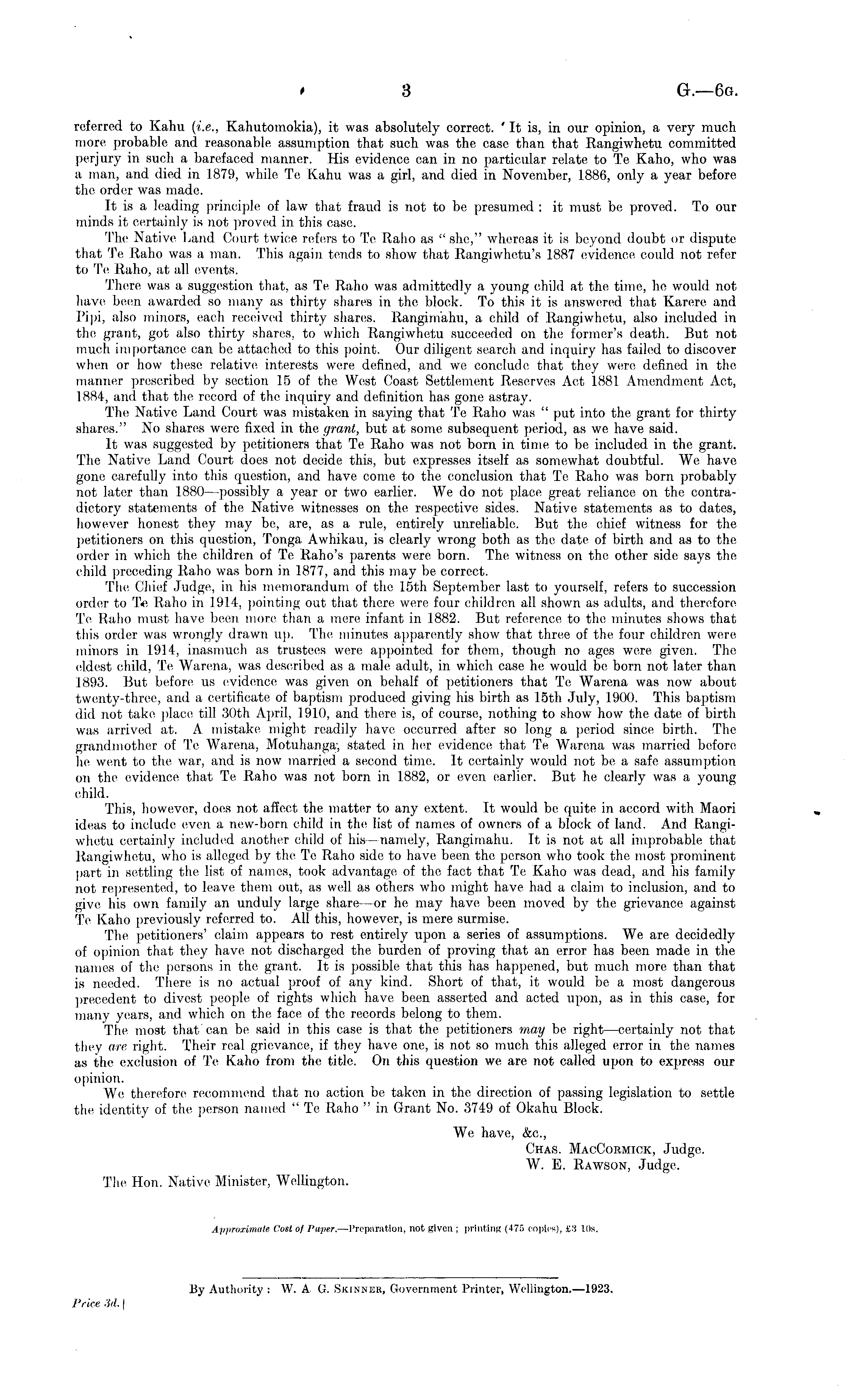 referred to Kahu (i.e., Kahutomokia), it was absolutely correct. ' It is, in our opinion, a very much more probable and reasonable assumption that such was the case than that Rangiwhetu committed perjury in such a barefaced manner. His evidence can in no particular relate to To Kaho, who was a man, and died in 1879, while Te Kahu was a girl, and died in November, 1886, only a year before the order was made. It is a leading principle of law that fraud is not to be presumed :it must be proved. To our minds it certainly is not proved in this case. The Native Land Court twice refers to Te Raho as " she," whereas it is beyond doubt or dispute that Te Raho was a man. This again tends to show that Rangiwhetu's 1887 evidence could not refer to Te Raho, at all events. There was a suggestion that, as Te, Raho was admittedly a young child at the time, he would not have been awarded so many as thirty shares in the block. To this it is answered that Kare.ro and Pipi, also minors, each received thirty shares. Rangim'ahu, a child of Rangiwhetu, also included in the, grant, got also thirty shares, to which Rangiwhetu succeeded on the former's death. But not much importance can be attached to this point. Our diligent search and inquiry has failed to discover when or how these relative interests were defined, and we conclude that thoy were defined in the manner prescribed by section 15 of the West Coast Settlement Reserves Act 1881 Amendment Act, 1884, and that the record of the inquiry and definition has gone astray. Tho Native Land Court was mistaken in saying that Te Raho was " put into the grant for thirty shares." No shares were fixed in the grant, but at some subsequent period, as we have said. It was suggested by petitioners that Te Raho was not born in time to be included in tho grant. The Native Land Court does not decide, this, but expresses itself as somewhat doubtful. We, have gone carefully into this question, and have come to tho, conclusion that To Raho was born probably not later than 1880—possibly a year or two earlier. We do not place great reliance on the contradictory statements of tho Native witnesses on tho respective sides. Native statements as to dates, however honest they may be, are, as a rule, entirely unreliable. But the chief witness for the petitioners on this question, Tonga Awhikau, is clearly wrong both as tho date of birth and as to the order in which the children of To Raho's parents were born. The witness on tho other side says the child preceding Raho was born in 1877, and this may be correct. Tho Chief Judge, in his memorandum of the 15th September last to yourself, refers to succession order to T« Raho in 1914, pointing out that there were four children all shown as adults, and therefore Te, Raho must have been more than a mere infant in 1882. But reference to the minutes shows that this order was wrongly drawn up. The minutes apparently show that three of the, four children were minors in 1914, inasmuch as trustees were appointed for thorn, though no ages were, given. The eldest child, Te, Warena, was described as a male, adult, in which case he would be born not later than 1893. But before us evidence was given on behalf of petitioners that Te Warena was now about twenty-three, and a certificate of baptism produced giving his birth as 15th July, 1900. This baptism did not take place till 30th April, 1910, and there is, of course, nothing to show how the date of birth was arrived at. A mistake might readily have occurred after so long a period since birth. The grandmother of Te Warena, Motuhanga-, stated in her evidence that Te Warena was married before he went to the war, and is now married a second time. It certainly would not be a safe assumption on the evidence that Te Raho was not born in 1882, or even earlier. But he clearly was a young child. This, however, does not affect the matter to any extent. It would be quite in accord with Maori ideas to include even a new-born child in the list of names of owners of a block of land. And Rangiwhetu certainly included another child of his —namely, Rangimahu. Tt is not at all improbable that Rangiwhetu, who is alleged by the Te Raho side to have been the person who took the most prominent part in settling the list of names, took advantage of the fact that Te Kaho was dead, and his family not represented, to leave them out, as well as others who might have had a claim to inclusion, and to give his own family an unduly large share—or he may have, been moved by the grievance against Te Kaho previously referred to. All this, however, is mere, surmise. The petitioners' claim appears to rest entirely upon a series of assumptions. We are decidedly of opinion that they have not discharged the burden of proving that an error has been made in the names of tho persons in the grant. It is possible that this has happened, but much more than that is needed. There is no actual proof of any kind. Short of that, it would be a most dangerous precedent to divest people of rights which have been asserted and acted upon, as in this case, for many years, and which on the, face, of the records belong to them. The most that can be said in this case is that the petitioners may bo right—certainly not that they cure right. Their real grievance, if they have one, is not so much this alleged error in the names as the exclusion of Te Kaho from the title. On this question we are not called upon to express our opinion. We therefore recommend that no action be taken in the direction of passing legislation to settle the identity of the person named " Te Raho " in Grant No. 3749 of Okahu Block. Wo have, &c, Chas. MacCormiok, Judge. W. E. Rawson, Judge. The Hon. Native Minister, Wellington.