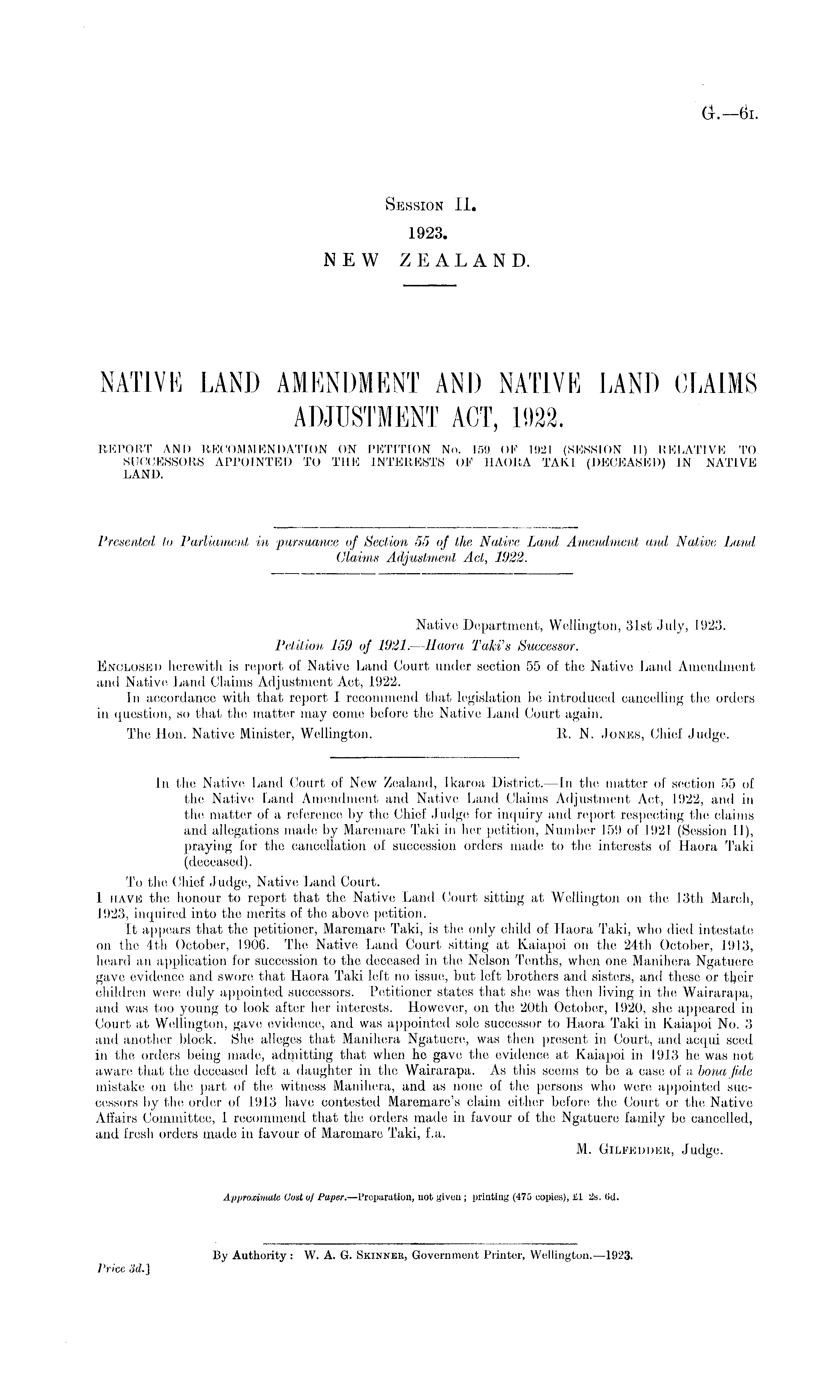 Native Department, Wellington, 31st July, 1923. Petition 159 of 1921. — Haora Taki's Successor. Enclosed herewith is report of Native Land Court under section 55 of the Native Land Amendment and Native Land Claims Adjustment Act, 1922. In accordance with that report I recommend that legislation be introduced cancelling the orders in question, so that the matter may come before the Native Land Court again. The Hon. Native Minister, Wellington. R. N. Jones, Chief Judge.