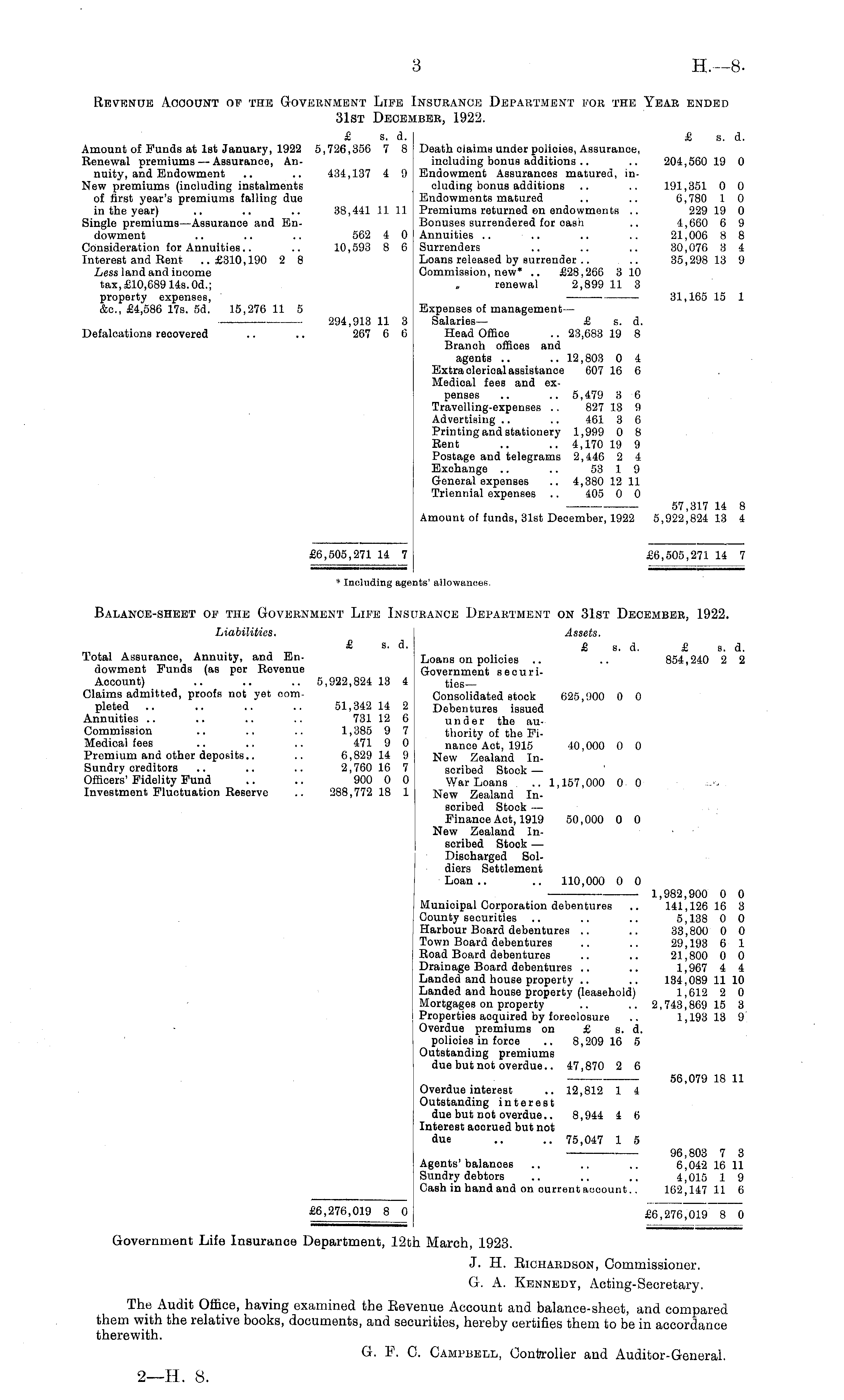 Revenue Account of the Government Life Insurance Department for the Year ended 31st December, 1922. £ s. d. £ s. d. Amount of Funds at Ist January, 1922 5,726,356 7 8 Death claims under polioies, Assurance, Renewal premiums —Assurance, An- including bonuß additions .. .. 204,560 19 0 nuity, and Endowment .. .. 434,137 4 9 Endowment Assurances matured, inNew premiums (including instalments eluding bonus additions .. .. 191,351 0 0 of first year's premiums falling due Endowments matured .. .. 6,780 1 0 in the year) .. .. .. 38,441 11 11 Premiums returned en endowments .. 229 19 0 Single premiums—Assurance and En- Bonuses surrendered for oash .. 4,660 6 9 dowment .. .. .. 562 4 0 Annuities .. .. .. .. 21,006 8 8 Consideration for Annuities.. .. 10,593 8 6 Surrenders .. .. .. 30,076 3 4 Interest and Rent ..£310,190 2 8 Loans released by surrender 35,298 13 9 Less land and income Commission, new* .. £28,266 310 tax, £10,689145. od.; . renewal 2,899 11 3 property expenses, 31,165 15 1 &c, £4,586 17s. sd. 15,276 11 5 Expenses of management— — 294,913 11 3 Salaries— £ s. d. Defalcations reoovered .. .. 267 6 6 Head Office .. 23,683 19 8 Branch offioes and agents .. .. 12,803 0 4 Extra olerioal assistance 607 16 6 Medical fees and expenses .. .. 5,479 3 6 Travelling-expenses .. 827 13 9 Advertising .. .. 461 3 6 Printing and stationery 1,999 0 8 Rent .. .. 4,170 19 9 Postage and telegrams 2,446 2 4 Exohange .. .. 53 1 9 General expenses .. 4,380 12 11 Triennial expenses .. 405 0 0 57,317 14 8 Amount of funds, 31st December, 1922 5,922,824 13 4 £6,505,271 14 7 £6,505,271 14 7 * Including agents' allowances. Balance-sheet of the Government Life Insurance Department on 31st December, 1922. Liabilities. Assets. * s. d. £ g< d . £ 8 . d . Total Assurance, Annuity, and En- Loans on policies .. .. 854,240 2 2 dowment Funds (as per Revenue Government securiAccount) .. .. .. 5,922,824 13 4 tiesClaims admitted, proofs not yet com- Consolidated stock 625,900 0 0 pleted .. .. .. .. 51,342 14 2 Debentures issued Annuities .. .. .. .. 731 12 6 under the auCommission .. .. .. 1,385 9 7 thority of the EiMedical fees .. .. .. 471 9 0 nance Act, 1915 40,000 0 0 Premium and other deposits.. .. 6,829 14 9 New Zealand InSundry creditors .. .. .. 2,760 16 7 scribed Stock — Officers' Fidelity Fund .. .. 900 0 0 War Loans . ..1,157,000 0 0 Investment Fluctuation Reserve .. 288,772 18 1 New Zealand Inscribed Stock — Finance Act, 1919 50,000 0 0 New Zealand Inscribed Stook — Discharged Soldiers Settlement Loan.. .. 110,000 0 0 1,982,900 0 0 Municipal Corporation debentures .. 141,126 16 3 County securities .. .. .. 5,138 0 0 Harbour Board debentures .. .. 33,800 0 0 Town Board debentures .. .. 29,193 6 1 Road Board debentures .. .. 21,800 0 0 Drainage Board debentures .. .. 1,967 4 4 Landed and house property .. .. 134,089 11 10 Landed and house property (leasehold) 1,612 2 0 Mortgages on property .. .. 2,743,869 15 3 Properties acquired by foreclosure .. 1,193 13 9 Overdue premiums on £ s. d. policies in force .. 8,209 16 5 Outstanding premiums due but not overdue.. 47,870 2 6 56,079 18 11 Overdue interest .. 12,812 1 4 Outstanding interest due but not overdue.. 8,944 i 6 Interest aoorued but not due .. .. 75,047 1 5 ■ 96,803 7 3 Agents'balances .. .. .. 6,042 16 11 Sundry debtors .. .. .. 4,015 1 9 Cash in hand and on current account.. 162,147 11 6 £6,276,019 8 0 £67276^019 _ B_o8 _ 0 Government Life Insurance Department, 12th March, 1923. J. H. Richardson, Commissioner. G. A. Kennedy, Acting-Secretary. The Audit Office, having examined the Revenue Account and balance-sheet, and compared them with the relative books, documents, and securities, hereby certifies them to be in accordance therewith. G. V. C. Campbell, Controller and Auditor-General.