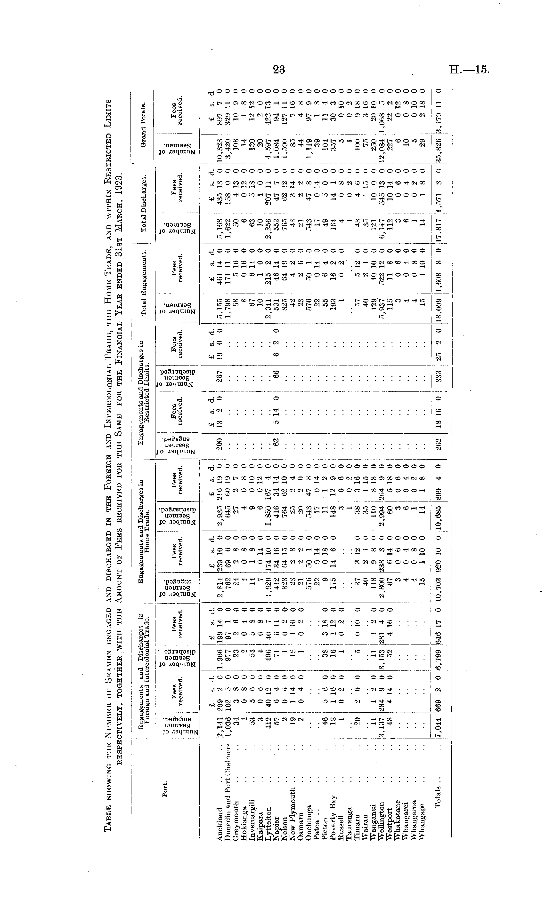 Table showing the Number of Seamen engaged and discharged in the Foreign and Intercolonial Trade, the Home Trade, and within Restricted Limits respectively, together with the Amount of Fees received for the same for the Financial Year ended 31st March, 1923.