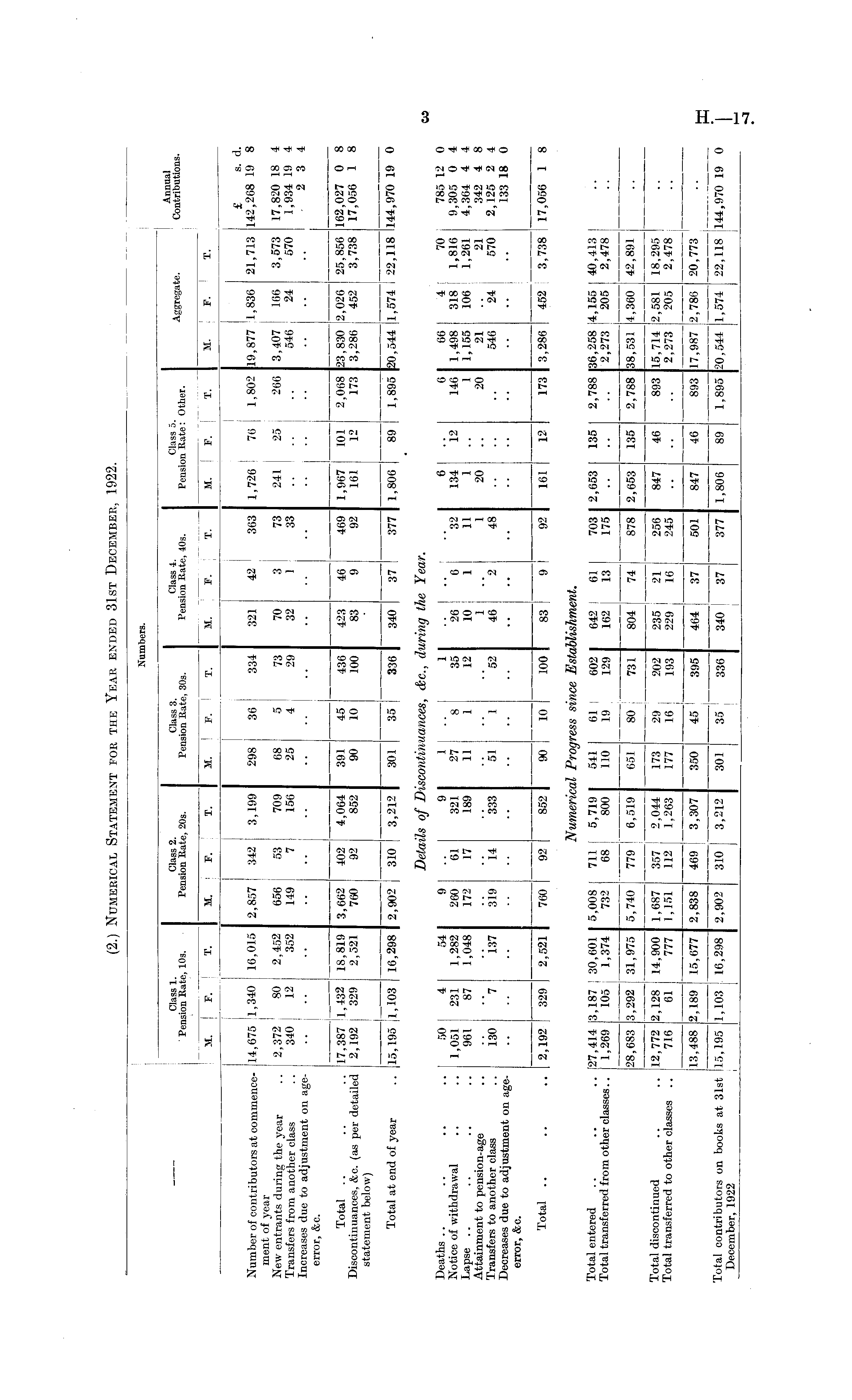 Numbers. Annual Contributions. Class 1. Pension Rate, 10s. M. F. T. Class 2. Pension Rate, 20s. Class 3. Pension Kate, 30s. Class i. Pension Kate, 40s. Class 5. Pension Rate: Other. Aggregate. E. I M. F. T. U. F. I. M. T. M. F. T. H. F. T, Number of contributors at commencement of year New entrants during the year Transfers from another class Increases due to adjustment on ageerror, &c. 14,675 1,340 16,015 2,857 j 342 3,199 298 36 334 I 42 363 I 1,726 76 1,802 19,877 f s. d. 1,836 21,713 142,268 19 8 321 2,372 80 2,452 340 ! 12 352 1656 149 53 709 68 7 156 25 5 73 4 29 70 32 3 73 1 33 241 25 j 266 13,407 546 166 3,573 17,820 18 4 24 570 1,934 19 4 2 3 4 I Total .. Discontinuances, &c. (as per detailed statement below) 17,387 1,432 18,819 2,192 329 2,521 3,662 760 402 4,064 391 92 852 90 .. .. 45 436 10 100 423 83 .. .. 46 469 9 92 1,967 101 2,068 161 12 173 1,806 89 1,895 - 23,830 3,286 2,026 25,856 162,027 0 8 452 3,738 17,056 1 8 ' ■ Total at end of year 15,195 1,103 16,298 | I 2,902 J j 310 j 3,212 J 301 35 336 I 340 37 377 I |20,544 j 1,574 I 22,118 144,970 19 0 Deaths Notice of withdrawal Lapse Attainment to pension-age Transfers to another class Decreases due to adjustment on ageerror, &c. 50 4 54 1,051 231 1,282 961 j 87 1,048 130 \ "l 137 19 260 172 Details of Discontim nances, &c, du iring ih he Year. 66 1,498 1,155 21 546 4 j 70 785 12 0 318 ! 1,816 9,305 0 4 106 i 1,261 4,364 4 4 21 342 4 8 24 570 2,125 2 4 133 18 0 9 1 61 321 27 17 189 11 1 8 35 1 12 26 10 46 "a '32 2 48 6 6 134 12 146 1 1 20 20 319 14 333 51 1 52 • • • • .. .. Total 2,192 329 2,521 | 760 92 852 90 10 100 I 9 ! 92 I 161 12 173| I 3,286 452 3,738 17,056 1 8 83 Total entered Total transferred from other classes.. 127,414 3,187 I 30,601 1,269 105 , 1,374 28,683 3,292 31,975 12,772 2,128 ! 14,900 716 61 J 777 15,008 732 Numerical Progt ress since Estal Mshme :nt. I 2,653 I 135 2,788 I 136,258 2,273 4,155 40,413 205 2,478 Total discontinued Total transferred to other classes .. 15,740 1,687 1,151 711 5,719 541 68 800 110 779 6,519 651 357 ! 2,044 173 112 1,263 177 469 3,307 350 310 3,212 301 61 602 I 19 129 I 80 ! 7371 29 J 202 f 16 j 193 642 I 162 804 235 229 61 703 I 13 175 I 74 878] 21 256 16 245 I 2,653 135 2,788 847 46 893~j 38,531 15,714 2,273 4,360 42,891 2,581 18,295 205 2,478 .... .. Total contributors on books at 31st December, 1922 13,488 2,189 15,677 15,1»6 1,103 16,298 [2,838 2,902 45 395 464 I 37 501 I 847 46 893 17,987 2,786 20,773 35 336 340 37 377 1,806 89 1,895 20,544 1,574 22,118 144,970 19 0
