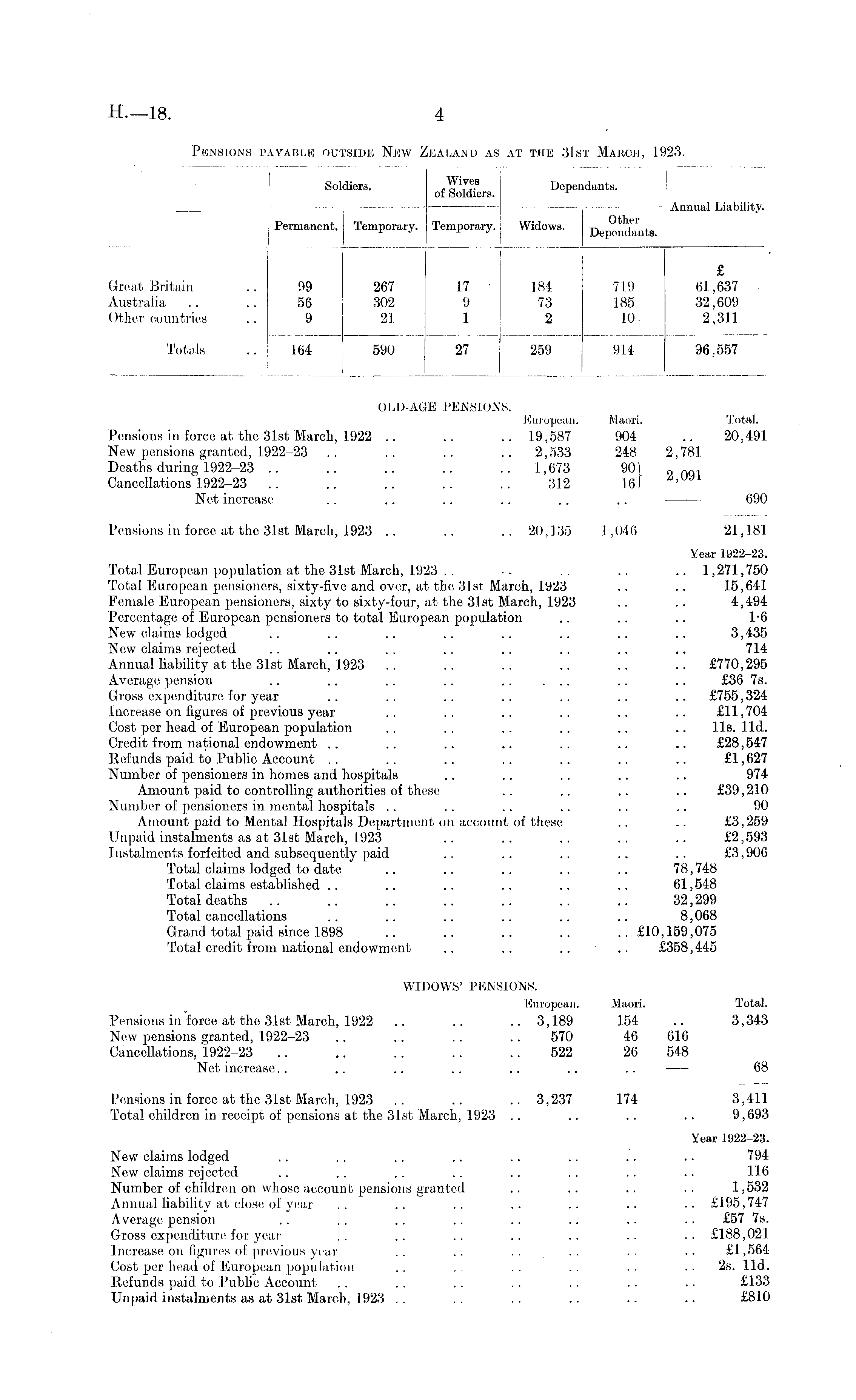 OLD-AGE PENSIONS. European, Maori. Total. Pensions in force at the 31st March, 1922 .. .. .. 19,587 904 .. 20,491 New pensions granted, 1922-23 .. .. .. ..2,533 248 2,781 Deaths during 1922-23 .. .. .. .. ..1,673 90} „ „ Q . Cancellations 1922-23 .. .. .. .. .. 312 16) ' Net increase .. .. .. . . .. .. 690 Pensions in force at the 31st March, 1923 .. . . .. 20,135 1,046 21,181 Year 1922-23. Total European population at the 31st March, 1923 .. ■. . . .. .. 1,271,750 Total European pensioners, sixty -five and over, at the 31st March, 1923 .. .. 15,641 Female European pensioners, sixty to sixty-four, at the 31st March, 1923 .. .. 4,494 Percentage of European pensioners to total European population .. .. .. 1-6 New claims lodged .. .. .. .. .. .. .. .. 3,435 New claims rejected .. .. .. .. .. .. .. .. 714 Annual liability at the 31st March, 1923 .. .. .. .. .. .. £770,295 Average pension .. .. .. . . . . .. .. .. £36 7s. Gross expenditure for year .. . . .. . . . . .. .. £755,324 Increase on figures of previous year .. .. .. .. .. .. £11,704 Cost per head of European population .. .. .. .. .. .. lis. lid. Credit from national endowment .. .. .. .. .. .. .. £28,547 Refunds paid to Public, Account .. .. .. .. .. .. .. £1,627 Number of pensioners in homes and hospitals .. .. .. .. .. 974 Amount paid to controlling authorities of these .. . . .. .. £39,210 Number of pensioners in mental hospitals . . . . .. . . .. .. 90 Amount paid to Mental Hospitals Department on account of these .. .. £3,259 Unpaid instalments as at 31st March, 1923 .. .. .. .. .. £2,593 Instalments forfeited and subsequently paid .. .. .. .. .. £3,906 Total claims lodged to date .. .. .. .. .. 78,748 Total claims established .. .. .. .. .. .. 61,548 Total deaths .. .. .. .. .. .. .. 32,299 Total cancellations .. .. .. .. .. .. 8,068 Grand total paid since 1898 .. .. .. .. ..£10,159,075 Total credit from national endowment .. .. .. .. £358,445 WIDOWS' PENSIONS. European. Maori. Total. Pensions in "force at the 31st March, 1922 .. .. .. 3,189 154 .. 3,343 New pensions granted, 1922-23 .. .. .. .. 570 46 616 Cancellations, 1922-23 .. .. .. .. 522 26 548 Net increase.. .. .. .. .. .. .. 68 Pensions in force at the 31st March, 1923 .. ..3,237 174 3,411 Total children in receipt of pensions at the 31st March, 1923 .. .. .. .. 9,693 Year 1922-23. New claims lodged .. .. .. .. .. .. .. .. 794 New claims rejected .. .. .. .. .. .. .. .. 116 Number of children on whose account pensions granted .. .. .. . . 1,532 Annual liability at close of year .. .. .. .. .. .. .. £195,747 Average pension .. .. .. .. .. .. .. .. £57 7s. Gross expenditure for year .. .. .. .. .. .. .. £188,021 Increase on figures of previous year .. .. .. .. .. .. £1,564 Cost per head of European population . . . . . . . . . . 2s. lid. Refunds paid to Public Account . . .. . . . . . . .. . . £133 Unpaid instalments as at 31st March, 1923 .. .. .. .. .. .. £810