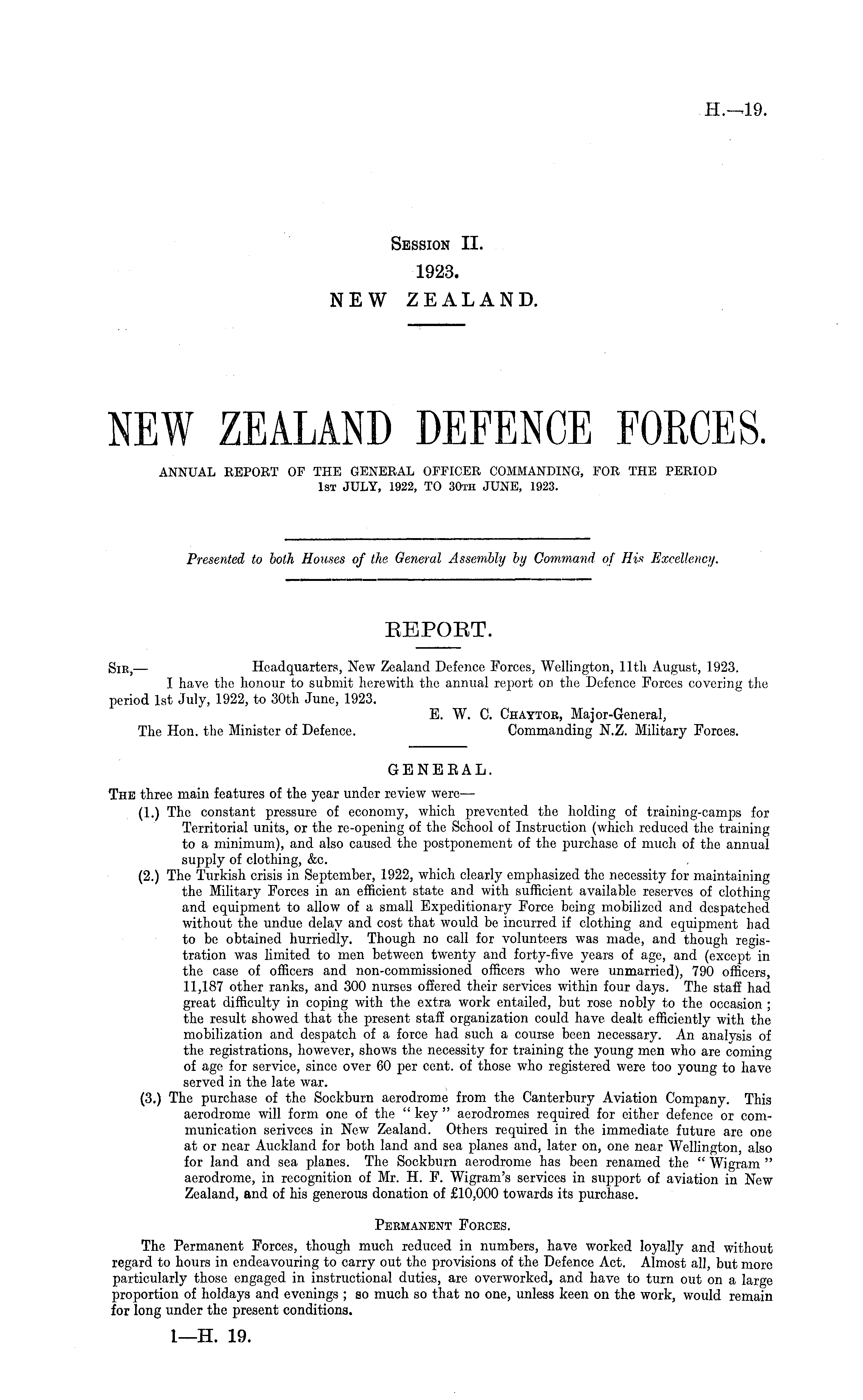 NEW ZEALAND DEFENCE FORCES. ANNUAL REPORT OF THE GENERAL OFFICER COMMANDING, FOR THE PERIOD 1st JULY, 1922, TO 30th JUNE, 1923.