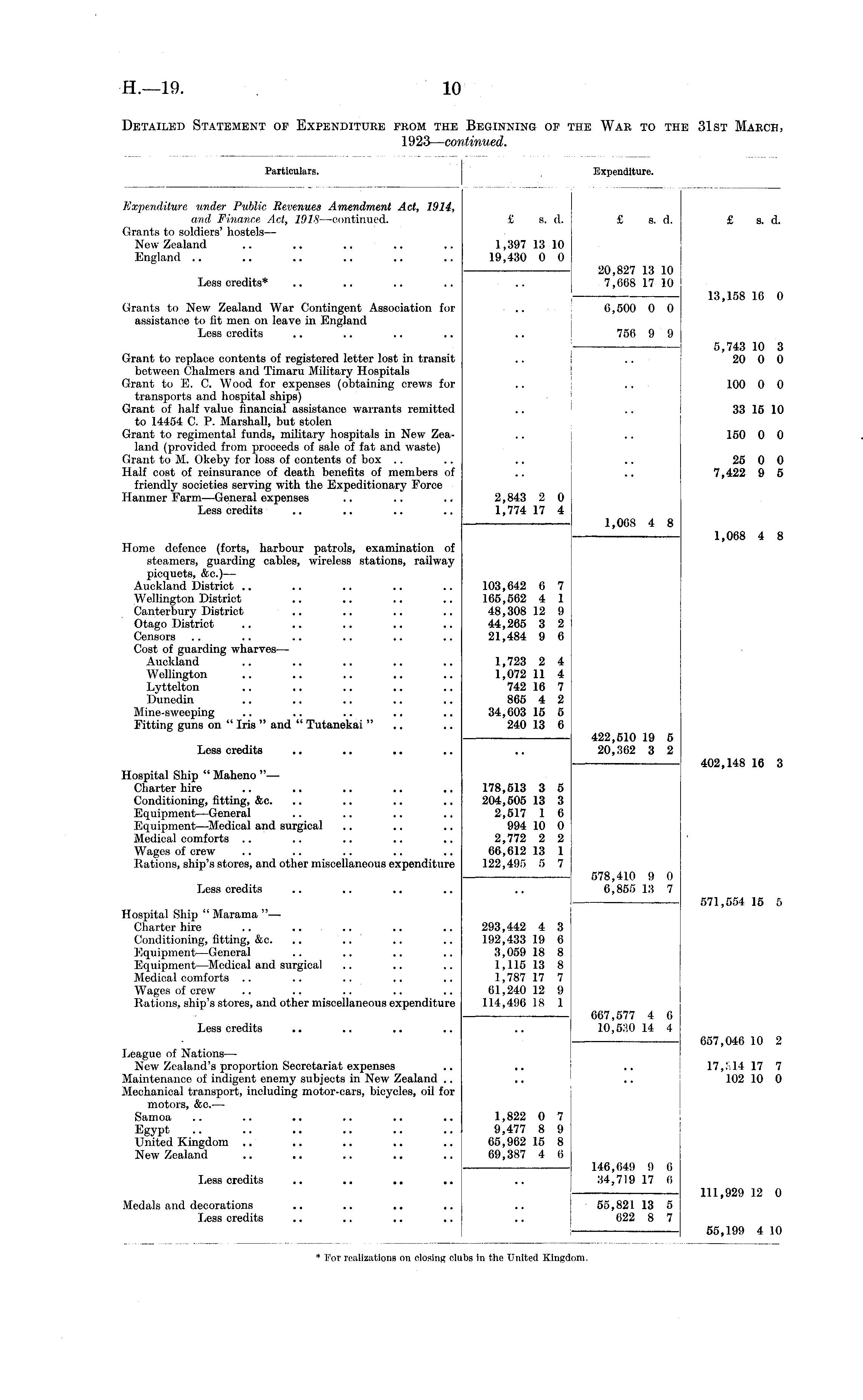 Particulars. Expenditure. Expenditure under Public Revenues Amendment Act, 1914, and Finance Act, 1918 —continued. Grants to soldiers' hostels— New Zealand England £ s. d. £ s. d. £ s. d. 1,397 13 10 19,430 0 0 20,827 13 10 7,668 17 10 Less credits* 13,158 16 0 Grants to New Zealand War Contingent Association for assistance to fit men on leave in England Less credits 6,500 0 0 756 9 9 5,743 10 3 20 0 0 Grant to replace contents of registered letter lost in transit between Chalmers and Timaru Military Hospitals Grant to E. C. Wood for expenses (obtaining crews for transports and hospital ships) Grant of half value financial assistance warrants remitted to 14454 C. P. Marshall, but stolen Grant to regimental funds, military hospitals in New Zealand (provided from proceeds of sale of fat and waste) Grant to M. Okeby for loss of contents of box Half cost of reinsurance of death benefits of members of friendly societies serving with the Expeditionary Force Hanmer Farm —General expenses Less credits 100 0 0 33 15 10 150 0 0 25 0 0 7,422 9 5 2,843 2 0 1,774 17 4 1,00S 4 8 1,068 4 8 Home defence (forts, harbour patrols, examination of steamers, guarding cables, wireless stations, railway picquets, &c.) — Auckland District Wellington District Canterbury District Otago District Censors Cost of guarding wharves— Auckland Wellington Lyttelton Dunedin Mine-sweeping Fitting guns on " Iris " and " Tutanekai " 103,642 6 7 165,562 4 1 48,308 12 9 44,265 3 2 21,484 9 6 1,723 2 4 1,072 11 4 742 16 7 865 4 2 34,603 15 5 240 13 6 Less credits 422,510 19 5 20,362 3 2 Hospital Ship " Maheno " — Charter hire Conditioning, fitting, &c. Equipment—General Equipment—Medical and surgical Medical comforts Wages of crew Rations, ship's stores, and other miscellaneous expenditure 402,148 16 3 178,513 3 5 204,505 13 3 2,517 1 6 994 10 0 2,772 2 2 66,612 13 1 .122,495 5 7 Less credits 578,410 9 0 6,855 13 7 571,554 15 5 Hospital Ship " Marama " — Charter hire .. .... Conditioning, fitting, &c. .. Equipment—General Equipment—Medical and surgical Medical comforts Wages of crew Rations, ship's stores, and other miscellaneous expenditure 293,442 4 3 192,433 19 6 3,059 18 8 1,115 13 8 1,787 17 7 61,240 12 9 114,496 18 1 Less credits 607,577 4 6 10,530 14 4 657,046 10 2 League of Nations — New Zealand's proportion Secretariat expenses Maintenance of indigent enemy subjects in New Zealand .. Mechanical transport, including motor-cars, bicycles, oil for motors, &c. — Samoa Egypt United Kingdom New Zealand 1,822 0 7 9,477 8 9 65,962 15 8 69,387 4 6 17,. 14 17 7 102 10 0 146,649 9 6 34,719 17 6 Less credits Medals and decorations Less credits 111,929 12 0 55,821 13 5 622 8 7 55,199 4 10 * For realizations on closing ell lbs in the United Klni lom.