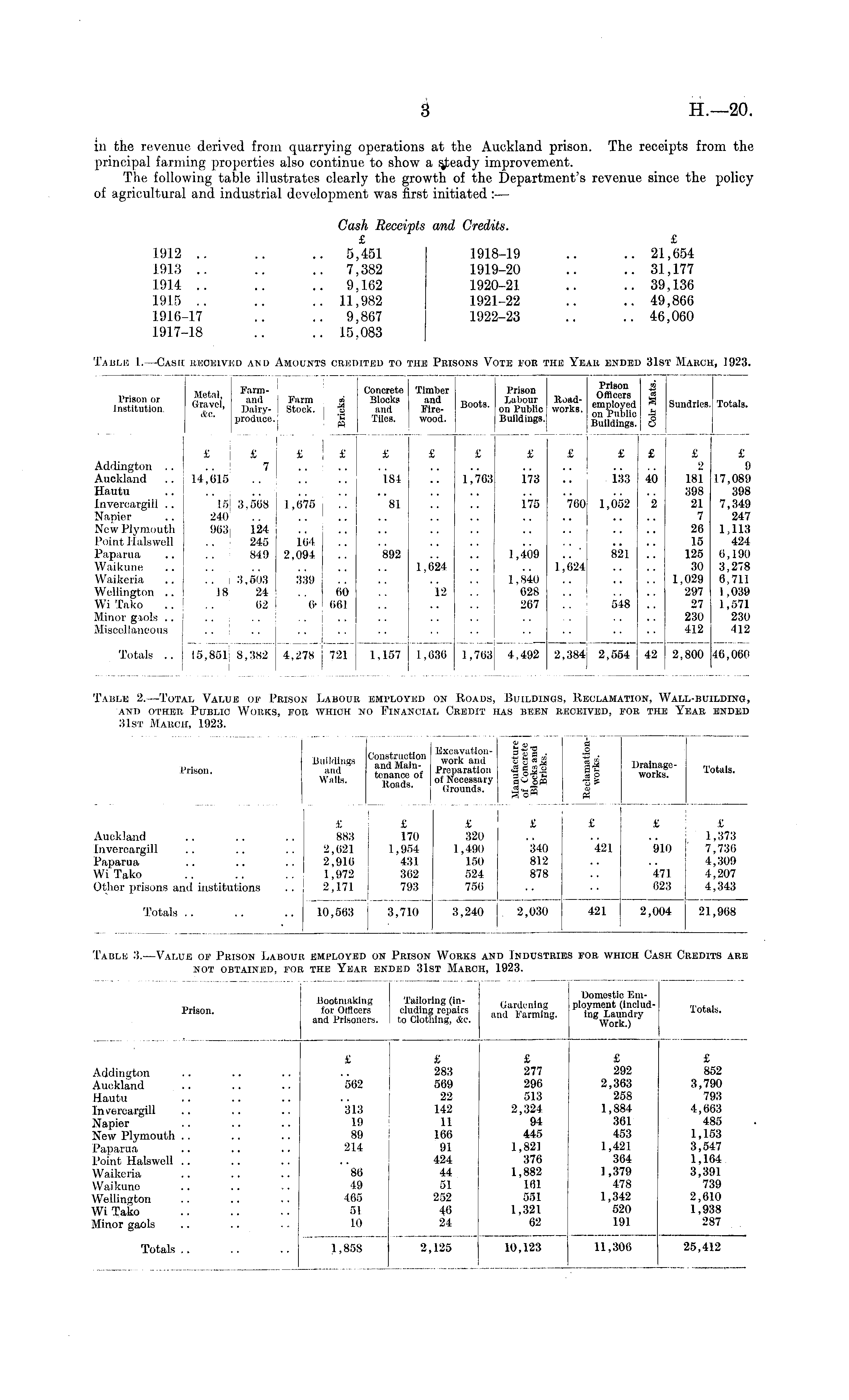 Table 3.—Value of Prison Labour employed on Prison Works and Industries for which Cash Credits are not obtained, for the Year ended 31st March, 1923.