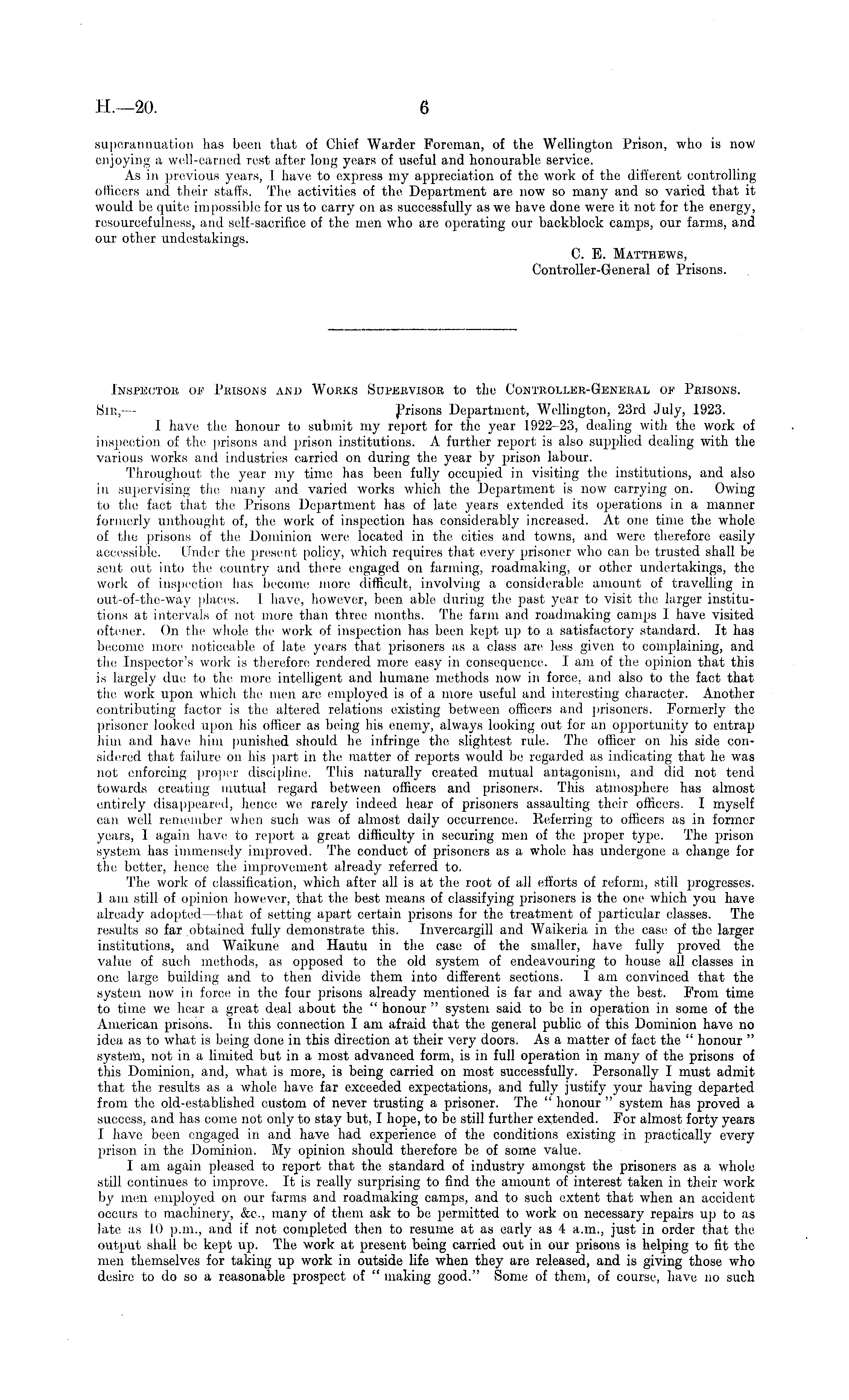 superannuation has been that of Chief Warder Foreman, of the Wellington Prison, who is now enjoying a well-earned rest after long years of useful and honourable service. As in previous years, I have to express my appreciation of the work of the different controlling officers and their staffs. The activities of the Department are now so many and so varied that it would be quite impossible for us to carry on as successfully as we have done were it not for the energy, resourcefulness, and self-sacrifice of the men who are operating our backblock camps, our farms, and our other undestakings. C. E. Matthews, Controller-General of Prisons.