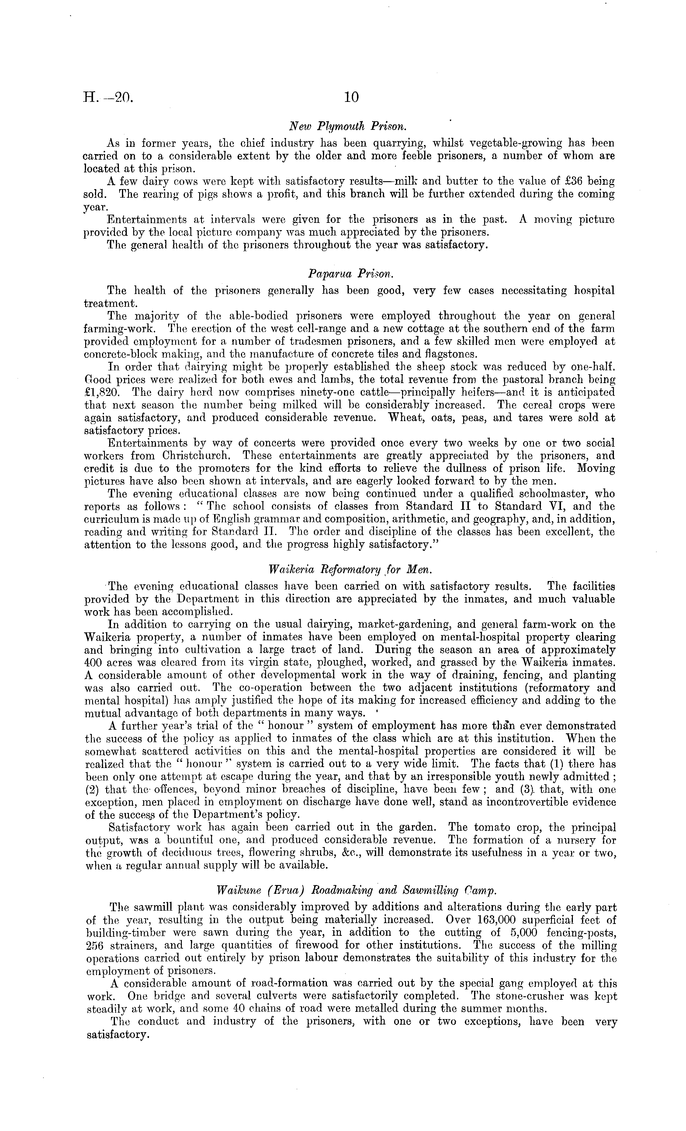 New Plymouth Prison. As in former years, the chief industry has been quarrying, whilst vegetable-growing has been carried on to a considerable extent by the older and more feeble prisoners, a number of whom are located at this prison. A few dairy cows were kept with satisfactory results —milk and butter to the value of £36 being sold. The rearing of pigs shows a profit, and this branch will be further extended during the coming year. Entertainments at intervals were given for the prisoners as in the past. A moving picture provided by the local picture company w r as much appreciated by the prisoners. The general health of the prisoners throughout the year was satisfactory. Paparua Prison. The health of the prisoners generally has been good, very few cases necessitating hospital treatment. The majority of the able-bodied prisoners were employed throughout the year on general, farming-work. The erection of the, west cell-range and. a new cottage at the southern end of the farm provided employment for a number of tradesmen prisoners, and a few skilled men were employed at concrete-block making, and the manufacture of concrete tiles and flagstones. In order that dairying might be properly established, the sheep stock was reduced \ry one-half. Good prices were realized for both ewes and lambs, the total revenue from the pastoral branch being £1,820. The dairy herd now comprises ninety-one cattle —principally heifers —and it is anticipated that next season the number being milked will be considerably increased. The cereal crops were again satisfactory, and produced considerable revenue. Wheat, oats, peas, and tares were sold at satisfactory prices. Entertainments by way of concerts were provided once every two weeks by one or two social workers from Christchurch. These entertainments are greatly appreciated by the prisoners, and credit is due to the promoters for the kind efforts to relieve the dullness of prison life. Moving pictures have also been shown at intervals, and are eagerly looked forward to by the men. The evening educational classes are now being continued under a qualified schoolmaster, who reports as follows : " The school consists of classes from Standard II to Standard VI, and the curriculum is made up of English grammar and composition, arithmetic, and geography, and, in addition, reading and writing for Standard 11. The order and discipline of the classes has been excellent, the attention to the lessons good, and. the progress highly satisfactory." Waikeria, Reformatory for Men. The evening educational classes have been carried on with satisfactory results. The facilities provided by the Department in this direction are appreciated by the inmates, and much valuable work has been accomplished. In addition to carrying on the usual dairying, market-gardening, and general farm-work on the Waikeria property, a number of inmates have been employed on mental-hospital property clearing and bringing into cultivation a large tract of land. During the season an area of approximately 400 acres was cleared from, its virgin state, ploughed, worked, and grassed by the Waikeria inmates. A considerable amount of other developmental work in the way of draining, fencing, and planting was also carried out. The co-operation between the two adjacent institutions (reformatory and mental hospital) has amply justified the hope of its making for increased efficiency and adding to the mutual advantage of both departments in many ways. ' A further year's trial of the " honour " system of employment has more than ever demonstrated the success of the policy as applied to inmates of the class which are at this institution. When the somewhat scattered activities on this and the mental-hospital properties are considered, it will be realized that the " honour " system is carried out to a very wide limit. The facts that (1) there has been, only one attempt at escape during the year, and that by an irresponsible youth newly admitted ; (2) that the- offences, beyond minor breaches of discipline, have been few ; and (3). that, with one exception, men placed in employment on. discharge have done well, stand as incontrovertible evidence of the success of the Department's policy. Satisfactory work has again been carried out in the garden. The tomato crop, the principal output, was a bountiful one, and produced considerable revenue. The formation of a nursery for the growth, of deciduous trees, flowering shrubs, &c, will demonstrate its usefulness in a year or two, when a regular annual supply will be available. Waikune (Erua) Roadmaking and Sawmilling Camp. The sawmill plant was considerably improved by additions and alterations during the early part of the year, resulting in the output being materially increased. Over 163,000 superficial feet of building-timber were sawn during the year, in addition to the cutting of 5,000 fencing-posts, 256 strainers, and large quantities of firewood for other institutions. The success of the milling operations carried out entirely by prison labour demonstrates the suitability of this industry for the employment of prisoners. A considerable amount of road-formation was carried out by the special gang employed at this work. One bridge and several culverts were satisfactorily completed. The stone-crusher was kept steadily at work, and some 40 chains of road were metalled during the summer months. The conduct and industry of the prisoners, with one or two exceptions, have been very satisfactory.