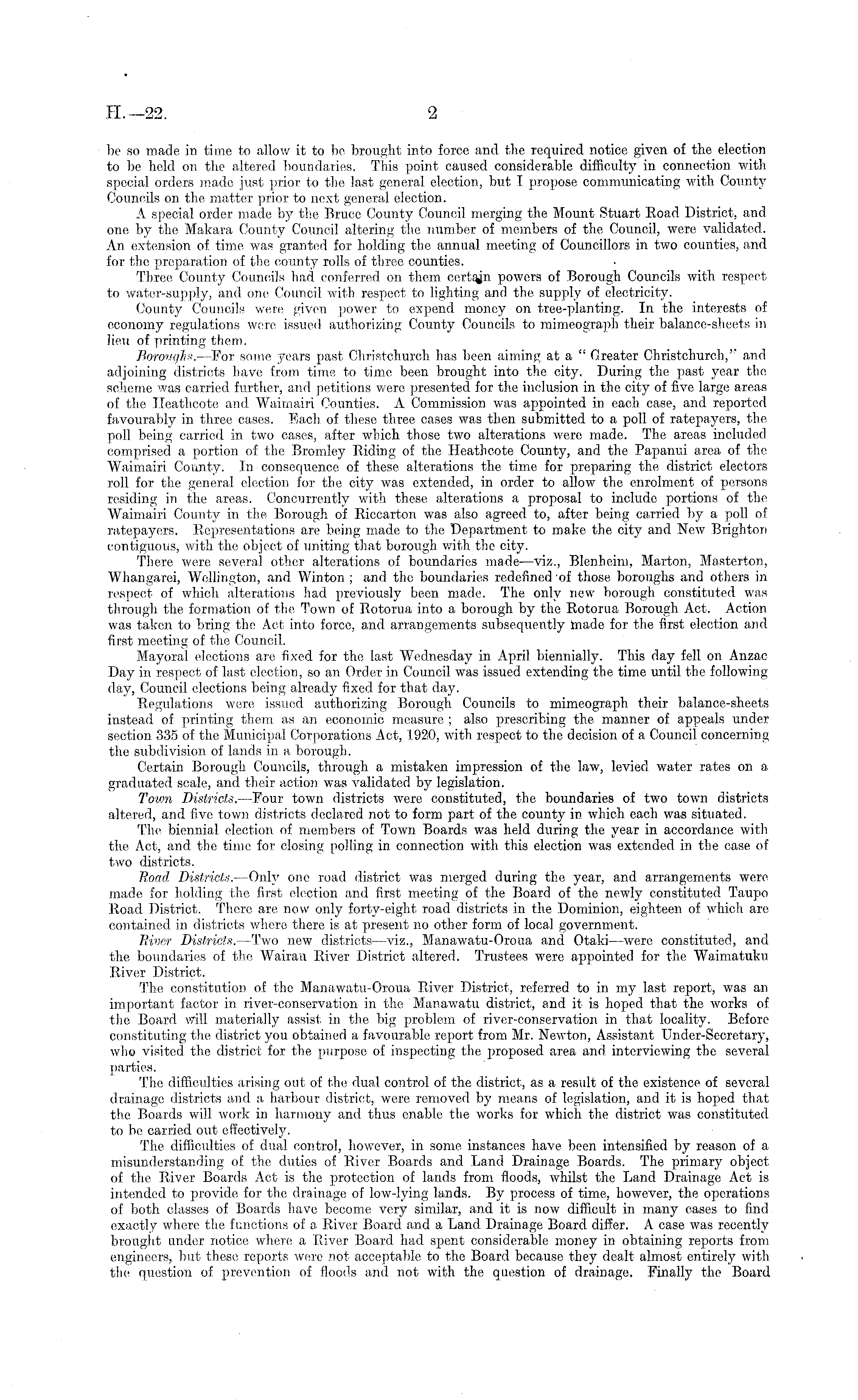 be so made in time to allow it to be brought into force and the required notice given of the election to be held on the altered boundaries. This point caused considerable difficulty in connection with special orders made just prior to the last general election, but I propose communicating with County Councils on the matter prior to next general election. A special order made by the Bruce County Council merging the Mount Stuart Eoad District, and one by the Makara County Council altering the number of members of the Council, were validated. An extension of time was granted for holding the annual meeting of Councillors in two counties, and for the preparation of the county rolls of three counties. Three County Councils had conferred on them cert-yn powers of Borough Councils with respect to water-supply, and one Council with respect to lighting and the supply of electricity. County Councils were given power to expend money on tree-planting. In the interests of economy regulations were issued authorizing County Councils to mimeograph their balance-sheets in lieu of printing them. Boroughs. —For some years past Christchurch has been aiming at a " Greater Christcliurch,'"' and adjoining districts have from time to time been brought into the city. During the past year the scheme was carried further, and petitions were presented for the inclusion in the city of five large areas of the Heathcote and Waimairi Counties. A Commission was appointed in each case, and reported favourably in three cases. Each, of these three cases was then submitted to a poll of ratepayers, the poll being carried in two cases, after which those two alterations were made. The areas included comprised a portion of the Bromley Riding of the Heathcote County, and the Papanui area of the Waimairi County. In consequence of these alterations the time for preparing the district electors roll for the general election for the city was extended, in order to allow the enrolment of persons residing in the areas. Concurrently with these alterations a proposal to include portions of the Waimairi County in the Borough of Riccarton was also agreed to, after being carried by a poll of ratepayers. Representations are being made to the Department to make the city and New Brighton contiguous, with the, object of uniting that borough with the city. There were several other alterations of boundaries made—viz., Blenheim, Marton, Masterton, Whangarei, Wellington, and Winton ; and the boundaries redefined 'of those boroughs and others in respect of which alterations had previously been made. The only new borough constituted was through the formation of the Town of Rotorua into a borough by the Rotorua Borough Act. Action was taken to bring the Act into force, and arrangements subsequently made for the first election and first meeting of the Council. Mayoral elections are fixed for the last Wednesday in April biennially. This day fell on Anzac Day in respect of last election, so an Order in Council was issued extending the time until the following day, Council elections being already fixed, for that day. Regulations were issued authorizing Borough Councils to mimeograph their balance-sheets instead of printing them as an economic measure ; also prescribing the, manner of appeals under section. 335 of the Municipal Corporations Act, 1920, with respect to the decision of a Council concerning the subdivision of lands in a borough. Certain Borough Councils, through a mistaken impression of the law, levied water rates on a graduated scale, and their action was validated by legislation. Town Districts. —Four town districts were constituted, the boundaries of two town districts altered, and five town districts declared not to form part of the county in which each was situated. The biennial election of members of Town Boards was held during the year in accordance with the Act, and the time for closing polling in connection with this election was extended in the case of two districts. Road Districts. —Only one road district was merged during the year, and arrangements were, made for holding the first election and first meeting of the Board of the newly constituted Taupo Road District. There are now only forty-eight road districts in the Dominion, eighteen of which are contained in districts where there is at present no other form of local government. River Districts. —Two new districts —viz., Manawatu-Oroua and Otaki—were constituted, and the boundaries of the Wairau River District altered. Trustees were appointed for the Waimatuku River District. The constitution of the Manawatu-Oroua River District, referred to in my last report, was an important factor in river-conservation in the Manawatu district, and it is hoped that the works of the Board will materially assist in the big problem of river-conservation in that locality. Before constituting the, district you obtained a favourable report from Mr. Newton, Assistant Under-Secretary, who visited the district for the purpose of inspecting the proposed area and, interviewing the several parties. The difficulties arising out of the dual control of the district, as a result of the existence of several drainage districts and a harbour district, were removed by means of legislation, and it is hoped that the Boards will work in harmony and thus enable the works for which the district was constituted to be carried out effectively. The, difficulties of dual control, however, in some instances have been intensified by reason of a misunderstanding of the duties of River Boards and Land Drainage Boards. The primary object of the River Boards Act is the protection of lands from floods, whilst the Land Drainage Act is intended to provide for the drainage of low-lying lands. By process of time, however, the operations of both classes of Boards have become very similar, and it is now difficult in many cases to find exactly where the functions of a- River Board and a Land Drainage Board differ. A case was 