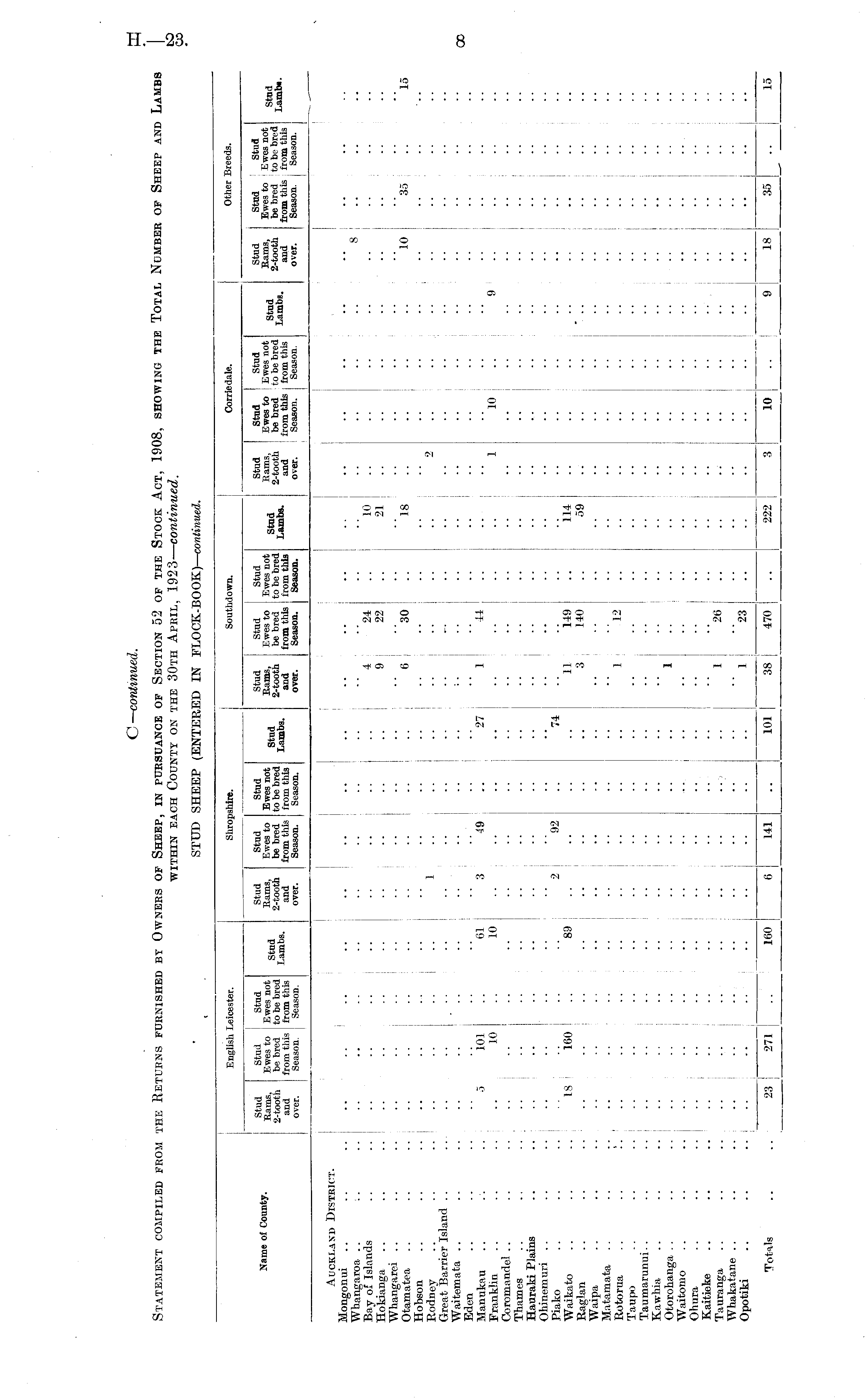 C— continued. Statement compiled from the Returns furnished by Owners of Sheep, in pursuance of Section 52 of the Stock Act, 1908, showing the Total Number of Sheep and Lambs within each County on the 30th April, 1923— continued. STUD SHEEP (ENTERED IN FLOCK-BOOK)— continued.