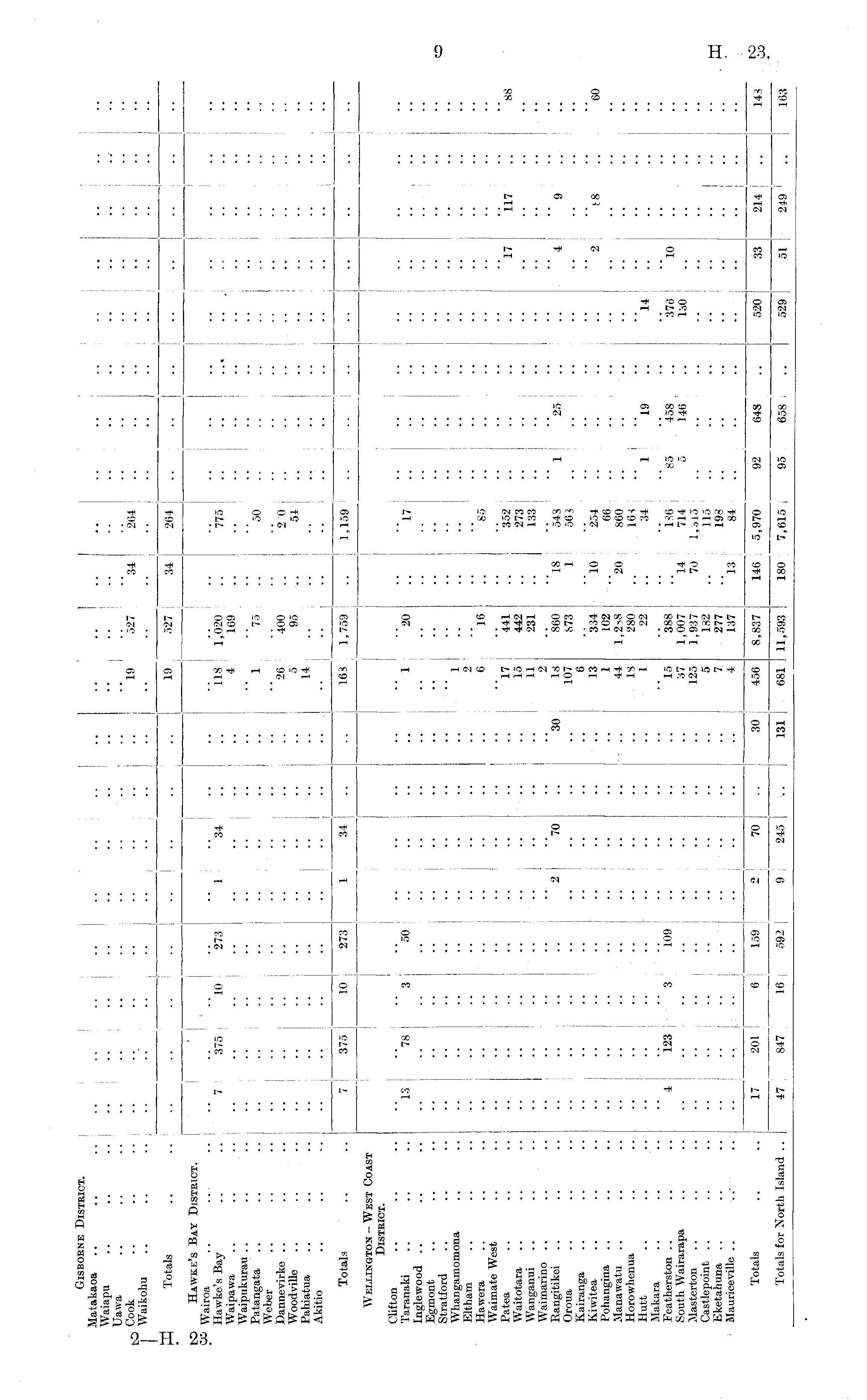 Gisborne District. Matakaoa Waiapu Uawa .. .. Cook Waikohu I I 19 527 "34 264 j • • Totals lit 527 34 264 „ . - _ 7 375 10 273 1 34 ' Hawke's Bay District. Wairoa Hawke's Bay Waipawa Waipukurau Patangata Weber Dannevirke .. .. Woodville .. .. Pahiatua Akitio 7 375 5 10 0 27a 3 1 1 34 i I 118 4 "A 1,020 169 75 775 50 . . • " i "26 5 14 i 400 95 2'0 j 54 j I [ I I I Totals .. ..| 7 7 37; 375 5 K 10 o 27; 273 3 1 34 34 163 1,759 1,159 Wellington - West Coast District. — 1 "20 Clifton Taranaki Inglewood Egmont Stratford Whangamomona Eltham Hawera Waimate West Patea Waitotara Wanganui Waimarino Rangitikei Oroua Kairanga Kiwitea Pohangina Manawatu Horowhenua Hutt Makara Featherston South Wairarapa Masterton Castlepoint Eketahuna Mauriceville .. ..- 13 4 "l3 7? 12; 78 8 :3 3 3 3 io, 1 "50 SO )9 " 2 2 70 70 "30 •• 1 2 6 17 15 11 2 18 107 6 13 1 44 IS 1 16 441 442 231 860 873 334 102 1,2 5 8 280 22 "l8 1 17 85 '352 273 133 543 563 1 " "25 17 4 117 9 88 ' 4 123 3 109 15 37 125 5 7 4 388 1,007 1,937 182 277 137 10 "20 14 70 13 254 66 860 163 34 'ise 714 1,315 115 193 84 1 j 85 19 458 146 14 376 130 2 10 "tS I I "oo " " " •- •• - Totals 17 17 201 201 :1 (i 6 15. 159 .9 o •i 70 70 30 456 8,837 146 5,970 92 648 520 i 33 214 j 143 " Totals for North Island .. 47 847 7 It 6 59h 592 | 12 I 9 245 | -- 131 i 11,593 ! 47 847 16 9 245 681 180 7,615 I 95 658 1 529 51 249 '' 163