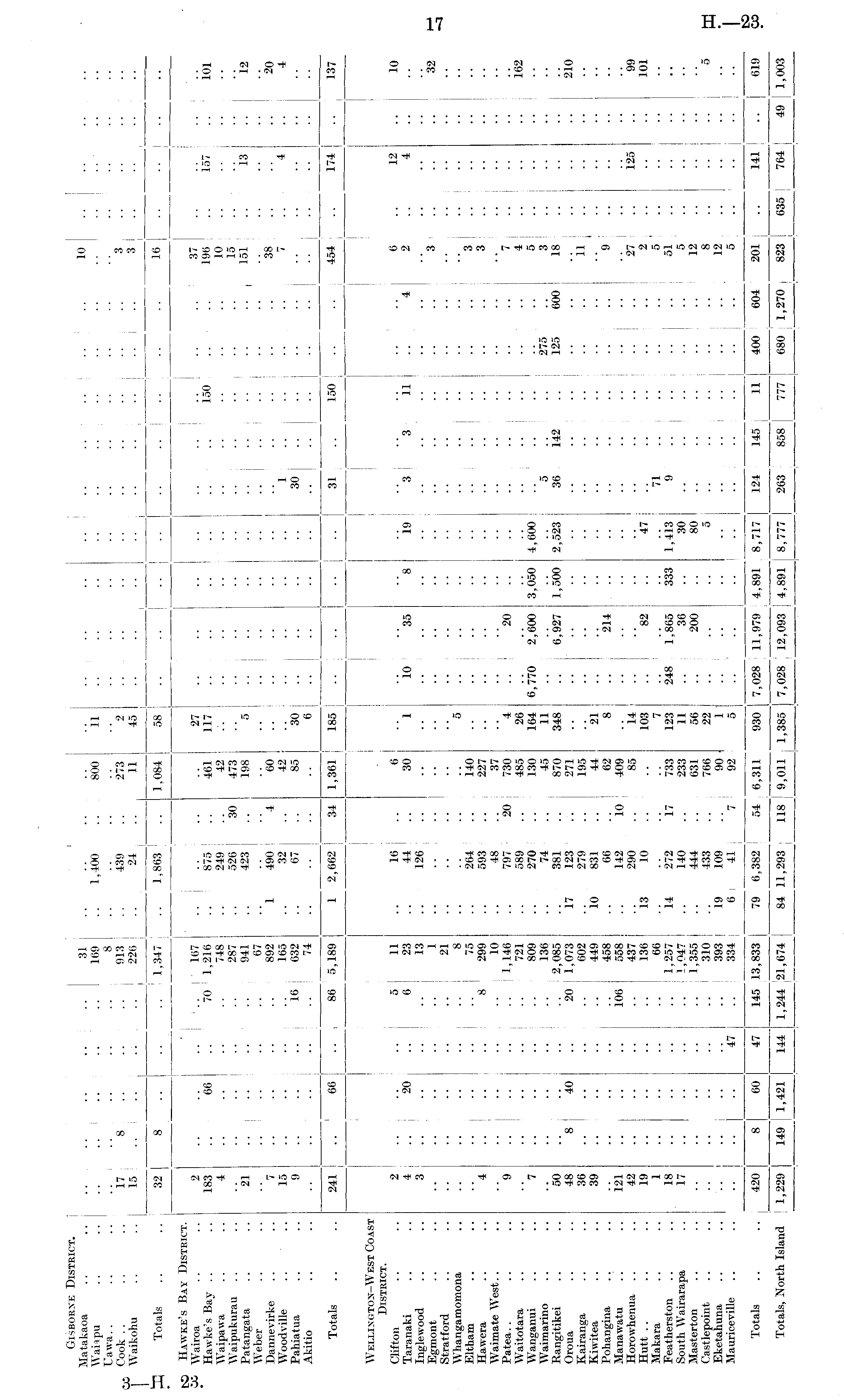Gisborne District. Matakaoa Waiapu Uawa Cook Waikohu I 10 17 15 8 j •"■ 31 169 8 913 226 1,400 439 24 800 273 11 ii 2 45 1 I 1 " Totals 32 i 1,347 1,863 1,084 | 58 16 Hawke's Bay District. Wairoa Hawke's Bay Waipawa Waipukurau Patangata Weber Dannevirke Woodville Pahiatua Akitio 2 183 4 21 66 • 167 70 '■ 1,216 748 287 941 67 892 165 16 ! 632 74 875 249 526 423 30 461 42 473 198 60 42 85 27 117 5 30 6 I 150 37 196 10 15 151 157 i3 ioi 12 1 7 15 9 1 490 ! 32 67 4 1 30 38 7 4 20 4 Totals 241 66 86 5,189 1 2,662 34 1,361 185 31 150 ! 454 174 137 I Wellington-West Coast District. Clifton Taranaki Inglewood Egmont Stratford Whangamomona Eltham Hawera Waimate West.. Patea Waitotara Wanganui Waimarino Rangitikei Oroua Kairanga Kiwitea Pohangina Manawatu Horowhenua Hutt Makara Featherston South Wairarapa Masterton Castlepoint Eketahuna Mauriceville 2 4 3 4 9 7 50 48 36 39 8 20 40 47 5 11 6 23 13 21 8 75 8 299 10 .. : 1,146 721 809 136 .. : 2,085 20 ! 1,073 602 449 458 106 558 437 136 66 1,257 1,047 " L355 310 393 334 17 io i3 16 44 126 264 593 48 797 589 270 74 381 123 279 831 66 142 290 10 20 io 6 30 140 227 37 730 485 130 45 870 271 195 44 62 409 85 i 5 4 26 164 11 348 io " .. •■ " 6,770 35 "20 6,927 8 3,050 1,500 io 4,600 2,523 3 5 36 71 9 3 142 11 " .. .. 275 125 4 -• 600 6 2 3 3 3 7 4 5 3 18 ii j 9 '27 2 5 51 5 12 8 12 5 12 4 125 10 32 162 210 •• •• 21 8 214 121 42 19 18 17 14 103 7 123 11 56 22 1 248 "82 1,865 36 200 47 99 101 14 19 6 272 140 444 433 109 41 17 7 I 733 233 631 766 90 92 333 1,413 30 80 5 0 Totals _ 420 8 60 47 145 13,833 79 6,382 54 j 6,311 930 7,028 11,979 4,891 8,717 124 145 11 " 400 604 201 141 619 ' Totals, North Island 1,229 149 1,421 1,244 21,674 84 11,293 118 9,011 : 1,385 7,028 12,093 | 4,891 8,777 263 858 777 680 1,270 j 823 I 635 764 49 1,003 144