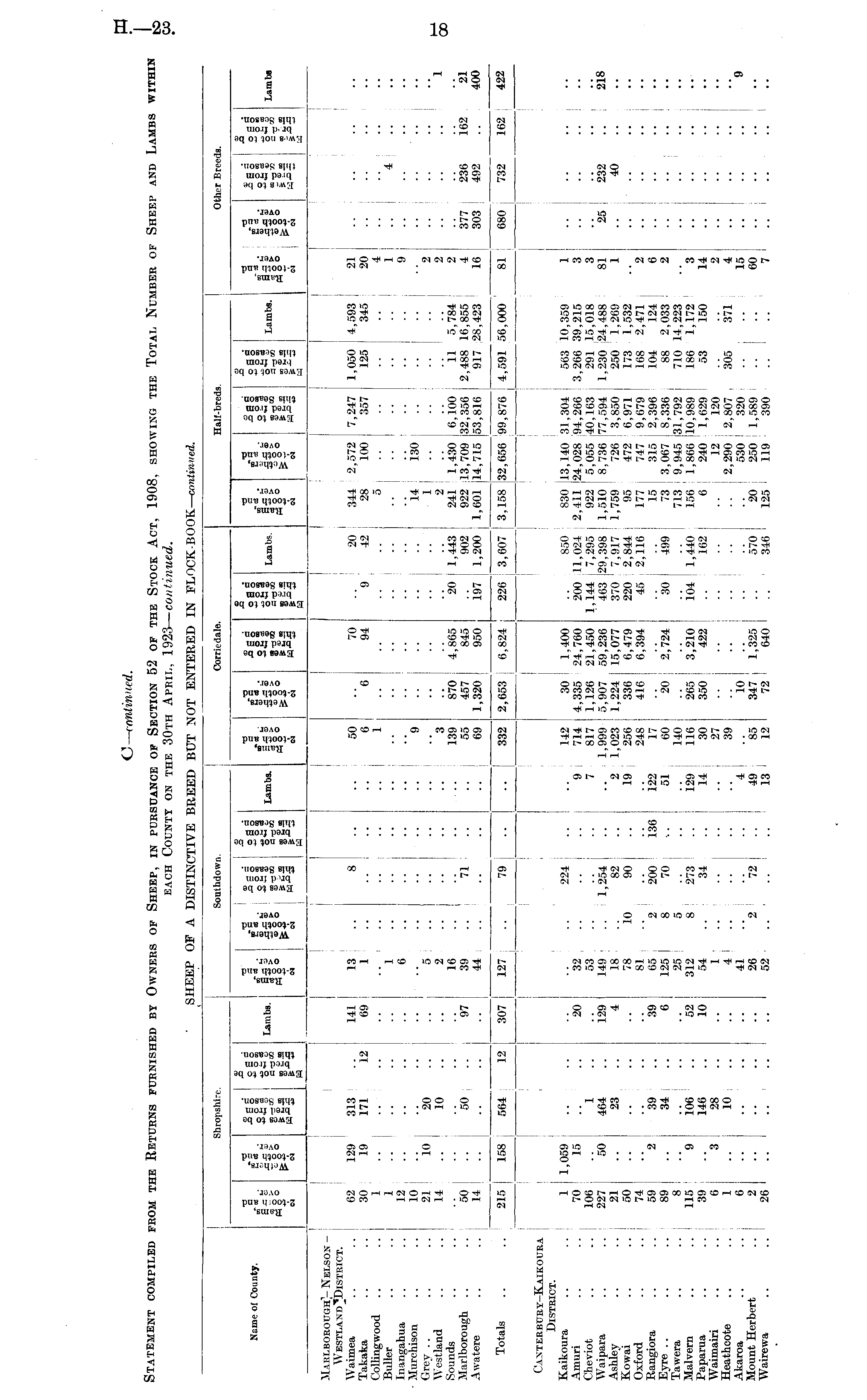 C— continued. Statement compiled from the Returns furnished by Owners of Sheep, in pursuance of Section 52 of the Stock Act, 1908, showing the Total Number of Sheep and Lambs within each County on the 30th April, 1923— continued. SHEEP OF A DISTINCTIVE BREED BUT NOT ENTERED IN FLOCK-BOOK— continued.