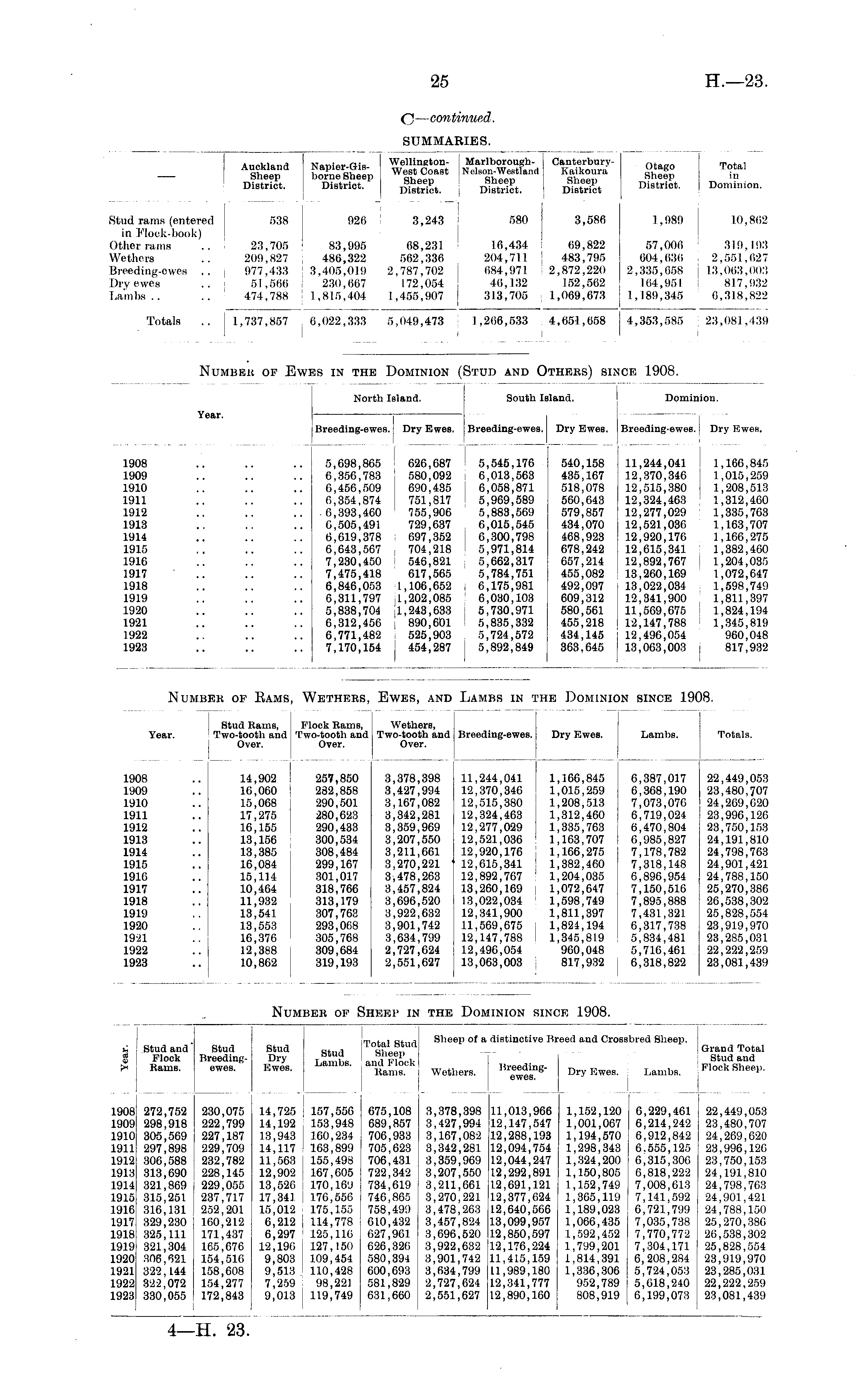Year. Stud Rams, Two-tooth and Over. Flock Rams, Two-tooth and Over. Wethers, Two-tooth and Over. Breeding-ewes. Dry Ewes. Lambs. Totals. 1908 1909 1910 1911 1912 1913 1914 1915 1916 1917 1918 1919 1920 19-21 1922 1923 14,902 16,060 15,068 17,275 16,155 13,156 13,385 16,084 15,114 10,464 11,932 13,541 13,553 16,376 12,388 10,862 257,850 282,858 290,501 280,623 290,433 300,534 308,484 299,167 301,017 318,766 313,179 307,763 293,068 305,768 309,684 319,193 3,378,398 3,427,994 3,167,082 3,342,281 3,359,969 3,207,550 3,211,661 3,270,221 3,478,263 3,457,824 3,696,520 3,922,632 3,901,742 3,634,799 2,727,624 2,551,627 11,244,041 12,370,346 12,515,380 12,324,463 12,277,029 12,521,036 12,920,176 12,615,341 12,892,767 13,260,169 13,022,034 12,341,900 11,569,675 12,147,788 12,496,054 13,063,003 1,166,845 1,015,259 1,208,513 1,312,460 1,335,763 1,163,707 1,166,275 1,382,460 1,204,035 1,072,647 1,598,749 1,811,397 1,824,194 1,345,819 960,048 817,932 6,387,017 6,368,190 7,073,076 6,719,024 6,470,804 6,985,827 7,178,782 7,318,148 6,896,954 7,150,516 7,895,888 7,431,321 6,317,738 5,834,481 5,716,461 6,318,822 22,449,053 23,480,707 24,269,020 23,996,126 23,750,153 24,191,810 24,798,763 24,901,421 24,788,150 25,270,386 26,538,302 25,828,554 23,919,970 23,285,031 22,222,259 23,081,439