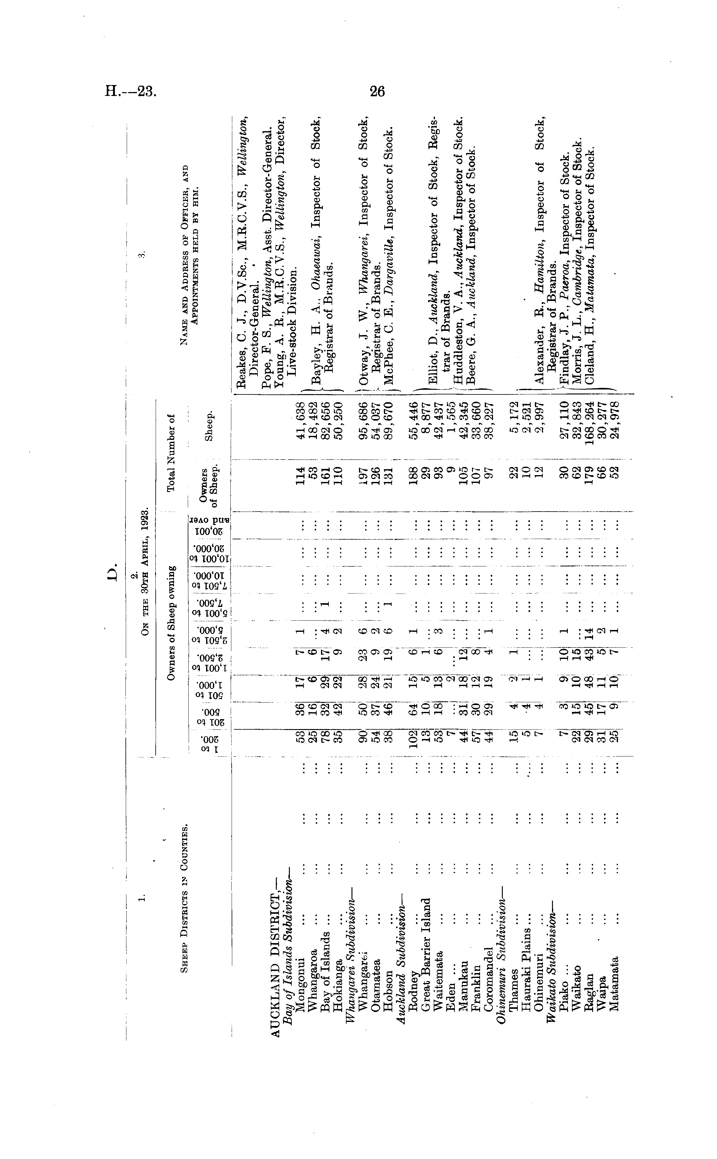 o 1. 2. On the 30th Apbil, 1923. 2. On the 30th April, 1923. 3. *.U*J _ *m— — ■ ., .V..U. t Owners of Sheep owning Total Number of Owners of Sheep owning Sheep Districts in Counties. o -! -S _• " 2 ° Z. 2 ho <=> iX Ownprs ug ** o _, O HO HO-rtO |rtg So 0° uwuerb CThperi oho S ° oiooo oroo°- r-__ n t qr.. m sneep. -Hcqoro St o „- io »o °-o o "a oi &neep. Name and Address of Officer, and Appointments held by him. AUCKLAND DISTRICT,— Bay of Islands Subdivision — Mongonui Whangaroa Bay of Islands ... Hokianga Whangarei Subdivision — Whangarei Otamatea Hobson Auckland Subdivision — Eodney Great Barrier Island Waitemata Eden ... Manukau Franklin Coromandel Ohinemuri Subdivision — Thames Hauraki Plains ... Ohinemuri Waikato Subdivision — Piako ... Waikato Eaglan Waipa Matamata Be. I Poi Yoi ... 53 36 17 7 1 114 41,638 , ... 25 161 6 6 I 53 18,482 Ba ... 78 32 29 17 4 1 161 82,656 f - 35 421 22 9 2 110 50,250 ) ... 90 50 28 23 6 197 95,686 ) Ot ... 54 37 24 9 2 126 54,037 ; - ] ... 38 46J 21 19 6 1 131 89,670 j Mc ... 102 64 1 15 6 1 188 55,446 r ... 13 10 5 l| ... 29 8,877 _ v ... 53 181 13 6 3 93 42,437 \ m 7 2 9 1 565 ■ 1 '.'.'. 44 31 18J 12 ... 105 ;? 1 ... 57j 30 121 8 107 33,660 \ ae ... 44i 29 19 4 1 97 38,227 ! ... 15 4 2 1 22 5,172 . 5 4 1 10 2,521 7! 4 1 12 2,997 Al 71 3 9 10 1 30 27,110 >Fii ... 221 15 10' 15 62 32,843 M< ... 29| 45 48 43 14 179 168,264 Cl< ... 31 17 11 5 2 66 30,277 ... 25! 9 10; 7 1 52 24,978 ' Eeakes, C. J., D.V.Sc, M.B.C.V.S., Wellington, Director-General. Pope, F. S., Wellington, Asst. Director-General. Young, A. E., M.B.C.V.S., Wellington, Director, Live-stock Division. 1 Bayley, H. A.. Ohaeawai, Inspector of Stock, Eegistrar of Brands. j Otway, J. W., Whangarei, Inspector of Stock, Eegistrar of Brands. I McPhee, C. E., Dargaville, Inspector of Stock. Elliot, D., Auckland, Inspector of Stock, Eegistrar of Brands. Huddleston, V. A., Auckland, Inspector of Stock, j Beere, G. A., Auckland, Inspector of Stock. akes, C. J., D.V.Sc, M.E.C.V.S., Wei Director-General. pe, F. S., Wellington, Asst. Director-Ge mng, A. E., M.E.C.V.S., Wellington, I Live-stock Division. ayley, H. A.. Ohaeawai, Inspector of Eegistrar of Brands. tway, J. W., Whangarei, Inspector of Eegistrar of Brands. cPhee, C. E., Dargaville, Inspector of ! lliot, D., Auckland, Inspector of Stock, trar of Brands. uddleston, V. A., Auckland, Inspector o eere, G. A., Auckland, Inspector of Stoc lexander, E., Hamilton, Inspector of Eegistrar of Brands, indlay, J. P., Paeroa, Inspector of Stocl 'orris, J. L., Cambridge, Inspector of Sti leland, H., Matamata, Inspector of Stoc llingtt sneral Direct f Stoi f Stoi Stock :, Ee-s )f Stock. Stoi k. ;ock. ck. i Alexander, E., Hamilton, Inspector of Stock, Eegistrar of Brands. "Findlay, J. P., Paeroa, Inspector of Stock. Morris, J. L., Cambridge, Inspector of Stock. Cleland, H., Matamata, Inspector of Stock. I
