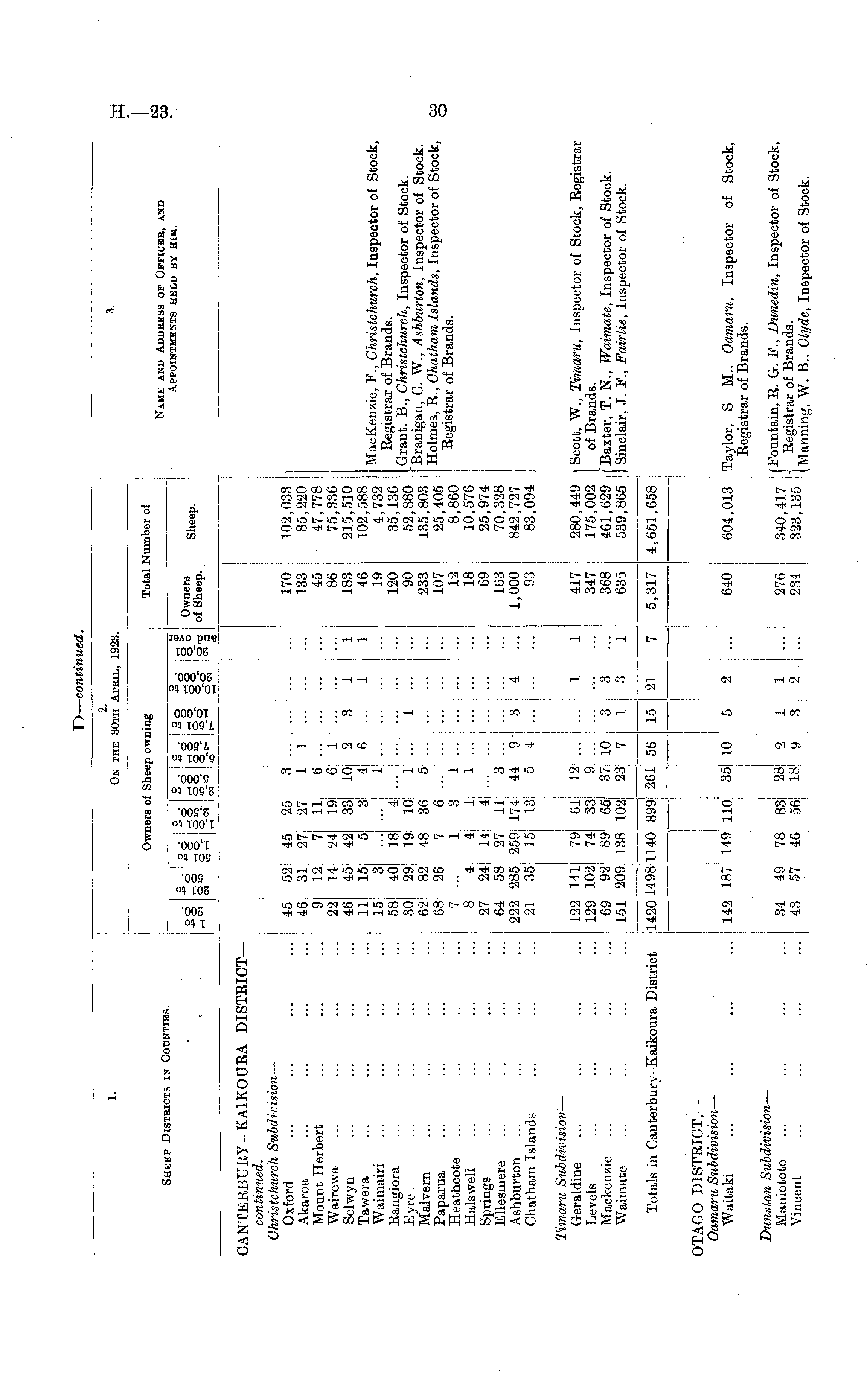 2. 1. On the 30th April, 1923. On the 30th April, 1923. 3. Sheep Districts in Counties. rr m «««., ~t av. rtrt « nnr »; nn r\r„ Owners of Sheep owning Total Nrj i io jo o !°o -2- rt • oo -d 5g -g H | :§ ~g gS S S Owners S§g§ g 8- gS g» g d 8g. o-ro of Sheep. Owners of Sheep owning — Total Number of i umber of Sheep. Name and Address of Officer, and Appointments held by him. CANTERBURY -KAIKOURA DISTRICT— continued. Christehurch Subdivision — Oxford ... ... ... ... 45 52' Akaroa ... ... ... ... 46 31: Mount Herbert ... ... ... 9 12 Wairewa ... ... ... ... 22 14 Selwyn ... ... ... ... 46 45: Tawera ... ... ... ... 11 15| Waimairi ... ... ... ... 15 3; Rangiora ... ... ... ... 58 40 Eyre ... ... ... ... 30 29 Malvern ... ... ... ... 62 82 Paparua ... ... ... ... 68 26 Heathcote ... ... ... ... 7 ... Halswell ... ... ... ... 8 4 Springs ... ... ... ... 27 24 Ellesmere ... . . ... ... 64 58 Ashburton ... ... ... ... 222 285 Chatham Islands ... ... ... 21 35 45 27 7 24 42 5 18 19 48 7 1 4 14 27 259 15 45 27 7 24 42 5 18 19 48 7 1 4 14 27 159 15 25 3 27 1 1 11 6 19 6 1 33 10 2 3 1 3 4 6 ... 1 ... ! 1 4 10 1 ... 1 - 36 5 6 3 1 1 1 4 11 3 174 44 9' 3 4 13 5! 4 ... j ... 3 1 1 4 1 1 1 1 i 170 133 45 86 183 46 19 120 90 233 107 12 18 69 163 1,000 93 170 133 45 86 183 46 19 120 90 233 107 12 18 69 163 1,000 93 102,033 h 85,220 47,778 75,336 215,510 | 4* 732 MacKenzie, F., Christehurch, Inspector of Stock, 35' 136 Registrar of Brands. 52 880 Grant, B., Christehurch, Inspector of Stock. 135* 803 Branigan, C. W., Ashburton, Inspector of Stock. 25'405 Holmes, R., Chatham Islands, Inspector of Stock, 8'860 Registrar of Brands. 10|576 25,974 70,328 842,727 83,094 Timaru Subdivision — Geraldine ... ... ... ... 122 141 Levels ... ... ... ... 129 102 Mackenzie ... ... ... ... 69 92 Waimate ... ... ... ... 151 209 Totals in Canterbury-Kaikoura District 1420|1498 OTAGO DISTRICT — Oamaru Subdivision — Waitaki ... ... ... ... 142 187 141 102 92 209 79 74 89 138 79 74 89 38 40 61 12 1 33 9 65 37 10 3 3 102; 23 7 1 3 899 261 56 15 21 3 1 1 3 3 1 1 7 j1 1 417 347 368 635 5,317 417 347 368 635 280,449 \\ Scott, W., Timaru, Inspector of Stock, Registrar 175,002 j of Brands. 461,629 i Baxter, T. N., Waimate, Inspector of Stock. 539,865 I Sinclair, J. F., Fairlie, Inspector of Stock. ;— !l498 1140 15 5 : 21 21 7 I 7 5,317 5,317 4,651,658 i 187 149: 49 78 46 110 35 10 5 2 83 28. 2 11 56 18 9 3 2 5 1 3 2 1 2 640 276 234 640 276 234 604,013 Taylor, S M., Oamaru, Inspector of Stock, Registrar of Brands. 340 417 f^ ouatiam ' R- Gk F-, Dunedin, Inspector of Stock, 000' i« N Registrar of Brands. ' (Manning, W. B., Clyde, Inspector of Stock. Duns tan Subdivision — Maniototo ... ... ... ... 34 49 Vincent ... ... ... ... 43 57 4<» 57