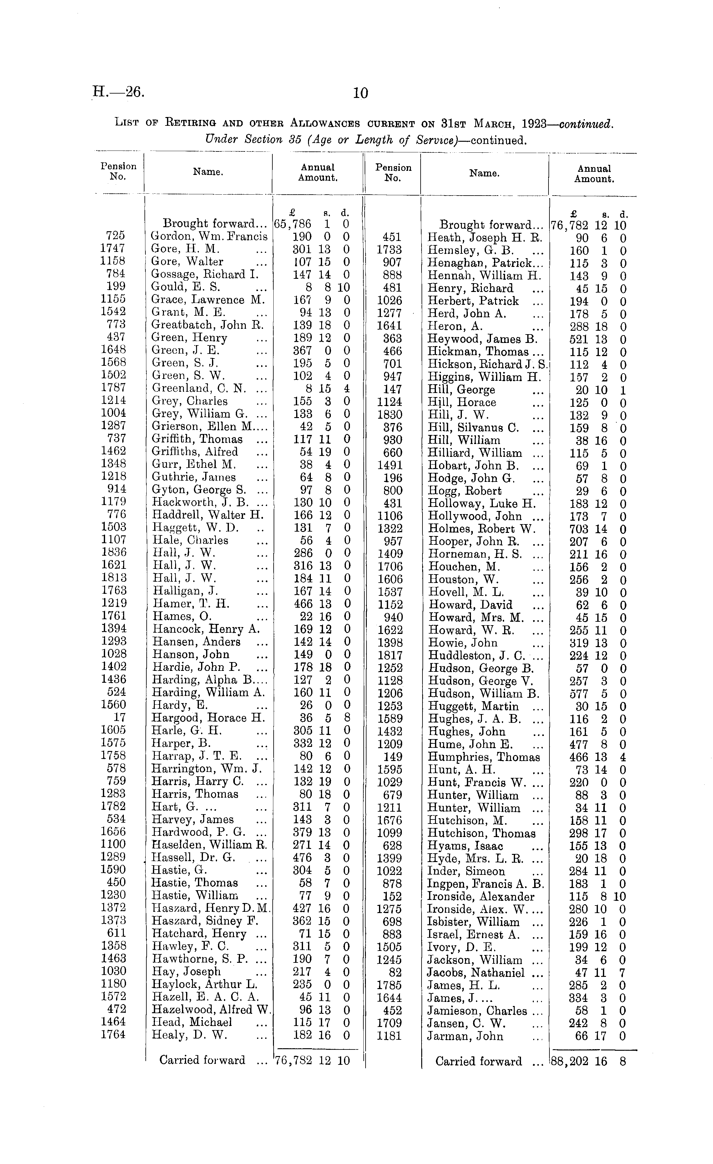Pension No. Name. Annual Amount. Pension No. Name. Annual Amount. 725 1747 1158 784 199 1155 1542 773 437 1648 1568 1502 1787 1214 1004 1287 737 1462 1348 1218 914 1179 776 1503 1107 1836 1621 1813 1763 1219 1761 1394 1293 1028 1402 1436 524 1560 17 1605 1575 1758 578 759 1283 1782 534 1656 1100 1289 1590 450 1230 1372 1373 611 1358 1463 1030 1180 1572 472 1464 1764 Brought forward... Gordon, Wm. Francis Gore, H. M. Gore, Walter Gossage, Richard I. Gould, E. S. Grace, Lawrence M. Grant, M. E. Greatbatch, John R. Green, Henry Green, J. E. Green, S. J. Green, S. W. Greenland, C. N. ... Grey, Charles Grey, William G. ... Grierson, Ellen M.... Griffith, Thomas ... Griffiths, Alfred ... Gurr, Ethel M, Guthrie, James Gyton, George S. ... Hackworth, J. B. ... Haddrell, Walter H. Haggett, W. D. .. Hale, Charles Hall, J. W. Hall, J. W. Hall, J. W. Halligan, J. Hamer, T. H. Hames, 0. Hancock, Henry A. Hansen, Anders Hanson, John Hardie, John P. Harding, Alpha B.... Harding, William A. Hardy, E. Hargood, Horace H. Harle, G. H. Harper, B. Harrap, J. T. E. ... Harrington, Wm. J. Harris, Harry C. ... Harris, Thomas Hart, G. ... Harvey, James Hardwood, P. G. ... Haselden, William R. Hassell, Dr. G. .... Hastie, G. Hastie, Thomas Hastie, William Haszard, Henry D.M. Haszard, Sidney F. Hatchard, Henry ... Hawley, F. C. Hawthorne, S. P. ... Hay, Joseph Haylock, Arthur L. Hazell, E. A. C. A. Hazelwood, Alfred W. Head, Michael Healy, D. W. £ a. d. 65,786 1 0 190 0 0 301 13 0 107 15 0 147 14 0 8 8 10 167 9 0 94 13 0 139 18 0 189 12 0 367 0 0 195 5 0 102 4 0 8 15 4 155 3 0 133 6 0 42 5 0 117 11 0 54 19 0 38 4 0 64 8 0 97 8 0 130 10 0 166 12 0 131 7 0 56 4 0 286 0 0 316 13 0 184 11 0 167 14 0 466 13 0 22 16 0 169 12 0 142 14 0 149 0 0 178 18 0 127 2 0 160 11 0 26 0 0 36 5 8 305 11 0 332 12 0 80 6 0 142 12 0 132 19 0 80 18 0 311 7 0 143 3 0 379 13 0 271 14 0 476 3 0 304 5 0 58 7 0 77 9 0 427 16 0 362 15 0 71 15 0 311 5 0 190 7 0 217 4 0 235 0 0 45 11 0 96 13 0 115 17 0 182 16 0 451 1733 907 888 481 1026 1277 1641 363 466 701 947 147 1124 1830 376 930 660 1491 196 800 431 1106 1322 957 1409 1706 1606 1537 1152 940 1622 1398 1817 1252 1128 1206 1253 1589 1432 1209 149 1595 1029 679 1211 1676 1099 628 1399 1022 878 152 1275 698 883 1505 1245 82 1785 1644 452 1709 1181 Brought forward... Heath, Joseph H. R. Hemsley, G. B. Henaghan, Patrick... Hennah, William H. Henry, Richard Herbert, Patrick ... Herd, John A. Heron, A. Heywood, James B. Hickman, Thomas ... Hickson, Richard J. S. Higgins, William H. Hill, George Hill, Horace Hill, J. W. Hill, Silvanus C. ... Hill, William Hilliard, William ... Hobart, John B. Hodge, John G. Hogg, Robert Holloway, Luke H. Hollywood, John ... Holmes, Robert W. Hooper, John R. ... Horneman, H. S. ... Houchen, M. Houston, W. Hovell, M. L. Howard, David Howard, Mrs. M. ... Howard, W. R. ... Howie, John Huddleston, J. C. ... Hudson, George B. Hudson, George V. Hudson, William B. Huggett, Martin ... Hughes, J. A. B. ... Hughes, John Hume, John E. Humphries, Thomas Hunt, A. H. Hunt, Francis W. ... Hunter, William ... Hunter, William ... Hutchison, M. Hutchison, Thomas Hyams, Isaac Hyde, Mrs. L. R. ... Inder, Simeon Ingpen, Francis A. B. Ironside, Alexander Ironside, Alex. W.... Isbister, William ... Israel, Ernest A. ... Ivory, D. E. Jackson, William ... Jacobs, Nathaniel ... James, H. L. James, J.... Jamieson, Charles ... Jansen, C. W. Jarman, John £ s. d. 76,782 12 10 90 6 0 160 1 0 115 3 0 143 9 0 45 15 0 194 0 0 178 5 0 288 18 0 521 13 0 115 12 0 112 4 0 157 2 0 20 10 1 125 0 0 132 9 0 159 8 0 38 16 0 115 5 0 69 1 0 57 8 0 29 6 0 183 12 0 173 7 0 703 14 0 207 6 0 211 16 0 156 2 0 256 2 0 39 10 0 62 6 0 45 15 0 255 11 0 319 13 0 224 12 0 57 0 0 257 3 0 577 5 0 30 15 0 116 2 0 161 5 0 477 8 0 466 13 4 73 14 0 220 0 0 88 3 0 34 11 0 158 11 0 298 17 0 155 13 0 20 18 0 284 11 0 183 1 0 115 8 10 280 10 0 226 1 0 159 16 0 199 12 0 34 6 0 47 11 7 285 2 0 334 3 0 58 1 0 242 8 0 66 17 0 Carried forward ... 76,782 12 10 Carried forward ... 88,202 16 8