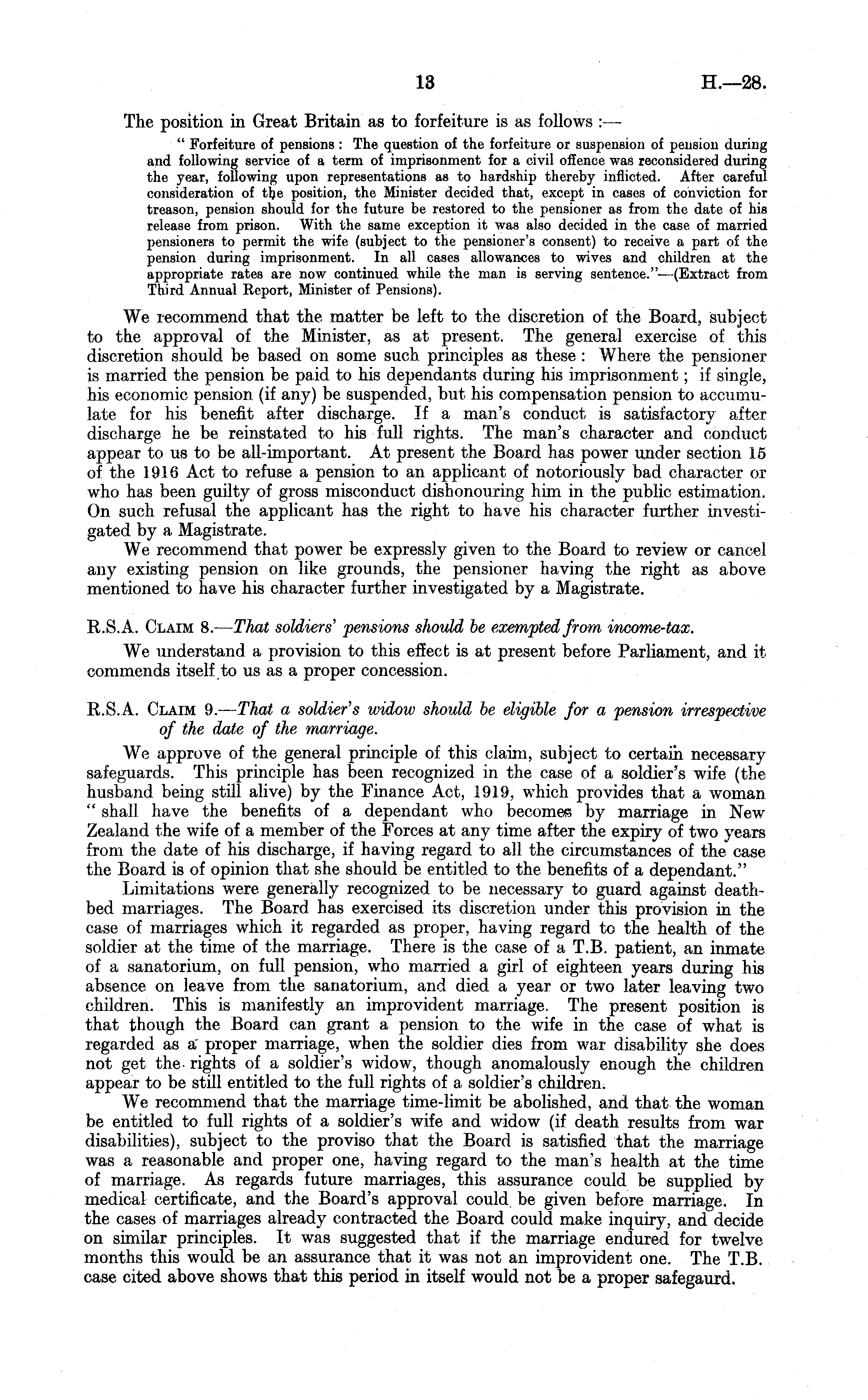 The position in Great Britain as to forfeiture is as follows : — " Forfeiture of pensions : The question of the forfeiture or suspension of pension during and following service of a term of imprisonment for a civil offence was reconsidered during the year, following upon representations as to hardship thereby inflicted. After careful consideration of t_)e position, the Minister decided that, except in cases of conviction for treason, pension should for the future be restored to the pensioner as from the date of his release from prison. With the same exception it was also decided in the. case of married pensioners to permit the wife (subject to the pensioner's consent) to receive a part of the pension during imprisonment. In all cases allowances to wives and children at the appropriate rates are now continued while the man is serving sentence."—(Extract from Third Annual Report, Minister of Pensions). We recommend that the. matter be left to the discretion of the Board, subject to the approval of the Minister, as at present. The general exercise of this discretion should be based on some such principles as these : Where the pensioner is married the pension be paid to his dependants during his imprisonment; if single, his economic pension (if any) be suspended, but his compensation pension to accumulate for his benefit after discharge. If a man's conduct is satisfactory after discharge he be reinstated to his full rights. The man's character and conduct appear to us to be all-important. At present the Board has power under section 15 of the 1916 Act to refuse a pension to an applicant of notoriously bad character or who has been guilty of gross misconduct dishonouring him in the public estimation. On such refusal the applicant has the right to have his character further investigated by a Magistrate. We recommend that power be expressly given to the Board to review or cancel any existing pension on like grounds, the pensioner having the right as above mentioned to have his character further investigated by a Magistrate. R.S.A. Claim 8. — That soldiers' pensions should be exempted from income-tax. We understand a provision to this effect is at present before Parliament, and it commends itself to us as a proper concession. R.S.A. Claim 9. — That a soldier's widow should be eligible for a pension irrespective of the date of the ma,rriage. We approve of the general principle of this claim, subject to certain necessary safeguards. This principle has been recognized in the case of a soldier's wife (the husband being still alive) by the Finance Act, 1919, which provides that a woman " shall have the benefits of a dependant who becomes by marriage in New Zealand the wife of a member of the Forces at any time after the expiry of two years from the date of his discharge, if having regard to all the circumstances of the case the Board is of opinion that she should be entitled to the benefits of a dependant." Limitations were generally recognized to be necessary to guard against deathbed marriages. The Board has exercised its discretion under this provision in the case of marriages which it regarded as proper, having regard to the health of the soldier at the time of the marriage. There is the case of a T.B. patient, an inmate of a sanatorium, on full pension, who married a girl of eighteen years during his absence on leave from the sanatorium, and died a year or two later leaving two children. This is manifestly an improvident marriage. The present position is that though the Board can grant a pension to the wife in the case of what is regarded as a" proper marriage, when the soldier dies from war disability she does not get the- rights of a soldier's widow, though anomalously enough the children appear to be still entitled to the full rights of a soldier's children. We recommend that the marriage time-limit be abolished, and that the woman be entitled to full rights of a soldier's wife and widow (if death results from war disabilities), subject to the proviso that the Board is satisfied that the marriage was a reasonable and proper one, having regard to the man's health at the time of marriage. As regards future marriages, this assurance could be supplied by medical certificate, and the Board's approval could be given before marriage. In the cases of marriages already contracted the Board could make inquiry, and decide on similar principles. It was suggested that if the marriage endured for twelve months this would be an assurance that it was not an improvident one. The T.B. case cited above shows that this period in itself would not be a proper safegaurd.