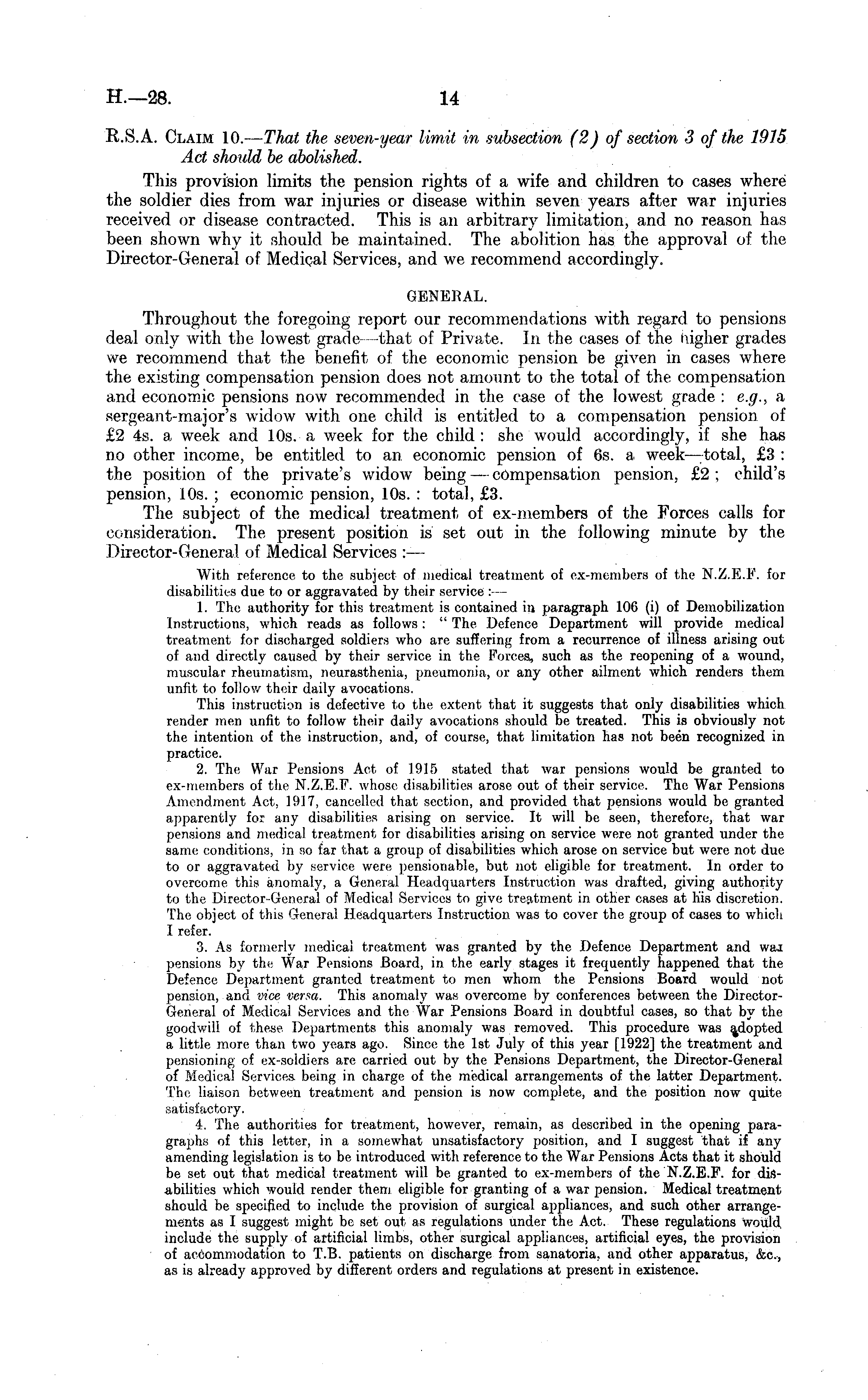 R.S.A. Claim 10. — That the seven-year limit in subsection (2) of section 3 of the 1915 Act should be abolished. This provision limits the pension rights of a wife and children to cases where the soldier dies from war injuries or disease within seven years after war injuries received or disease contracted. This is an arbitrary limitation, and no reason has been shown why it should be maintained. The abolition has the approval of the Director-General of Medicjal Services, and we recommend accordingly. GENERAL. Throughout the foregoing report our recommendations with regard to pensions deal only with the lowest grade -that of Private. In the cases of the higher grades we recommend that the benefit of the economic pension be given in cases where the existing compensation pension does not amount to the total of the compensation and economic pensions now recommended in the case of the lowest grade : e.g., a sergeant-major's widow with one child is entitled to a compensation pension of £2 4s. a week and 10s. a week for the child: she would accordingly, if she has no other income, be entitled to an. economic pension of 6s. a week—total, £3 : the position of the private's widow being — compensation pension, £2 ; child's pension, 10s. ; economic pension, 10s. : total, £3. The subject of the medical treatment of ex-members of the Forces calls for consideration. The present position is set out in the following minute by the Director-General of Medical Services :—- With reference to the subject of medical treatment of ex-members of the N.Z.E.P. for disabilities due to or aggravated by their service :— 1. The authority for this treatment is contained in paragraph 106 (i) of Demobilization Instructions, which reads as follows: " The, Defence Department will provide medical treatment for discharged soldiers who are suffering from a recurrence of illness arising out of and directly caused by their service in the Forces, such as the reopening of a wound, muscular rheumatism, neurasthenia, pneumonia, or any other ailment which renders them unfit to follow their daily avocations. This instruction is defective to the extent that it suggests that only disabilities which render men unfit to follow their daily avocations should be treated. This is obviously not the intention of the instruction, and, of course, that limitation has not been recognized in practice. 2. The War Pensions Act of 1915 stated that war pensions would be granted to ex-members of the N.Z.E.F. whose disabilities arose out of their service. The War Pensions Amendment Act, 1917, cancelled that section, and provided that pensions would be granted apparently for any disabilities arising on service. It will be seen, therefore, that war pensions and medical treatment for disabilities arising on service were not granted under the same conditions, in so far that a group of disabilities which arose on service but were not due to or aggravated by service were pensionable, but not eligible for treatment. In order to overcome this anomaly, a General Headquarters Instruction was drafted, giving authority to the Director-General of Medical Services to give treatment in other cases at his discretion. The object of this General Headquarters Instruction was to cover the group of cases to which I refer. 3. As formerly medical treatment was granted by the Defence Department and wai pensions by the War Pensions Board, in the early stages it frequently happened that the Defence Department granted treatment to men whom the Pensions Board would not pension, and vice versa. This anomaly was overcome by conferences between the DirectorGeneral of Medical Services and the War Pensions Board in doubtful cases, so that by tho goodwill of these. Departments this anomaly was removed. This procedure was adopted a little more than two years ago. Since the Ist July of this year [1922] the treatment and pensioning of ex-soldiers are carried out by the Pensions Department, the Director-General of Medical Services being in charge of the medical arrangements of the latter Department. The liaison between treatment and pension is now complete, and the position now quite satisfactory. 4. The authorities for treatment, however, remain, as described in the opening paragraphs of this letter, in a somewhat unsatisfactory position, and I suggest that if any amending legislation is to be introduced with reference to the War Pensions Acts that it should be set out that medical treatment will be granted to ex-members of the N.Z.E.F. for disabilities which would render them eligible for granting of a war pension. Medical treatment should be specified to include the provision of surgical appliances, and such other arrangements as I suggest might be set out as regulations under the Act. These regulations would, include the supply of artificial limbs, other surgical appliances, artificial eyes, the provision of accommodation to T.B. patients on discharge from sanatoria, and other apparatus, &c, as is already approved by different orders and regulations at present in existence.