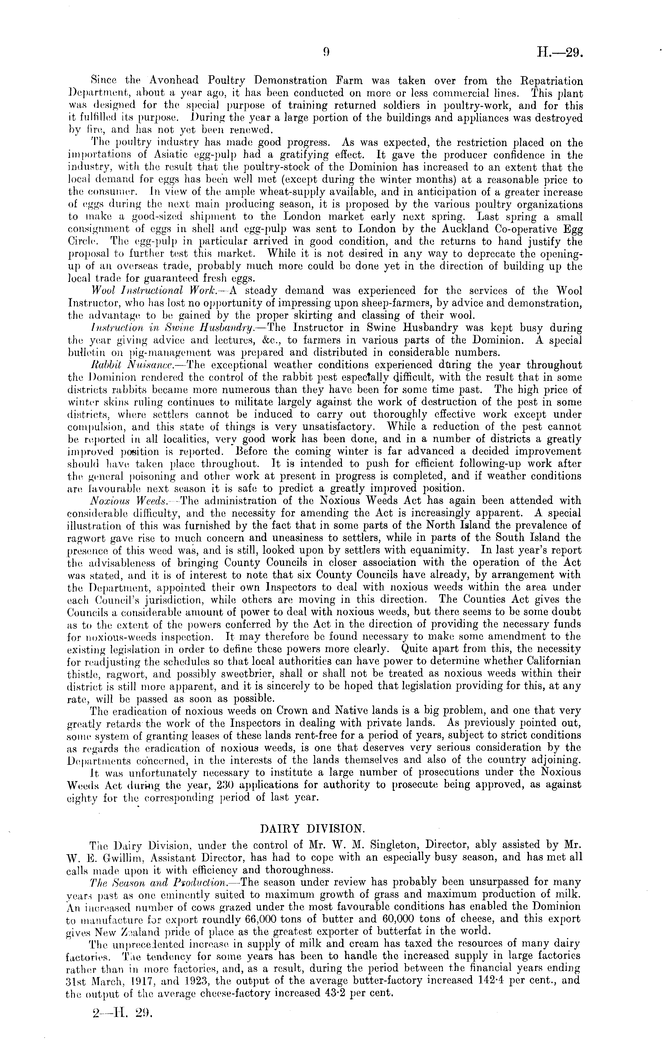 Since the Avonhead Poultry Demonstration Farm was taken over from the Repatriation Department, about a year ago, it has been conducted on more or less commercial lines. This plant was designed for the special purpose of training returned soldiers in poultry-work, and for this it fulfilled its purpose. During the year a large portion of the buildings and appliances was destroyed by fire, and has not yet been renewed. The poultry industry has made good progress. As was expected, the restriction placed on the importations of Asiatic egg-pulp had a gratifying effect. It gave the producer confidence in the industry, with the result that the poultry-stock of the Dominion has increased to an extent that the local demand for eggs has been well met (except during the winter months) at a reasonable price to the consumer. In view of the ample wheat-supply available, and in anticipation of a greater increase of eggs during the next main producing season, it is proposed by the various poultry organizations to make a good-sized shipment to the London market early next spring. Last spring a small consignment of eggs in shell and egg-pulp was sent to London by the Auckland Co-operative Egg Circle. The egg-pulp in particular arrived in good condition, and the returns to hand justify the proposal to further test this market. While it is not desired in any way to deprecate the openingup of an overseas trade, probably much more could be done yet in the direction of building up the local trade for guaranteed fresh eggs. Wool Instructional Work. —A steady demand was experienced for the services of the Wool Instructor, who has lost no opportunity of impressing upon sheep-farmers, by advice and demonstration, the advantage to be gained by the proper skirting and classing of their wool. Instruction in Swine Husbandry. —The Instructor in Swine Husbandry was kejit busy during the year giving advice and lectures, &c, to farmers in various parts of the Dominion. A special bulletin on pig-management was prepared and distributed in considerable numbers. Rabbit Nuisance. —The exceptional weather conditions experienced during the year throughout the Dominion rendered the control of the rabbit pest especially difficult, with the result that in some districts rabbits became more numerous than they have been for some time past. The high price of winter skins ruling continues to militate largely against the work of destruction of the pest in some districts, where settlers cannot be induced to carry out thoroughly effective work except under compulsion, and this state of things is very unsatisfactory. While a reduction of the pest cannot be reported in all localities, very good work has been done, and in a number of districts a greatly improved position is reported. Before the coming winter is far advanced a decided improvement should have taken place throughout. It is intended to push for efficient following-up work after the general poisoning and other work at present in progress is completed, and if weather conditions are favourable next season it is safe to predict a greatly improved position. Noxious Weeds. —The administration of the Noxious Weeds Act has again been attended with considerable difficulty, and the necessity for amending the Act is increasingly apparent. A special illustration of this was furnished by the fact that in some parts of the North Island the prevalence of ragwort gave rise to much concern and uneasiness to settlers, while in parts of the South Island the presence of this weed was, and is still, looked upon by settlers with equanimity. In last year's report the advisableness of bringing County Councils in closer association with the operation of the Act was stated, and it is of interest to note that six County Councils have already, by arrangement with the Department, appointed their own Inspectors to deal with noxious weeds within the area under each Council's jurisdiction, while others are moving in this direction. The Counties Act gives the Councils a considerable amount of power to deal with noxious weeds, but there seems to be some doubt as to the extent of the powers conferred by the Act in the direction of providing the necessary funds for noxious-weeds inspection. It may therefore be found necessary to make some amendment to the existing legislation in order to define these powers more clearly. Quite apart from this, the necessity for readjusting the schedules so that local authorities can have power to determine whether Californian thistle, ragwort, and possibly sweetbrier, shall or shall, not be treated, as noxious weeds within their district is still more apparent, and it is sincerely to be hoped that legislation providing for this, at any rate, will be passed as soon as possible. The eradication of noxious weeds on Crown and Native lands is a big problem, and one that very greatly retards the work of the Inspectors in dealing with private lands. As previously pointed out, some system of granting leases of these lands rent-free for a period of years, subject to strict conditions as regards the eradication of noxious weeds, is one that deserves very serious consideration by the Departments concerned, in the interests of the lands themselves and also of the country adjoining. It was unfortunately necessary to institute a large number of prosecutions under the Noxious Weeds Act during the year, 230 applications for authority to prosecute being approved, as against eighty for the corresponding period of last year. DAIRY DIVISION. Trio Dairy Division, under the control of Mr. W. M. Singleton, Director, ably assisted by Mr. W. E. Gwillim, Assistant Director, has had to cope with an especially busy season, and has met all calls made upon it with efficiency and thoroughness. The Season and Production. —The season under review has probably been unsurpassed for many past as one eminently suited to maximum growth of grass and maximum production of milk. An increased number of cows graze