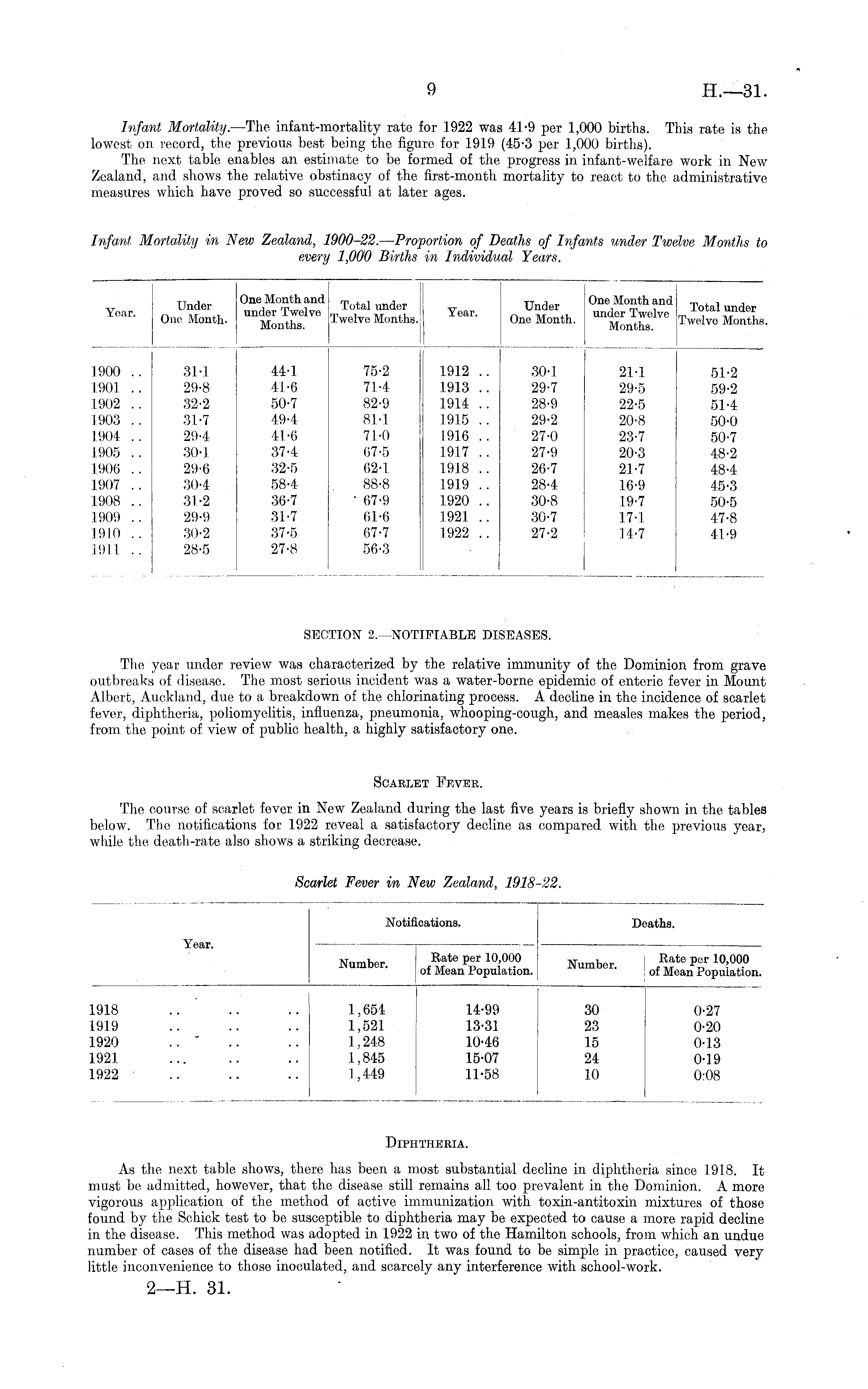 SECTION 2.—NOTIFIABLE DISEASES. The year under review was characterized by the relative immunity of the Dominion from grave outbreaks of disease. The most serious incident was a water-borne epidemic of enteric fever in Mount Albert, Auckland, due to a breakdown of the chlorinating process. A decline in the incidence of scarlet fever, diphtheria, poliomyelitis, influenza, pneumonia, whooping-cough, and measles makes the period, from the point of view of public health, a highly satisfactory one. Scarlet Fever. The course of scarlet fever in New Zealand during the last five years is briefly shown in the tables below. The notifications for 1922 reveal a satisfactory decline as compared with the previous year, while the death-rate also shows a striking decrease.