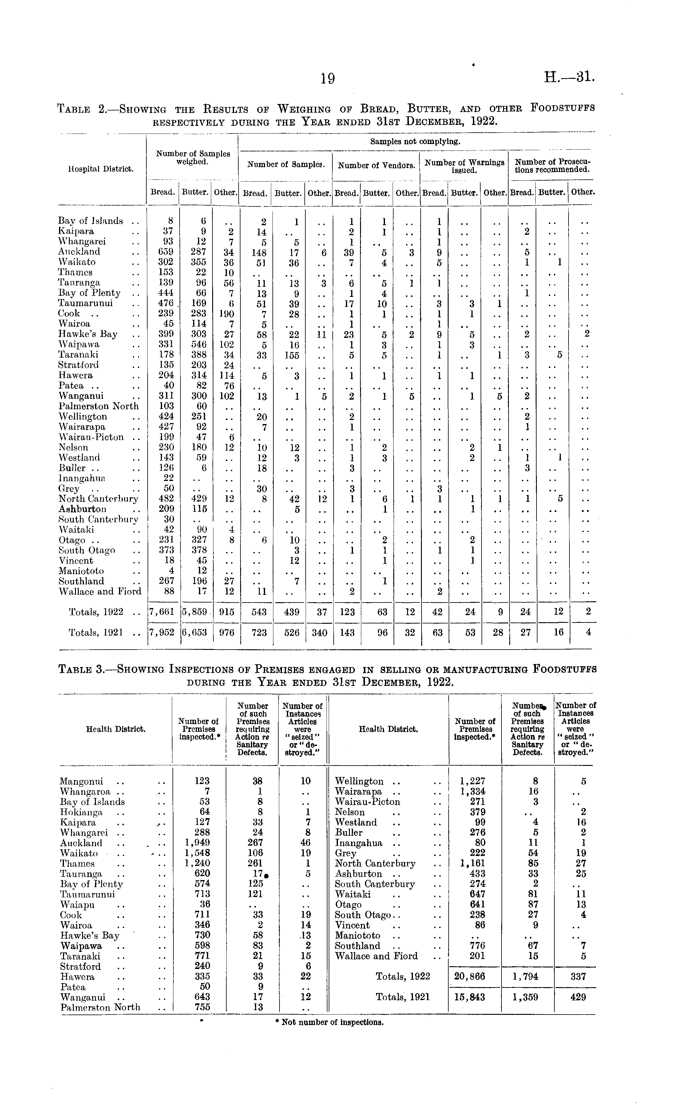 Samples not i complyi lng. Numl ior of Samples weighed. Number of Sal lples. ior of Vendors. Numb >er of Warnings issued. Number of Prosecutions recommended. Hospital District. Numt Bread. Butter. Other. Bread. Butter. Other. Bread. Butter. Other. Bread. Butter. Other. Bread. Butter. Other. Bay of Islands . . Kaipara Whangarei Auckland Waikato Thames Tauranga Bay of Plenty . . Taumarunui Cook Wairoa Hawke's Bay Waipawa Taranaki Stratford flawera Patea Wanganui Palmerston North Wellington Wairarapa Wairau - Picton .. Nelson Westland Buller .. 1nangahua Grey North Canterbury Ashburton South Canterbury Waitaki Otago South Otago Vincent Maniototo Southland Wallace and Fiord 8 37 93 659 302 153 139 444 476 | 239 45 399 331 178 135 204 40 311 103 424 427 199 230 143 126 22 50 482 209 30 42 231 373 18 4 267 88 6 9 12 287 355 22 96 66 169 283 114 303 546 388 203 314 82 300 60 251 92 47 180 59 6 2 7 34 36 10 56 7 0 190 7 27 102 34 24 1.14 76 102 2 14 5 148 51 11 13 51 H 5 58 5 33 1 5 17 36 13 9 39 28 22 16 155 1 2 I 39 7 6 1 17 1 1 23 1 5 1 1 "s 4 5 4 10 1 5 3 5 1 1 1 9 5 3 1 5 3 2 5 1 1 2 3 1 5 2 5 3 1 1 1 13 1 5 2 1 1 5 2 20 7 2 1 2 1 6 12 10 12 18 12 3 1 1 3 2 3 2 2 I 3 1 429 115 12 30 8 42 5 12 3 I 6 1 "l I 1 5 90 327 378 45 12 196 17 4 8 6 10 3 12 1 2 1 1 2 t 1 27 12 ii 7 2 1 2 Totals, 1922 .. 7,661 5,859. 915 543 439 37 123 63 12 42 24 9 24 12 2 Totals, 1921 .. 7,952 6,653 976 723 526 340 143 96 32 63 53 28 27 16 4