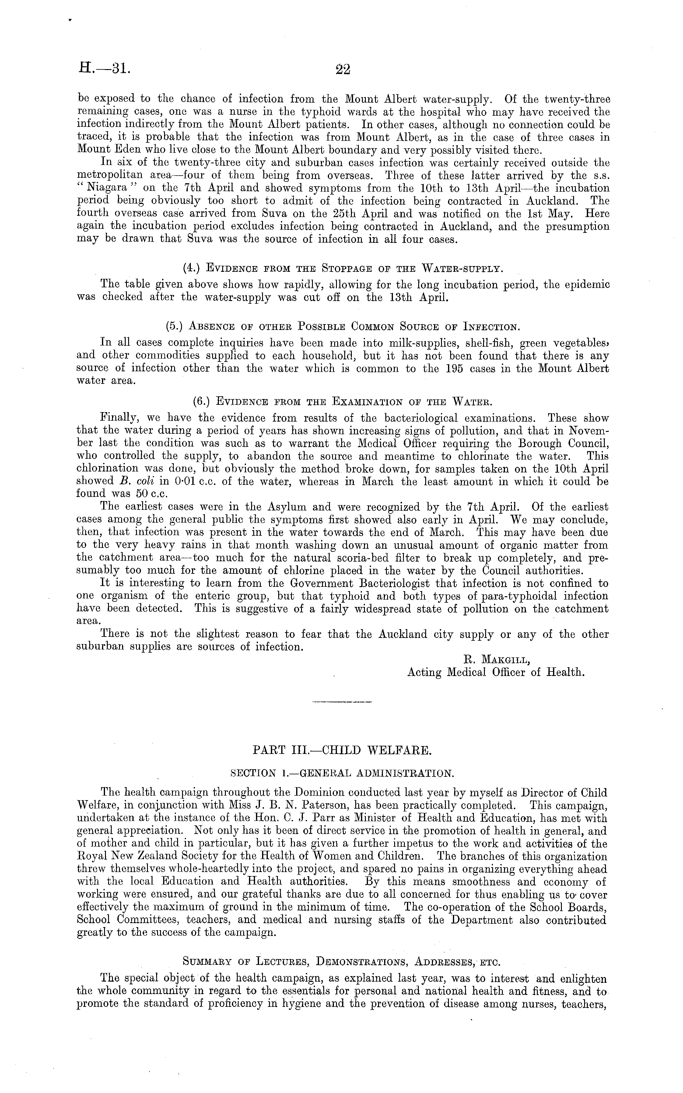 be exposed to the chance of infection from the Mount Albert water-supply. Of the twenty-three remaining cases, one was a nurse in the typhoid wards at the hospital who may have received the infection indirectly from the Mount Albert patients. In other cases, although no connection could be traced, it is probable that the infection was from Mount Albert, as in the case of three cases in Mount Eden who live close to the Mount Albert boundary and very possibly visited there. In six of the twenty-three city and suburban cases infection was certainly received outside the metropolitan area—four of them being from overseas. Three of these latter arrived by the s.s. " Niagara " on the 7th April and showed symptoms from the 10th to 13th April —the incubation period being obviously too short to admit of the infection being contracted in Auckland. The fourth overseas case arrived from Suva on the 25th April and was notified on the Ist May. Here again the incubation period excludes infection, being contracted in Auckland, and the presumption may be drawn that Suva was the source of infection in all four cases. (4.) Evidence from the Stoppage of the Water-supply. The table given above shows how rapidly, allowing for the long incubation period, the epidemic was checked after the water-supply was cut off on the 13th April. (5.) Absence of other Possible Common Source of Infection. In all cases complete inquiries have been made into milk-supplies, shell-fish, green vegetables) and other commodities supplied to each household, but it has not been found that there is any source of infection other than the water which is common to the 195 cases in the Mount Albert water area. (6.) Evidence from the Examination of the Water. Finally, we have the evidence from results of the bacteriological examinations. These show that the water during a period of years has shown increasing signs of pollution, and that in November last the condition was such as to warrant the Medical Officer requiring the Borough Council, who controlled the supply, to abandon the source and meantime to chlorinate the water. This chlorination was done, but obviously the method broke down, for samples taken on the 10th April showed B. coli in 0-01 c.c of the water, whereas in March, the least amount in which it could be found was 50 c.c. The earliest cases were in the Asylum and were recognized by the 7th April. Of the earliest cases among the general public the symptoms first showed also early in April. We may conclude, then, that infection was present in the water towards the end of March. This may have been due to the very heavy rains in that month washing down an unusual amount of organic matter from the catchment area —too much for the natural scoria-bed filter to break up completely, and presumably too much for the amount of chlorine placed in the water by the Council authorities. It is interesting to learn from the Government Bacteriologist that infection is not confined to one organism of the enteric group, but that typhoid and both types of para-typhoidal infection have been detected. This is suggestive of a fairly widespread state of pollution on the catchment area. There is not the slightest reason to fear that the Auckland city supply or any of the other suburban supplies are sources of infection. R. Makgill, Acting Medical Officer of Health.