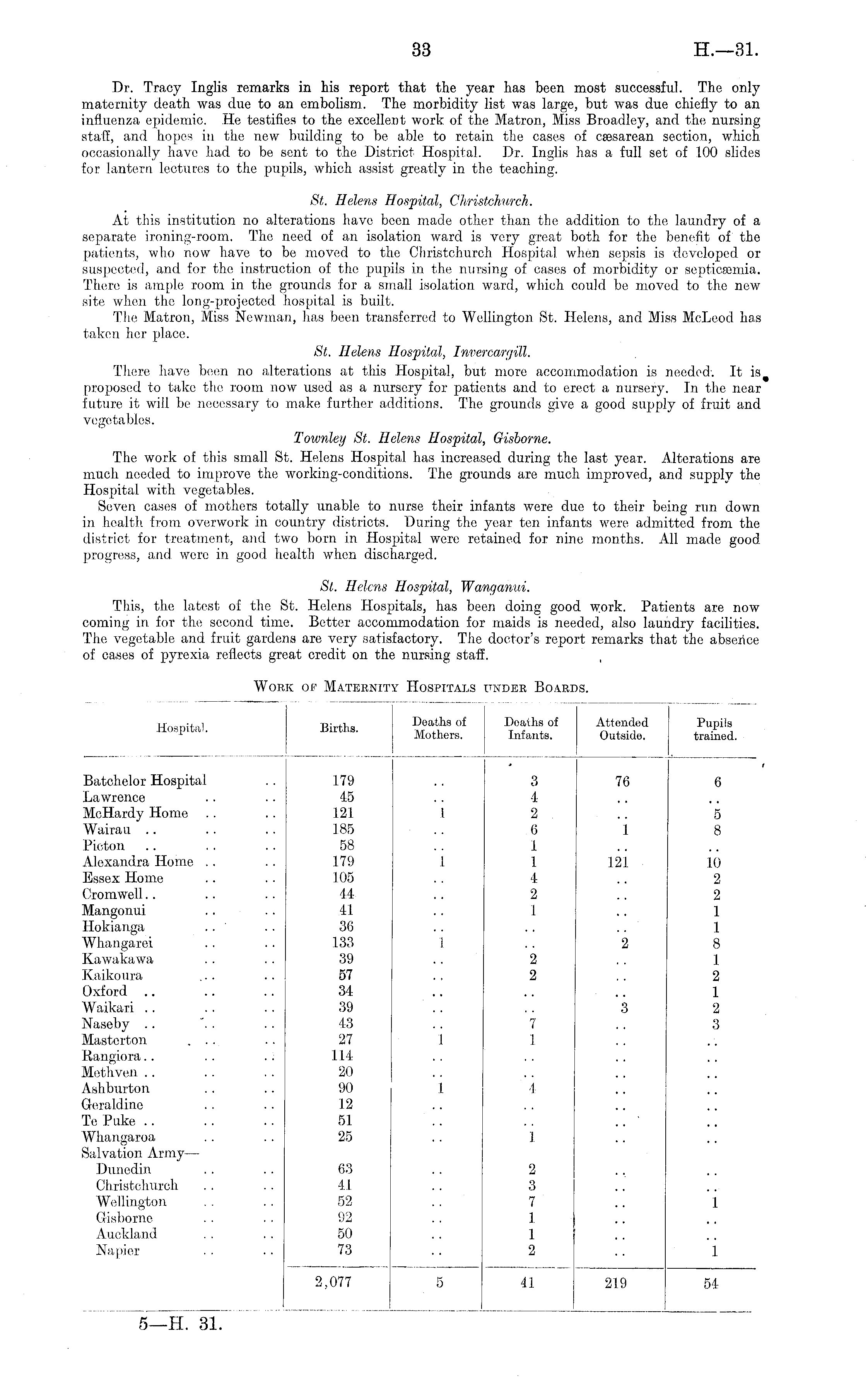 Dr. Tracy Inglis remarks in his report that the year has been most successful. Tho only maternity death was due to an embolism. The morbidity list was large, but was due chiefly to an influenza epidemic. He testifies to the excellent work of the Matron, Miss Broadley, and the nursing staff, and hopes in the new building to be able to retain the cases of csesarean section, which, occasionally have had to be sent to the District Hospital. Dr. Inglis has a full set of 100 slides for lantern lectures to the pupils, which assist greatly in the teaching. St. Helens Hospital, Christchurch. At this institution no alterations have been made other than the addition to the laundry of a separate ironing-room. The need of an isolation ward is very great both for the benefit of the patients, who now have to be moved to the Christchurch Hospital when sepsis is developed or suspected, and for the instruction of the pupils in the nursing of cases of morbidity or septicaemia. There is ample room in the grounds for a small isolation ward, which could be moved to the new site when the long-projected hospital is built. The Matron, Miss Newman, has been transferred to Wellington St. Helens, and Miss McLeod ha.s taken her place. St. Helens Hospital, Invercargill. There have been no alterations at this Hospital, but more accommodation is needed. It is proposed to take the room now used as a nursery for patients and to erect a nursery. In the near future it will bo necessary to make further additions. The grounds give a good supply of fruit and vegetables. Townley St. Helens Hospital, Gisborne. The work of this small St. Helens Hospital has increased during the last year. Alterations are much needed to improve the working-conditions. The grounds are much improved, and supply the Hospital with vegetables. Seven cases of mothers totally unable to nurse their infants were due to their being run down in health, from overwork in country districts. During the year ten infants were admitted from the district for treatment, and two born in Hospital were retained for nine months. All made good progress, and were in good health when discharged. St. Helens Hospital, Wanganui. This, the latest of the St. Helens Hospitals, has been doing good work. Patients are now coming in. for the second time. Better accommodation for maids is needed, also laundry facilities. The vegetable and fruit gardens are very satisfactory. The doctor's report remarks that the absence of cases of pyrexia reflects great credit on the nursing staff.