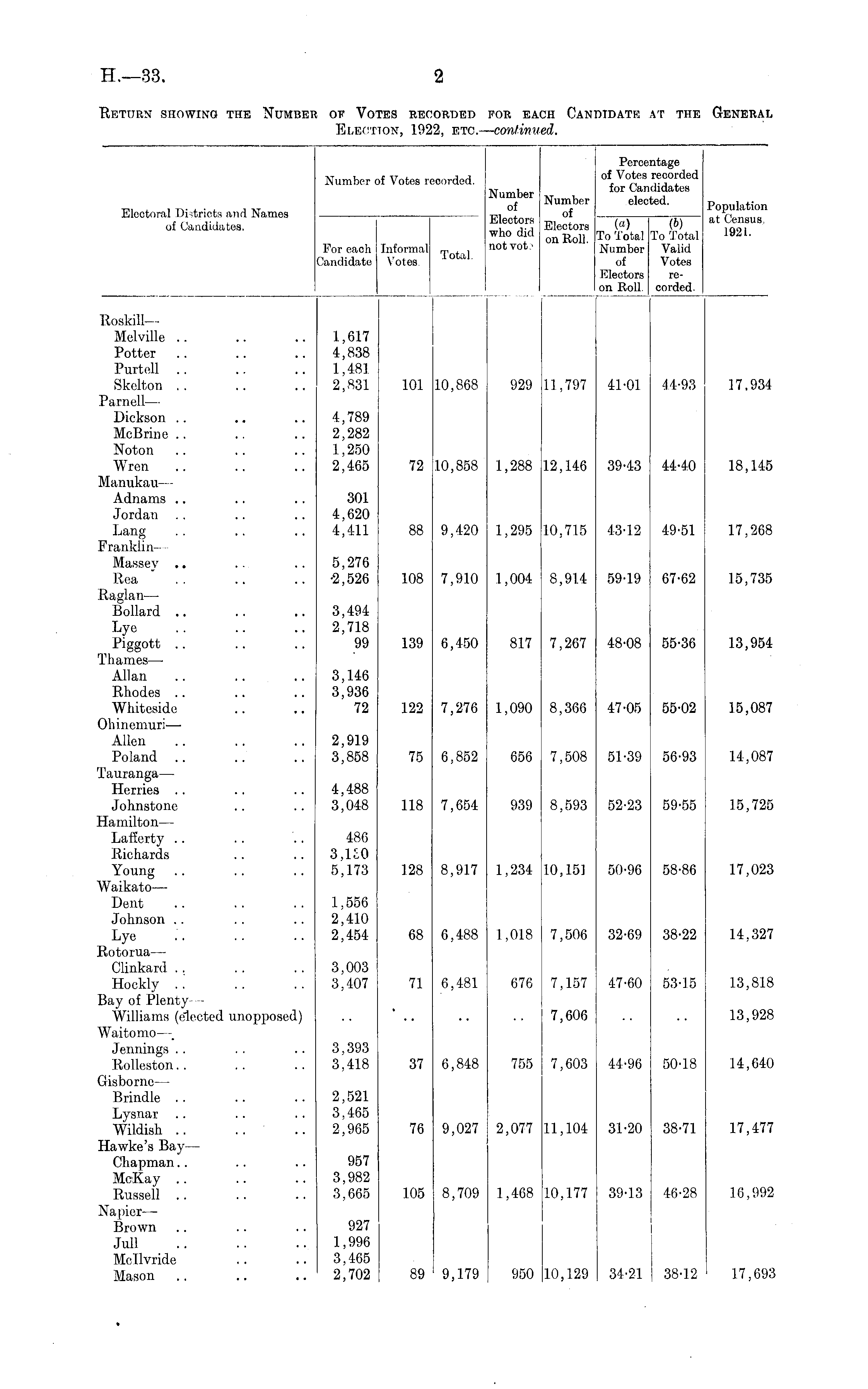 Number of Votes recorded. Perci of Votet for Cai elei mtage recorded ididates :ted. Electoral Districts and Names of Candidates. For each Informal T , , Candidate Votes lotal Number of Electors who did not vot ■ Number of Electors on Roll. " («) To Total Number of Electors on Roll (b) To Total Valid Votes recorded. Population at Census, 1921. Koskill— Melville .. Potter Purtell .. Skelton Parnell— Dickson McBrine .. Noton Wren Manukau — Adnams Jordan Lang Franklin--Massey .. Rea .. Raglan— Bollard .. Lye Piggott .. Thames— Allan Rhodes Whiteside Oliinemuri— Allen Poland 1,617 4,838 1,481 2,831 4,789 2,282 1,250 2,465 301 4,620 4,411 88 101 72 10,868 10,858 9,420 1,288 1,295 929 11,797 12,146 10,715 41-01 39-43 43-12 44-93 44-40 49-51 17,934 18,145 17,268 5,276 •2,526 108 7,910 1,004 8,914 59-19 67-62 15,735 3,494 2,718 99 139 817 7,267 13,954 6,450 48-08 55-36 3,146 3,936 72 8,366 15,087 122 7,276 1,090 47-05 55-02 2,919 3,858 75 6,852 656 7,508 51-39 56-93 14,087 Tauranga— Herries Johnstonc Hamilton — Laflerty Richards Young Waikato— Dent Johnson Lye Rotorua — Clinkard Hockly ..' Bay of Plenty Williams (elected unopposed) Waitomo — Jennings Rolleston Gisborne— Brindle Lysnar Wildish .. Hawke's Bay— Chapman McKay .. Russell Napier — Brown Jull Mcllvrido Mason 4,488 3,048 486 3,ISO 5,173 1,556 2,410 2,454 3,003 3,407 68 71 118 128 7,654 8,917 6,488 6,481 939 1,234 1,018 676 8,593 10,151 7,506 7,157 7,606 52-23 50-96 32-69 47-60 59-55 58-86 38-22 53-15 ]5,725 17,023 14,327 13,818 13,928 3,393 3,418 37 6,848 755 7,603 44-96 50-18 14,640 2,521 3,465 2,965 9,027 2,077 11,104 17,477 76 31-20 38-71 957 3,982 3,665 16,992 4 105 8,709 1,468 10,177 39'] 3 46-28 927 1,996 3,465 2,702 17,693 89 9,179 950 10,129 Si -21 38-12