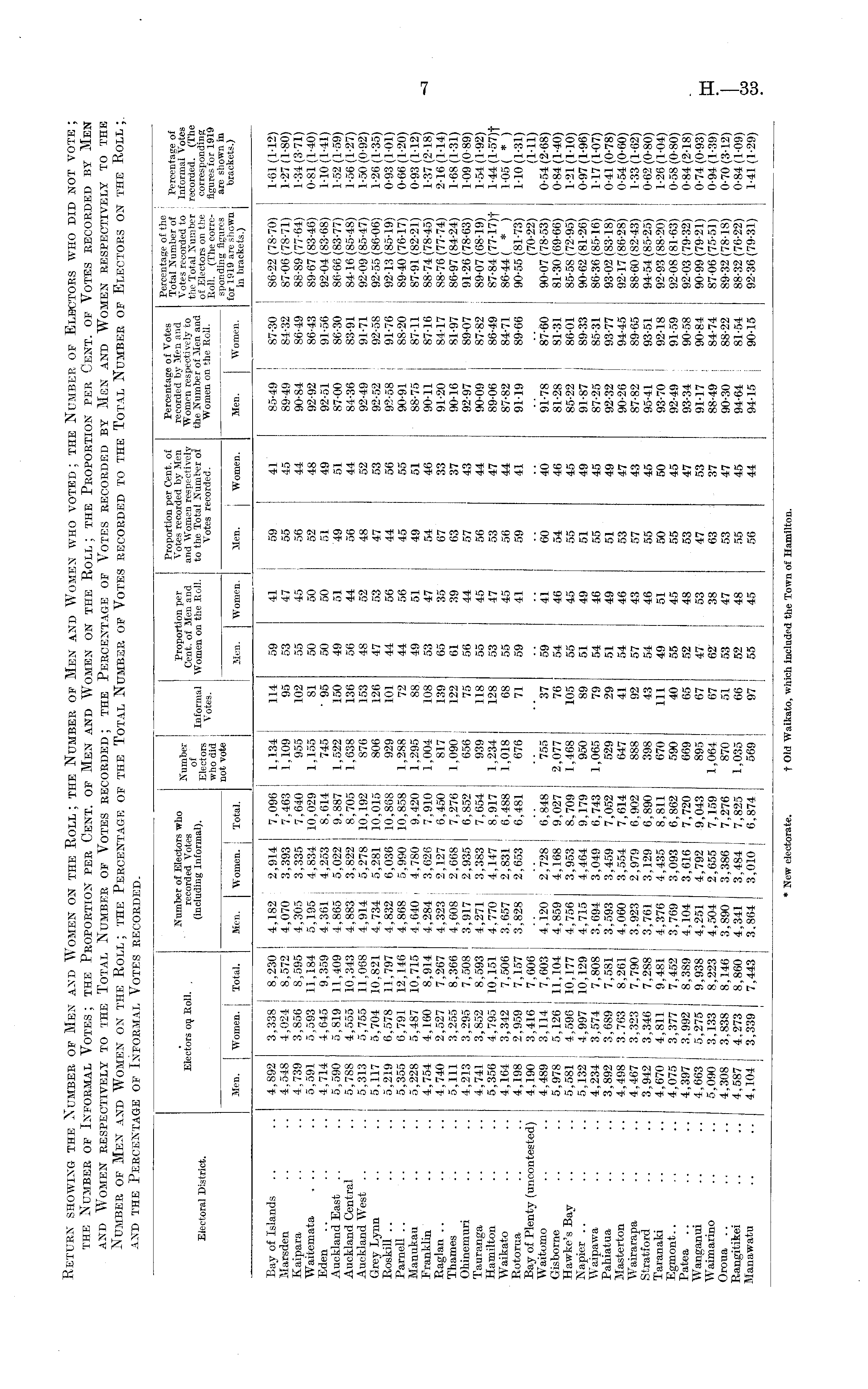 Return showing the Number of Men and Women on the Roll; the Number of Men and Women who voted; the Number of Electors who did not vote; the Number of Informal Votes; the Proportion per Cent, of Men and Women on the Roll; the Proportion per Gent, of Votes recorded by Men and Women respectively to the Total Number of Votes recorded; the Percentage of Votes recorded by Men and Women respectively to the Number of Men and Women on the Roll; the Percentage of the Total Number of Votes recorded to the Total Number of Electors on the Roll; and the Percentage of Informal Votes recorded.