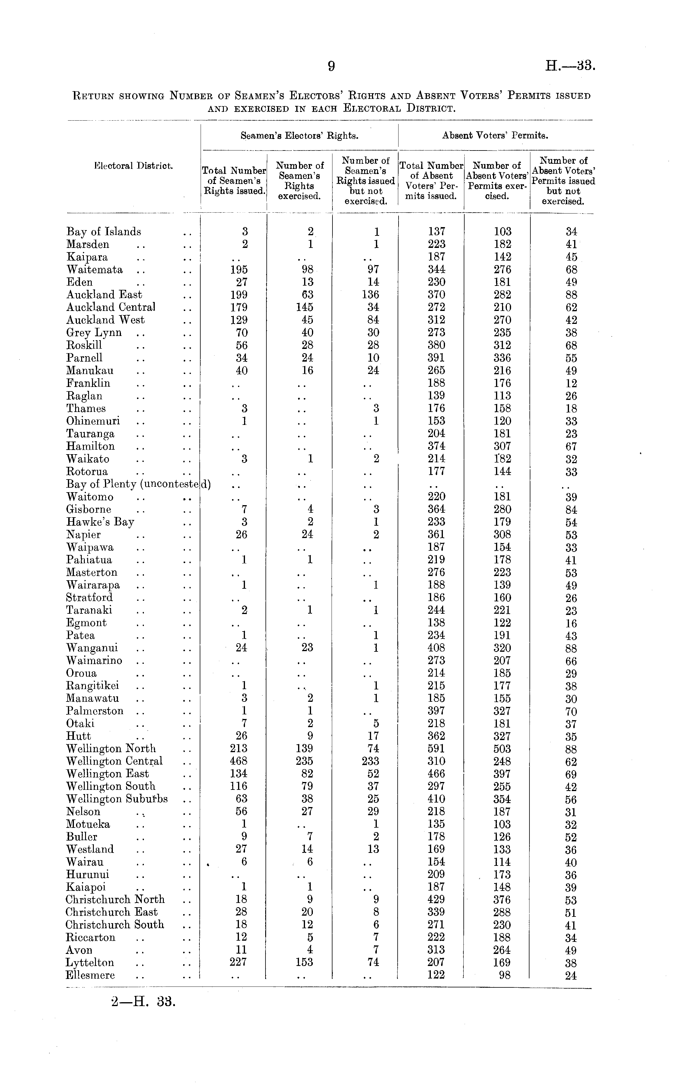 Seami :n's Electors' lights. Absei it Voters' Pen iits. Electoral District. Number of Seamen's Rights exercised. Number of Seamen's Rights issued but not exercised. Total Number! of Absent | Voters' Permits issued. Number of ! Absent Voters' Permits exercised. Number of Absent Voters' Permits issued but not exercised. Total Number of Seamen's Rights issued. Bay of Islands Marsden Kaipara Waitemata Eden Auckland East Auckland Central Auckland West Grey Lynn Eoskill Parncll Manukau Franklin Raglan Thames Ohinemuri 3 2 I 195 27 199 179 129 70 56 34 40 2 1 98 13 63 145 45 40 28 24 16 1 1 97 14 136 34 84 30 28 10 24 1.37 223 187 344 230 370 272 312 273 380 391 265 188 139 176 153 204 374 214 177 103 182 142 276 181 282 210 270 235 312 336 216 176 113 158 120 181 307 1'82 144 34 41 45 68 49 88 62 42 38 68 55 49 12 26 18 33 23 67 32 33 3 1 3 1 Tauranga Hamilton Waikato 3 1 2 Rotorua Bay of Plenty (unconteste Waitomo Gisborne Hawke's Bay Napier Waipawa Pahiatua Masterton Wairarapa Stratford Taranaki Egmont Patea Wanganui Waimarino d) .. 7 3 26 1 4 2 24 1 3 1 2 220 364 233 361 187 219 276 188 186 244 138 234 408 273 214 215 185 397 218 362 591 310 466 297 410 218 135 178 169 154 209 187 429 339 271 222 313 207 122 181 280 179 308 154 178 223 139 160 221 122 191 320 207 185 177 155 327 181 327 503 248 397 255 354 187 103 126 133 114 173 148 376 288 230 188 264 169 98 39 84 54 53 33 41 53 49 26 23 16 43 88 66 29 38 30 70 37 35 88 62 69 42 56 31 32 52 36 40 36 39 53 51 41 34 49 38 24 1 1 2 1 1 1 24 23 1 1 Oroua Rangitikei Manawatu Palmerston Otaki Hutt Wellington Nortlt Wellington Central Wellington East Wellington South Wellington Suburbs Nelson Motueka Buller Westland Wairau 1 3 1 7 26 213 468 134 116 63 56 1 9 27 6 2 1 2 9 139 235 82 79 38 27 1 1 5 17 74 233 52 37 25 29 1 2 13 7 14 6 Hurunui Kaiapoi Christchurch North Ohristchurch East Christchurch South Riccarton 1 18 28 18 12 11 227 1 9 20 12 5 4 153 9 8 6 7 7 74 Avon Lyttelton Ellesmere