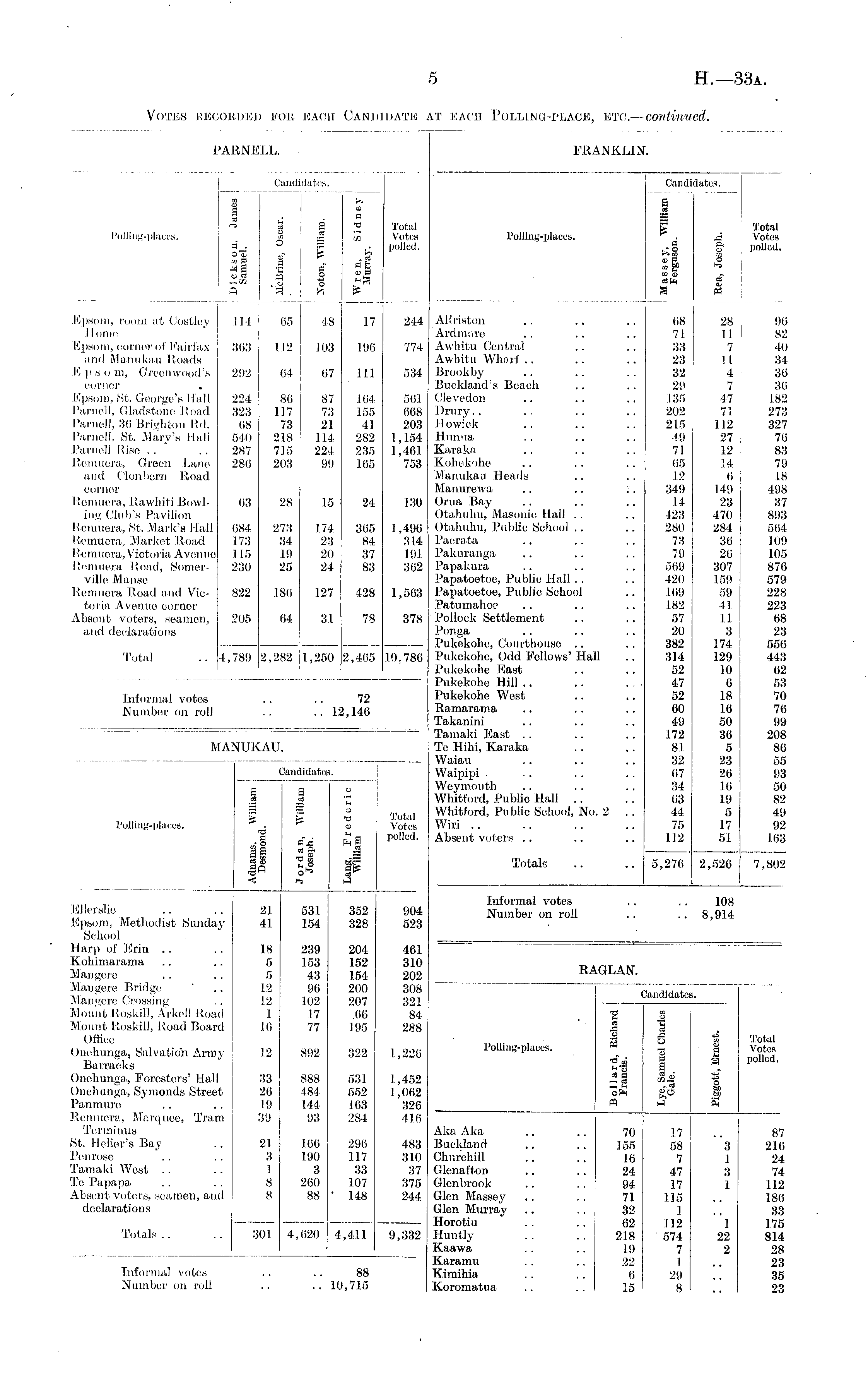 p PARNELL. FRANKLIN. Polling-places. Candidates. CO b. as ., 1 b ! d S !£ ;q ~d Sa S" -S m 2 a - a b a a eg o as a -en rS o .""> a *s . z, is a -a en Total Votes polled, Total Votes polled, Polling-places. Candii a 8 a' ..- o I—.S as B, •| rirb rfl dates. 2 ft OS O b5 ri P 'Total Votes polled. .. cA sg is Epsom, room at Costley Homo t Epsom, corner of Fairfax and Manukau Roads IS p s o m, Greenwood's corner . Epsom, St. George's I bill Parnell, Gladstone Road Parnell, 36 Brighton IU\. Parnell. St. Mary's Hall Parnell Rise Remuera, Green Lane and Clonbern Road corner Remuera, Rawhiti Bowling Club's Pavilion Remuera, St. Mark's Hall Remuera, Market Road Remuera, Victoria Avenue Remuera Road, Somerville Manse Remuera Road and Victoria Avenue eornor Absent voters, seamen, and declarations 114 65 48 17 3(53 112 103 196 292 64 67 111 224 86 87 104 323 117 73 155 68 73 21 41 540 218 .114 282 287 715 224 235 286 203 99 165 63 28 15 24 684 273 174 365 173 34 23 84 i 115 19 20 37 230 25 24 83 822 .180 127 428 205 64 31 78 244 774 534 561 668 203 1,154 1,461 753 130 1,496 31.4 191 362 1,563 378 Alfriston Ardmnre Awh.itu Central Awbitu Wharf .. Brook by Bitckland's Beach Clevedon Drury. . H owiek Hunua Karaka Koliek'ihe Manukau Heads Manurewa Orua Bay Otahuhu, Masonic Hall . , Otahuhu, Public School .. Paerata Pakuranga Papal; ura Papatoetoe, Public Hall . . Papatoetoe, Public School Patumahoe Pollock Settlement Ponga Pukekohe, Courthouse .. Pukekohe, Odd Fellows' Hall Pukekohe East Pukekohe Hill Pu kckohe West Ramarama Takanini Tamaki East Te Hihi, Karaka Waiau Waipipi Weymouth Whitford, Public Hall .. Whitford, Public School, No. 2 Wiri .. Absent voters 68 71 33 23 32 29 135 202 215 49 71 65 12 349 14 423 280 73 7!) 569 420 169 182 57 20 382 314 52 47 52 60 49 172 81 32 07 34 63 44 75 1J2 28 II 7 11 4 7 47 7! 112 27 12 14 6 149 23 470 284 36 26 307 159 59 41 11 3 174 129 10 6 18 16 50 36 5 23 26 16 19 5 17 51 | 96 82 40 34 36 36 182 273 327 76 88 79 IS 498 37 893 564 109 105 876 579 228 223 68 23 556 443 62 53 70 70 99 208 86 55 93 50 82 49 92 103 Total 4,789 2,282 1,250 2,405 10,786 Informal votes Number on roll 72 .. 12,146 ma: CTJKAU, i Jandtdatei ( I. Polling-places. a ■XA AA il ri cd 2R a ri a"2 "I 1 O 1^ 1-5 cs b O -a b „ rbg bor 3 p Total Votes polled. Totals 5,27(5 2,526 7,802 Kllerslio Epsom, Methodist Sunday School Harp of Erin .. Kohimarama Mangere Mangere Bridge Mangere Crossing Mount Roskill, Arkell Road Mount Roskill, Road Board Office Onehunga, Salvation. Army Barracks Onehunga, Foresters' Hall Onehunga, Symonds Street Panmurc Remuera, Marquee, Tram Terminus St. Helier's BayPen rose Tamaki West To Papapa Absent voters, seamen, and declarations 21 41 531 154 352 328 904 523 Informal votes Number on roll 108 8,914 18 5 5 12 .12 1 16 239 153 43 96 102 17 77 204 152 154 200 207 .66 195 461 310 202 308 321 84 2SS RA S.GLAN. Candidates. 12 892 322 1,226 Polling-places. b ri "cs p -H OS b-3 « a — ri -. b OP p O L .ri cop p ca CO a W 2 bo ft 'Total Votes polled. 33 26 19 39 888 484 144 93 531 552 163 284 1,452 1,062 326 416 21 3 1 8 8 166 190 3 2(50 88 296 117 33 107 ' 148 483 310 37 375 244 Aka Aka Buokland Churchill Glenafton Glenbrook Glen Massey Glen Murray Horotiu Huntly Kaawa Karamu Kimihia Koroinattia 70 155 16 24 94 71 32 62 218 19 22 ti 15 17 58 7 47 17 115 1 112 574 7 I 29 8 3 I 3 1 1 22 2 87 216 24 74 112 180 33 175 814 28 23 35 23 Totals .. 301 4,(520 4,411 9,332 Informal votes Number on roll 88 .. 10,715