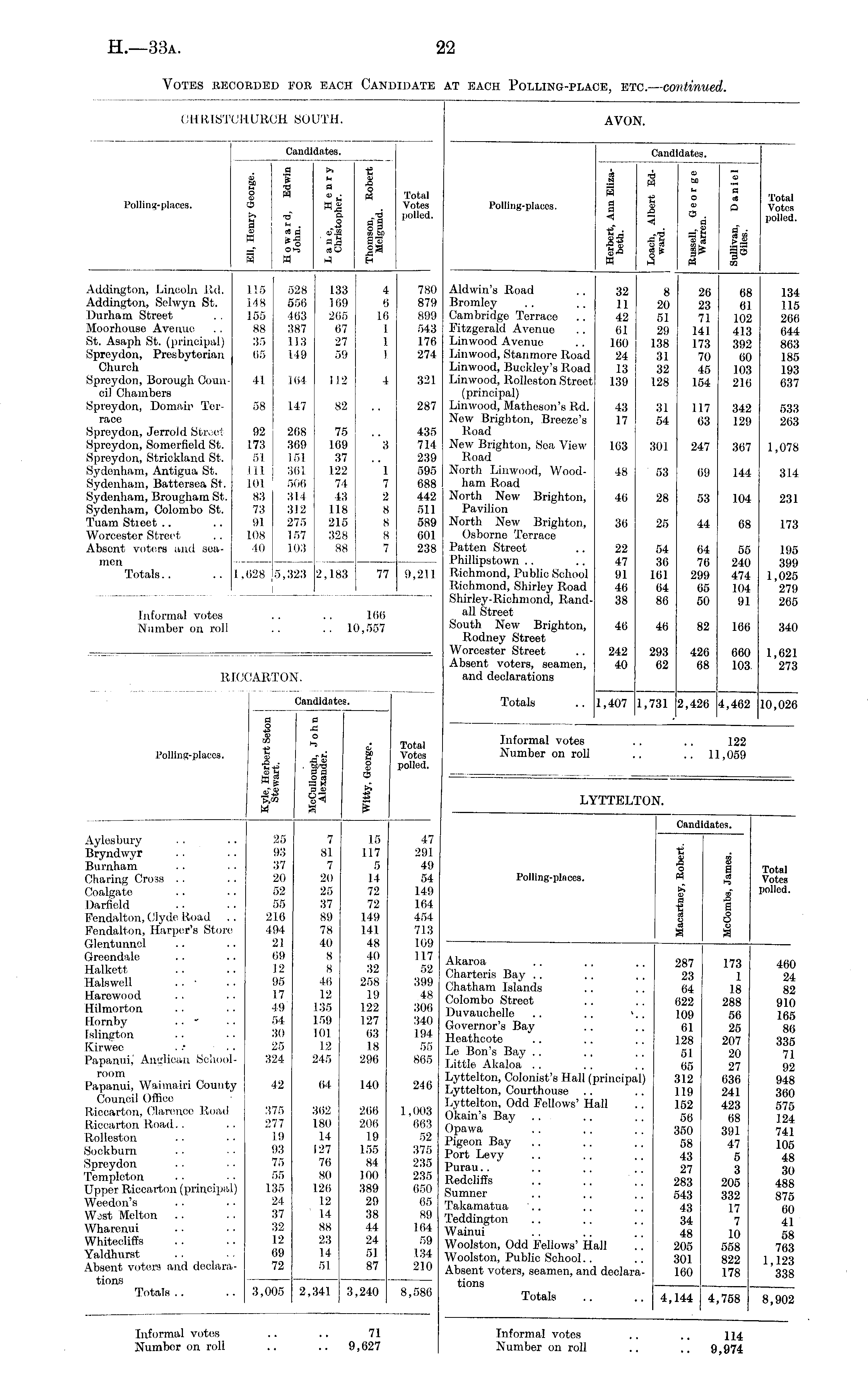 (JURIST 'CHURCH SO TH. AVON. Candii lates. Candidates. Polling-places. 05 bo o OS I W P a '? -a P 2 l b « a ►J Or-. >. b a "u W2 a. s 0J M hH O fA « g o P r/i bD jsl" H Total Votes polled. Polling-places. OS CHI P a a Hi is m 0J be h O OJ O . a ™ rt gts p S3 rt A Total Votes polled. -■6 o rt r ii i* CO Addington, Lincoln Rd. Addington, Sclwyn St. Durham Street Moorhouse Avenue St. Asaph St. (principal) Spreydon, Presbyterian Church Spreydon, Borough Council Chambers Spreydon, Domain Terrace Spreydon, Jerrold Street Spreydon, Somerfield St. Spreydon, Strickland St. Sydenham, Antigua St. Sydenham, Battersea St. Sydenham, Brougham St. Sydenham, Colombo St. Tuam Street Worcester Street Absent voters and seamen Totals.. 115 148 155 88 35 65 41. 58 92 173 51 111 101 83 78 91 108 40 1,628 528 133 556 169 463 265 387 67 113 27 149 59 164 1.12 147 82 268 75 369 169 151 37 361 122 506 7-4 314 43 312 118 275 215 157 328 103 88 4 780 6 879 1 (i 899 i 543 1 176 I 274 4 321 287 435 3 714 239 1 595 7 688 2 442 8 511 8 589 S 601 7 238 Aldwin's Road Bromley Cam bridge Terrace Fitzgerald Avenue Linwood Avenue Linwood, Stanmore Road Linwood, Buckley's Road Linwood, RoUeston Street (principal) Linwood, Matlieson's Rd. New Brighton, Breeze's Road New Brighton, Sea View Road North Linwood, Woodham Road North New Brighton, Pavilion North New Brighton, Osborne Terrace Patten Street Phillipstown Richmond, Public School Richmond, Shirley Road Shirley-Richmond, Randall Street South New Brighton, Rodney Street Worcester Street Absent voters, seamen, and declarations 32 11 42 61 100 24 13 139 43 17 103 8 20 51 29 138 31 32 128 31 54 301 26 23 71 141 173 70 45 154 117 63 247 68 61 102 413 392 00 103 216 342 129 367 134 115 266 644 863 185 193 637 533 263 1,078 48 53 69 144 314 46 28 53 104 231 36 25 44 08 173 5,323 2,183 ■ 77 9,211 22 47 91 46 38 54 36 161 64 86 64 7(5 299 65 50 55 240 474 104 91 195 399 1,025 279 265 \_ Informal votes Number on roll 1(5(5 9,557 46 46 82 166 340 .. 1( 242 40 293 62 420 68 660 103 1,621 273 RICi 3ART01 Jandidotes. Totals 1,731 4,462 10,026 1,407 2,420 Polling-places. a o +=• 0J GO * OJ oj h wg os"4S >,en M 0 o 0h W J-H o $ H"3 Total Votes polled. Informal votes Number on roll 1 122 ,059 -cfoj . SlJ-rJ 3! S3 O 03 =3 K m LYTTELTON. Candidates. Aylesbury Bryndwyr Burnham Charing Cross Coalgate Darficld Fendalton, Clyde Road Fendalton, Harper's Store Glentunnol Greendale Halkett Halswell . . • 25 93 37 20 52 55 216 494 21 69 12 95 17 49 54 3(1 25 324 7 81 7 20 25 37 89 78 40 8 S 46 12 135 159 101 12 245 15 117 5 14 72 72 149 141 48 40 32 258 19 122 127 63 18 296 47 291 49 54 149 164 454 713 109 117 52 399 48 306 340 194 55 865 Polling-places. jV rC O rH r> 0) .3 fcS a I 4J § ri rO a O 1 Total Votes polled. Harewood Hilmorton Hornby .. - Islington Kirwee . .- Papanui,' Anglican Schoolroom Papanui, Waimairi County Council Office Riecarton, Clarence Road Riecarton Road. RoUeston Sockburn Spreydon Templeton Upper Riecarton (principal) Woedon's Wast Melton Wharenui Whitecliffs Yaldhurst Absent voters and declarations 42 375 277 19 93 75 55 135 24 37 32 12 69 72 64 3(52 ISO 14 127 70 80 1.26 12 14 88 23 14 51 140 266 206 19 155 84 100 389 29 38 44 24 51 87 24(5 1,003 663 52 375 235 235 650 65 89 104 59 134 210 Akaroa Charteris Bay Chatham Islands Colombo Street Duvauchelle .. .. >.. Governor's Bay Heatheote Le Bon's Bay Little Akaloa Lyttelton, Colonist's Hall (principal) Lyttelton, Courthouse Lyttelton, Odd Fellows' Hall Okain's Bay ... Opawa Pigeon Bay Port Levy Purau Redclifts .. .. Sumner Takamatua Teddington Wainui Woolston, Odd Fellows' Hall Woolston, Public School Absent voters, seamen, and declarations 287 23 64 622 109 61 128 51 65 312 119 152 56 350 58 43 27 283 543 43 34 48 205 301 160 173 1 18 288 56 25 207 20 27 036 241 423 68 391 47 5 3 205 332 17 7 10 558 822 178 460 24 82 910 165 86 335 71 92 948 360 575 124 741 105 48 30 488 875 60 4.1 58 763 .1,123 338 Totals .. 3,005 2,341 3,240 8,586 Totals 4,144 4,758 8,902 Informal votes Number on roll 71 9,627 Informal votes Number on roll 114 9,974