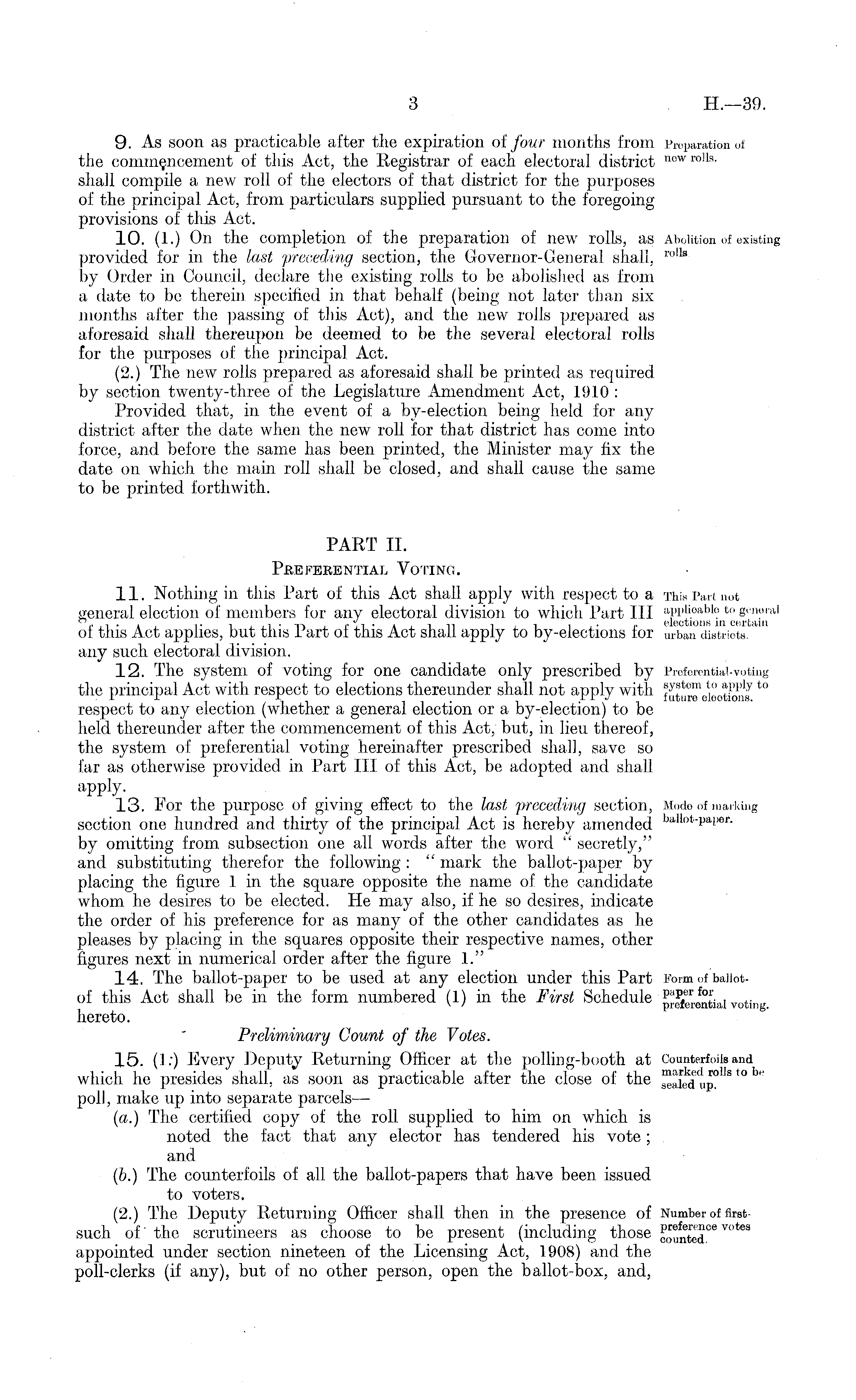 9. As soon as practicable after the expiration ai four months from the commencement of this Act, the Registrar of each electoral district shall compile a new roll of the electors of that district for the purposes of the principal Act, from particulars supplied pursuant to the foregoing provisions of this Act. 10. (1.) On the completion of the preparation of new rolls, as provided for in the last preceding section, the Governor-(General shall. by Order in Council, declare the existing rolls to be abolished as from a date to be therein specified in that behalf (being not later than six months after the passing of this Act), and the new rolls prepared as aforesaid shall thereupon be deemed to be the several electoral rolls for the purposes of the principal Act. (2.) The new rolls prepared as aforesaid shall be printed as required by section twenty-three of the Legislature Amendment Act, 1910 : Provided that, in the event of a by-election being held for any district after the date when the new roll for that district has come into force, and before the same has been printed, the Minister may fix the date on which the main roll shall be closed, and shall cause the same to be printed forthwith. PART 11. Preferential Voting. 11. Nothing in this Part of this Act shall apply with respect to a general election of members for any electoral division to which Part 111 of this Act applies, but this Part of this Act shall apply to by-elections for any such electoral division. 12. The system of voting for one candidate only prescribed by the principal Act with respect to elections thereunder shall not apply with respect to any election (whether a general election or a by-election) to be held thereunder after the commencement of this Act, but, in lieu thereof, the system of preferential voting hereinafter prescribed shall, save so far as otherwise provided in Part 111 of this Act, be adopted and shall apply. 13. Eor the purpose of giving effect to the last preceding section, section one hundred and thirty of the principal Act is hereby amended by omitting from subsection one all words after the word " secretly," and substituting therefor the following : " mark the ballot-paper by placing the figure 1 in the square opposite the name of the candidate whom he desires to be elected. He may also, if he so desires, indicate the order of his preference for as many of the other candidates as he pleases by placing in the squares opposite their respective names, other figures next in numerical order after the figure 1." 14. The ballot-paper to be used at any election under this Part of this Act shall be in the form numbered (1) in the First Schedule hereto. Preliminary Count of the Votes. 15. (1:) Every Deputy Returning Officer at the polling-booth at which he presides shall, as soon as practicable after the close of the poll, make up into separate parcels— (a.) The certified copy of the roll supplied to him on which is noted the fact that any elector has tendered his vote; and (b.) The counterfoils of all the ballot-papers that have been issued to voters. (2.) The Deputy Returning Officer shall then in the presence of such of' the scrutineers as choose to be present (including those appointed under section nineteen of the Licensing Act, 1908) and the poll-clerks (if any), but of no other person, open the ballot-box, and,