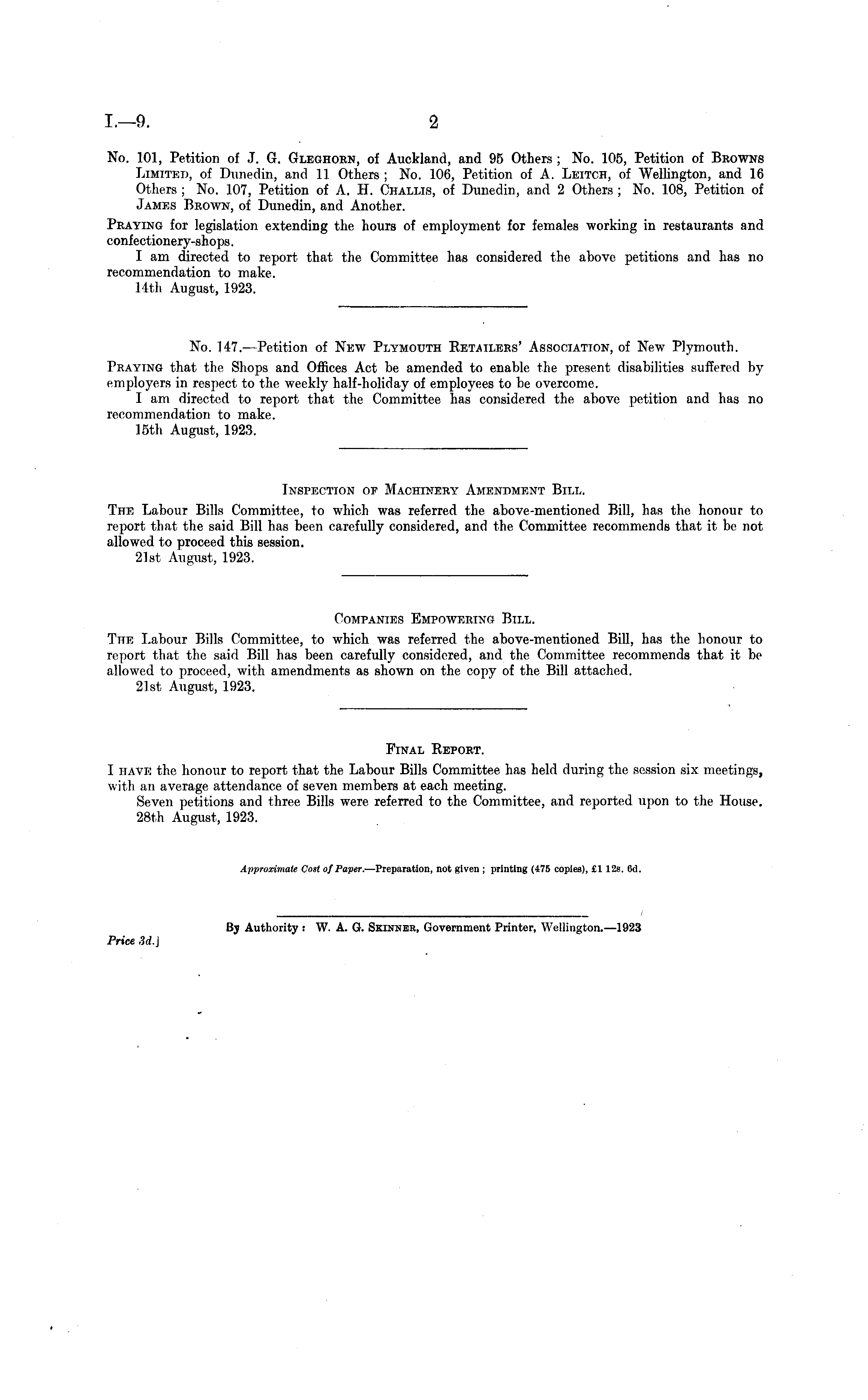 Final Report. I have the honour to report that the Labour Bills Committee has held during the session six meetings, with an average attendance of seven members at each meeting. Seven petitions and three Bills were referred to the Committee, and reported upon to the House. 28th August, 1923.