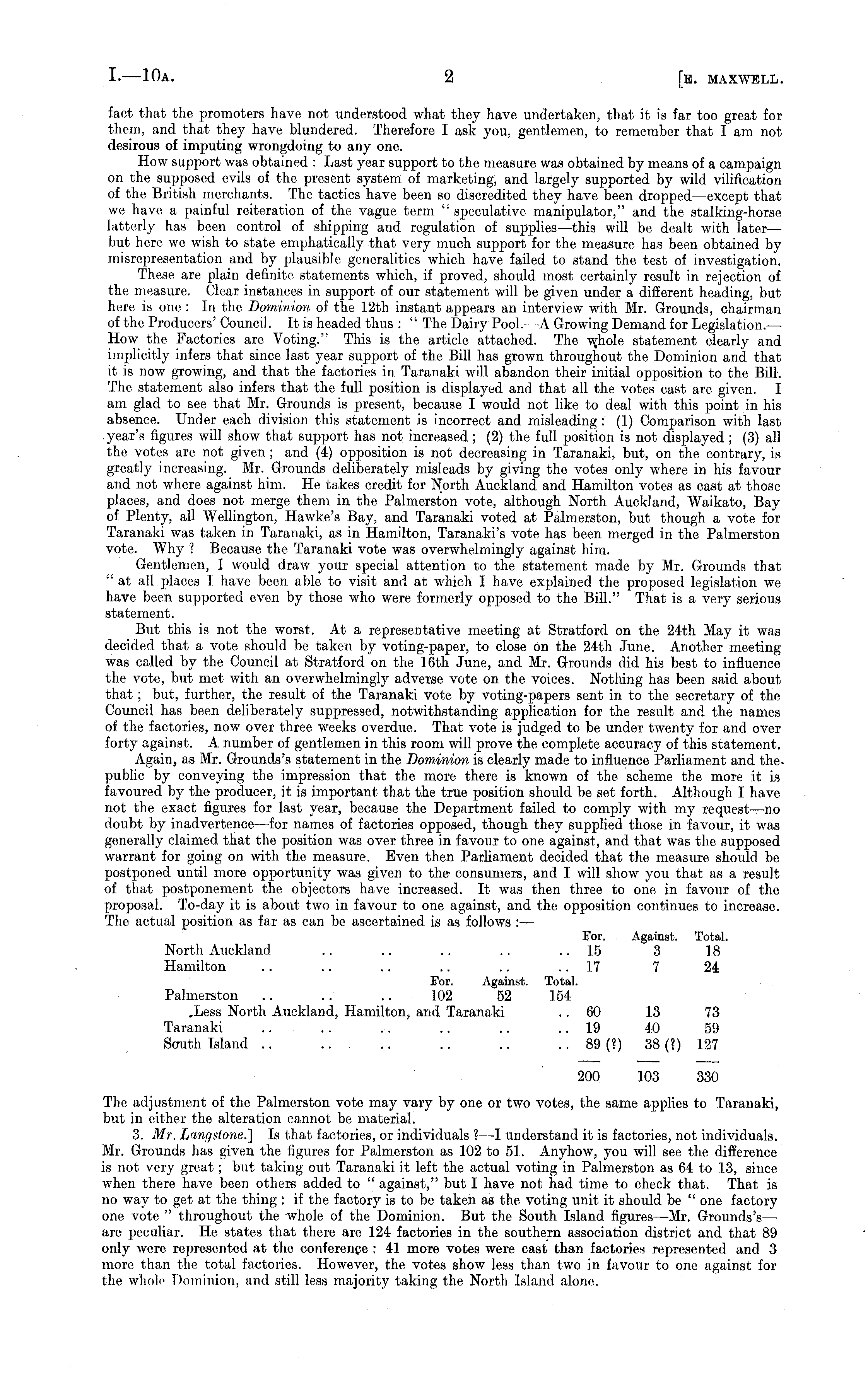 fact that the promoters have not understood what they have undertaken, that it is far too great for them, and that they have blundered. Therefore I ask you, gentlemen, to remember that lam not desirous of imputing wrongdoing to any one. How support was obtained : Last year support to the measure was obtained by means of a campaign on the supposed evils of the present system of marketing, and largely supported by wild vilification of the British merchants. The tactics have been so discredited they have been dropped —except that we have a painful reiteration of the vague term " speculative manipulator," and the stalking-horse latterly has been control of shipping and regulation of supplies—this will bo dealt with later— but here we wish to state emphatically that very much support for the measure has been obtained by misrepresentation and by plausible generalities which have failed to stand the test of investigation. These are plain definite statements which, if proved, should most certainly result in rejection of the measure. Clear instances in support of our statement will be given under a different heading, but here is one : In the Dominion of the 12th instant appears an interview with Mr. Grounds, chairman of the Producers' Council. It is headed thus : " The Dairy Pool.—A Growing Demand for Legislation.— How the Factories are Voting." This is the article attached. The w,hole statement clearly and implicitly infers that since last year support of the Bill has grown throughout the Dominion and that it is now growing, and that the factories in Taranaki will abandon their initial opposition to the Bill. The statement also infers that the full position is displayed and that all the votes cast are given. I am glad to see that Mr. Grounds is present, because I would not like to deal with this point in his absence. Under each division this statement is incorrect and misleading : (1) Comparison with last year's figures will show that support has not increased ; (2) the full position is not displayed ; (3) all the votes are not given ; and (4) opposition is not decreasing in Taranaki, but, on the contrary, is greatly increasing. Mr. Grounds deliberately misleads by giving the votes only where in his favour and not where against him. He takes credit for North Auckland and Hamilton votes as cast at those places, and does not merge them in the Palmerston vote, although North Auckland, Waikato, Bay of Plenty, all Wellington, Hawke's Bay, and Taranaki voted at Palmerston, but though a vote for Taranaki was taken in Taranaki, as in Hamilton, Taranaki's vote has been merged in the Palmerston vote. Why ? Because the Taranaki vote was overwhelmingly against him. Gentlemen, I would draw your special attention to the statement made by Mr. Grounds that "at all.places I have been able to visit and at which I have explained the proposed legislation we have been supported even by those who were formerly opposed to the Bill." That is a very serious statement. But this is not the worst. At a representative meeting at Stratford on the 24th May it was decided that a vote should be taken by voting-paper, to close on the 24th June. Another meeting was called by the Council at Stratford, on the 16th June, and Mr. Grounds did his best to influence the vote, but met with an overwhelmingly adverse vote on the voices. Nothing has been said about that; but, further, the result of the Taranaki vote by voting-papers sent in to the secretary of the Council has been deliberately suppressed, notwithstanding application for the result and the names of the factories, now over three weeks overdue. That vote is judged to be under twenty for and over forty against. A number of gentlemen in this room will prove the complete accuracy of this statement. Again, as Mr. Grounds's statement in the Dominion is clearly made to influence Parliament and the. public by conveying the impression that the more there is known of the scheme the more it is favoured by the producer, it is important that the true position should be set forth. Although I have not the exact figures for last year, because the Department failed to comply with my request —no doubt by inadvertence—for names of factories opposed, though they supplied those in favour, it was generally claimed that the position was over three in favour to one against, and that was the supposed warrant for going on with the measure. Even then Parliament decided that the measure should be postponed until more opportunity was given to the consumers, and I will show you that as a result of that postponement the objectors have increased. It was then three to one in favour of the proposal. To-day it is about two in favour to one against, and the opposition continues to increase. The actual position as far as can be ascertained is as follows : — For. Against. Total. North Auckland .. .. .. .. .. 15 3 18 Hamilton .. .. .. ..17 7 24 For. Against. Total. Palmerston .. .. .. 102 52 154 .Less North Auckland, Hamilton, and Taranaki .. 60 13 73 Taranaki .. .. .. .. .. .. 19 40 59 South Island .. .. .. .. .. .. 89 (?) 38 (?) 127 200 103 330 The adjustment of the Palmerston vote may vary by one or two votes, the same applies to Taranaki, but in either the alteration cannot be material. 3. Mr. Langstone.] Is that factories, or individuals ? —I understand it is factories, not individuals. Mr. Grounds has given the figures for Palmerston as 102 to 51. Anyhow, you will see the difference is not very great; but taking out Taranaki it left the actual voting in Palmerston as 64 to 13, siuce when there have been others added to " against," but I have not had time to check that. That is no way to get at the thing : if the factory is to be taken as the voting unit it should be " one factory one vote " throughout the whole of the Dominion. But the South Island figures—Mr. Grounds's— are peculiar. He states that there are 124 factories in the southern association district and that 89 only were repre