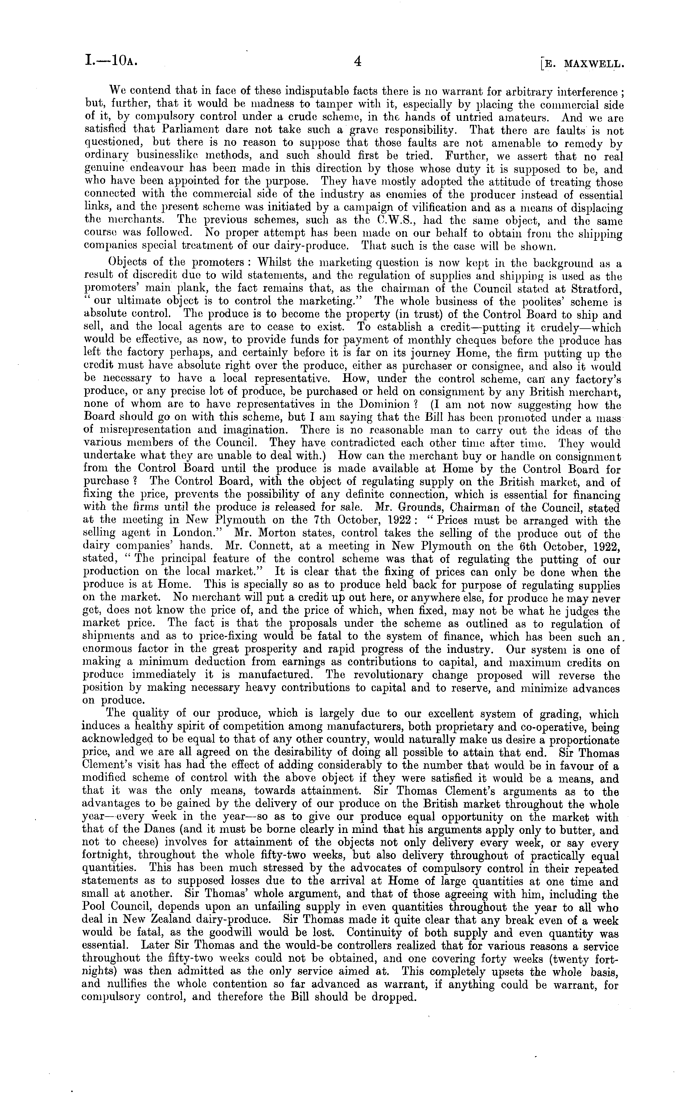 We contend that in face of these indisputable facts there is no warrant for arbitrary interference ; but, further, that it would be madness to tamper with it, especially by placing the commercial side of it, by compulsory control under a crude scheme, in the hands of untried amateurs. And we arc satisfied that Parliament dare not take such a grave responsibility. That there are faults is not questioned, but there is no reason to suppose that those faults are not amenable to remedy by ordinary businesslike methods, and such should first be tried. Further, we assert that no real genuine endeavour has been made in this direction by those whose duty it is supposed to be, and who have been appointed for the purpose. They have mostly adopted the attitude of treating those connected with the commercial side of the industry as enemies of the producer instead of essential links, and the present scheme was initiated by a campaign of vilification and as a means of displacing the merchants. The previous schemes, such as the C.W.S., had the same object, and the same course was followed. No proper attempt has been made on our behalf to obtain from the shipping companies special treatment of our dairy-produce. That such is the case will be shown. Objects of the promoters : Whilst tho marketing question is now kept in the background as a result of discredit due to wild statements, and the regulation of supplies and shipping is used as the promoters' main plank, the fact remains that, as the chairman of the Council stated at Stratford, "our ultimate object is to control the marketing." The whole business of the poolites' scheme is absolute control. The produce is to become the property (in trust) of the Control Board to ship and sell, and the local agents are to cease to exist. To establish a credit—putting it crudely—which would be effective, as now, to provide funds for payment of monthly cheques before the produce has left the factory perhaps, and certainly before it is far on its journey Home, the firm putting up the credit must have absolute right over the produce, either as purchaser or consignee, and also it would be necessary to have a local representative. How, under the control scheme, can' any factory's produce, or any precise lot of produce, be purchased or held on consignment by any British merchant, none of whom are to have representatives in the Dominion ? (I am not now suggesting how the Board should go on with this scheme, but I am saying that the Bill has been promoted under a mass of misrepresentation and imagination. There is no reasonable man to carry out the ideas of the various members of the Council. They have contradicted each other time after time. They would undertake what they are unable to deal with.) How can the merchant buy or handle on consignment from the Control Board until the produce is made available at Home by the Control Board for purchase ? The Control Board, with the object of regulating supply on the British market, and of fixing the price, prevents the possibility of any definite connection, which is essential for financing with the firms until the produce is released for sale. Mr. Grounds, Chairman of the Council, stated at the meeting in New Plymouth on the 7th October, 1922 : " Prices must be arranged with the selling agent in London." Mr. Morton states, control takes the selling of the produce out of the dairy companies' hands. Mr. Connett, at a meeting in New Plymouth on the 6th October, 1922, stated, " The principal feature of the control scheme was that of regulating the putting of our production on the local market." It is clear that the fixing of prices can only be done when the produce is at Home. This is specially so as to produce held back for purpose of regulating supplies on the market. No merchant will put a credit up out here, or anywhere else, for produce he may never get, does not know the price of, and the price of which, when fixed, may not be what he judges the market price. The fact is that the proposals under the scheme as outlined as to regulation of shipments and as to price-fixing would be fatal to the system of finance, which has been such an. enormous factor in the great prosperity and rapid progress of the industry. Our system is one of making a minimum deduction from earnings as contributions to capital, and maximum credits on produce immediately it is manufactured. The revolutionary change proposed will reverse the position by making necessary heavy contributions to capital and to reserve, and minimize advances on produce. The quality of our produce, which is largely due to our excellent system of grading, which induces a healthy spirit of competition among manufacturers, both proprietary and co-operative, being acknowledged to be equal to that of any other country, would naturally make us desire a proportionate price, and we are all agreed on the desirability of doing all possible to attain that end. Sir Thomas Clement's visit has had the effect of adding considerably to the number that would be in favour of a modified scheme of control with the above object if they were satisfied it would be a means, and that it was the only means, towards attainment. Sir Thomas Clement's arguments as to the advantages to be gained by the delivery of our produce on the British market throughout the whole year —every week in the year —so as to give our produce equal opportunity on the market with that of the Danes (and it must be borne clearly in mind that his arguments apply only to butter, and not to cheese) involves for attainment of the objects not only delivery every week, or say every fortnight, throughout the whole fifty-two weeks, but also delivery throughout of practically equal quantities. This has been much stressed by the advocates of compulsory control in their repeated statements as to supposed losses due to the arrival at Home of large quantities at one time and small at another. Sir Thomas' whole argument, and that of those