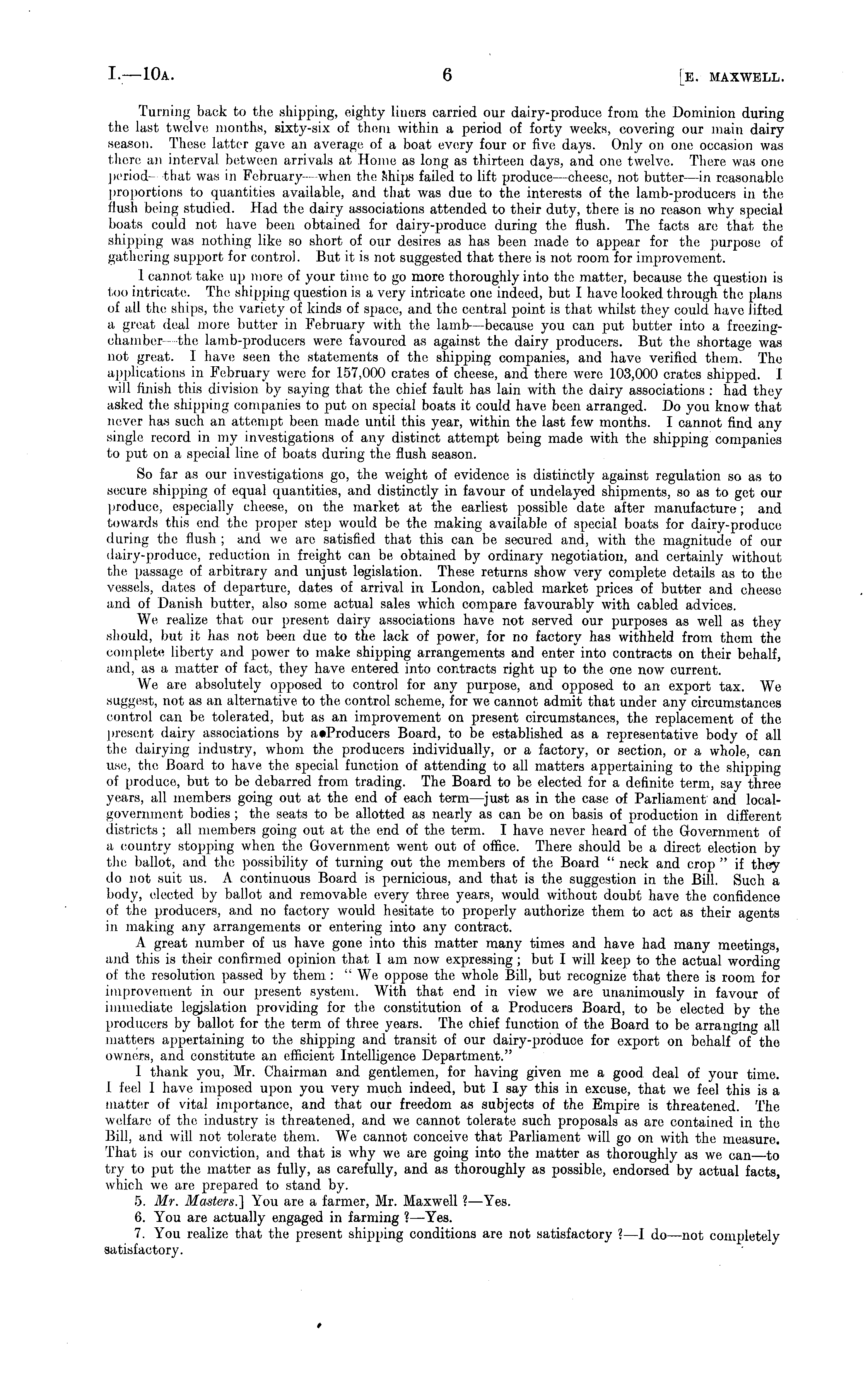 Turning back to the shipping, eighty liners carried our dairy-produce from the Dominion during the last twelve months, sixty-six of them within a period of forty weeks, covering our main dairy season. These latter gave an average of a boat every four or five days. Only on one occasion was there an interval between arrivals at Home as long as thirteen days, and one twelve. There was one period— that was in February—when the ships failed to lift produce —cheese, not butter —in reasonable proportions to quantities available, and that was due to the interests of the lamb-producers in the flush being studied. Had the dairy associations attended to their duty, there is no reason why special boats could not have been obtained for dairy-produce during the flush. The facts are that the shipping was nothing like so short of our desires as has been made to appear for the purpose of gathering support for control. But it is not suggested that there is not room for improvement. I cannot take up more of your time to go more thoroughly into the matter, because the question is too intricate. The shipping question is a very intricate one indeed, but I have looked through the plans of all the ships, the variety of kinds of space, and the central point is that whilst they could have lifted a great deal more butter in February with the lamb—because you can put butter into a freezingchamber- the lamb-producers were favoured as against the dairy producers. But the shortage was not great. I have seen the statements of the shipping companies, and have verified them. The applications in February were for 157,000 crates of cheese, and there were 103,000 crates shipped. I will finish this division by saying that the chief fault has lain with the dairy associations : had they asked the shipping companies to put on special boats it could have been arranged. Do you know that never has such an attempt been made until this year, within the last few months. I cannot find any single record in my investigations of any distinct attempt being made with the shipping companies to put on a special line of boats during the flush season. So far as our investigations go, the weight of evidence is distinctly against regulation so as to secure shipping of equal quantities, and distinctly in favour of undelaycd shipments, so as to get our produce, especially cheese, on the market at the earliest possible date after manufacture; and towards this end the proper step would be the making available of special boats for dairy-produce during the flush ; and we are satisfied that this can be secured and, with the magnitude of our dairy-produce, reduction in freight can be obtained by ordinary negotiation, and certainly without the passage of arbitrary and unjust legislation. These returns show very complete details as to the vessels, dates of departure, dates of arrival in London, cabled market prices of butter and cheese and of Danish butter, also some actual sales which compare favourably with cabled advices. We realize that our present dairy associations have not served our purposes as well as they should, but it has not been due to the lack of power, for no factory has withheld from thorn the complete liberty and power to make shipping arrangements and enter into contracts on their behalf, and, as a matter of fact, they have entered into contracts right up to the one now current. We are absolutely opposed to control for any purpose, and opposed to an export tax. We suggest, not as an alternative to the control scheme, for we cannot admit that under any circumstances control can be tolerated, but as an improvement on present circumstances, the replacement of the present dairy associations by a»Producers Board, to be established as a representative body of all the dairying industry, whom the producers individually, or a factory, or section, or a whole, can use, the Board to have the special function of attending to all matters appertaining to the shipping of produce, but to be debarred from trading. The Board to bo elected for a definite term, say three years, all members going out at the end of each term —just as in the case of Parliament and localgovernment bodies ; the seats to be allotted as nearly as can be on basis of production in different districts ; all members going out at the end of the term. I have never heard of the Government of a country stopping when the Government went out of office. There should be a direct election by the ballot, and the possibility of turning out the members of the Board " neck and crop " if they do not suit us. A continuous Board is pernicious, and that is the suggestion in tho Bill. Such a body, elected by ballot and removable every three years, would without doubt have the confidence of the producers, and no factory would hesitate to properly authorize them to act as their agents in making any arrangements or entering into any contract. . A great number of us have gone into this matter many times and have had many meetings, and this is their confirmed opinion that I am now expressing ; but I will keep to the actual wording of the resolution passed by them : " We oppose the whole Bill, but recognize that there is room for improvement in our present system. With that end in view we are unanimously in favour of immediate legislation providing for the constitution of a Producers Board, to be elected by the producers by ballot for the term of three years. The chief function of the Board to be arranging all matters appertaining to the shipping and transit of our dairy-produce for export on behalf of the owners, and constitute an efficient Intelligence Department." I thank you, Mr. Chairman and gentlemen, for having given me a good deal of your time. 1 feel I have imposed upon you very much indeed, but I say this in excuse, that we feel this is a matter of vital importance, and that our freedom as subjects of the Emjjire is threatened. The welfare of the industry is threatened, and we cannot t