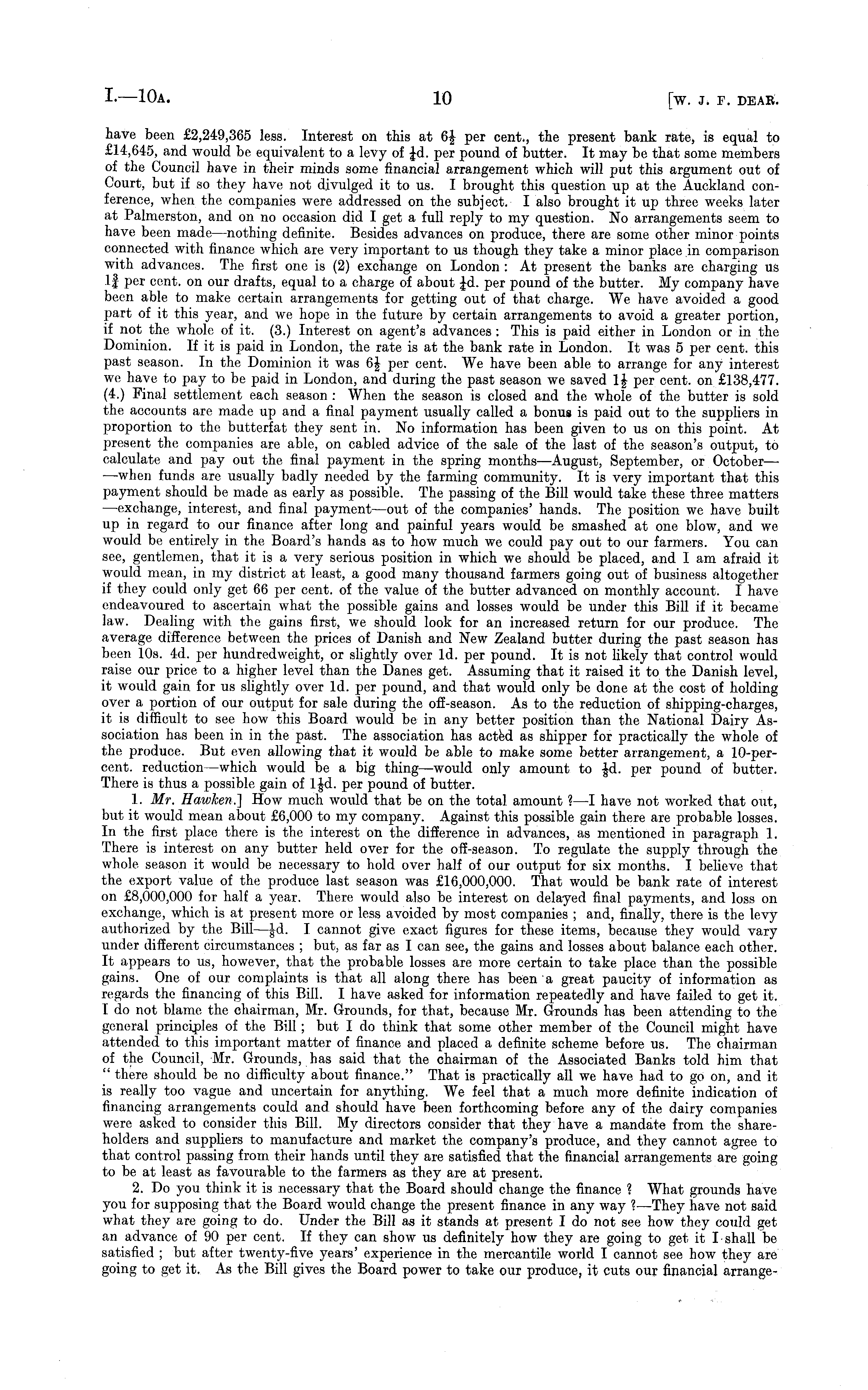 have been £2,249,365 less. Interest on this at 6| per cent., the present bank rate, is equal to £14,645, and would be equivalent to a levy of Jd. per pound of butter. It may be that some members of the Council have in their minds some financial arrangement which will put this argument out of Court, but if so they have not divulged it to us. I brought this question up at the Auckland conference, when the companies were addressed on the subject. I also brought it up three weeks later at Palmerston, and on no occasion did I get a full reply to my question. No arrangements seem to have been made—nothing definite. Besides advances on produce, there are some other minor points connected with finance which are very important to us though they take a minor place in comparison with advances. The first one is (2) exchange on London :At present the banks are charging us If per cent, on our drafts, equal to a charge of about Jd. per pound of the butter. My company have been able to make certain arrangements for getting out of that charge. We have avoided a good part of it this year, and we hope in the future by certain arrangements to avoid a greater portion, if not the whole of it. (3.) Interest on agent's advances : This is paid either in London or in the Dominion. If it is paid in London, the rate is at the bank rate in London. It was 5 per cent, this past season. In the Dominion it was 6| per cent. We have been able to arrange for any interest we have to pay to be paid in London, and during the past season we saved 1£ per cent, on £138,477. (4.) Final settlement each season : When the season is closed and the whole of the butter is sold the accounts are made up and a final payment usually called a bonus is paid out to the suppliers in proportion to the butterfat they sent in. No information has been given to us on this point. At present the companies are able, on cabled advice of the sale of the last of the season's output, to calculate and pay out the final payment in the spring months —August, September, or October— ■ —when funds are usually badly needed by the farming community. It is very important that this payment should be made as early as possible. The passing of the Bill would take these throe matters —exchange, interest, and final payment —out of the companies' hands. The position we have built up in regard to our finance after long and painful years would be smashed at one blow, and we would be entirely in the Board's hands as to how much we could pay out to our farmers. You can see, gentlemen, that it is a very serious position in which we should be placed, and I am afraid it would mean, in my district at least, a good many thousand farmers going out of business altogether if they could only get 66 per cent, of the value of the butter advanced on monthly account. I have endeavoured to ascertain what the possible gains and losses would be under this Bill if it became law. Dealing with the gains first, we should look for an increased return for our produce. The average difference between the prices of Danish and New Zealand butter during the past season has been 10s. 4d. per hundredweight, or slightly over Id. per pound. It is not likely that control would raise our price to a higher level than the Danes get. Assuming that it raised it to the Danish level, it would gain for us slightly over Id. per pound, and that would only be done at the cost of holding over a portion of our output for sale during the off-season. As to the reduction of shipping-charges, it is difficult to see how this Board would be in any better position than the National Dairy Association has been in in the past. The association has acted as shipper for practically the whole of the produce. But even allowing that it would be able to make some better arrangement, a 10-per-cent, reduction —which would be a big thing—would only amount to Jd. per pound of butter. There is thus a possible gain of ljd. per pound of butter. 1. Mr. Hawken] How much would that be on the total amount ? —I have not worked that out, but it would, mean about £6,000 to my company. Against this possible gain there are probable losses. In the first place there is the interest on the difference in advances, as mentioned in paragraph 1. There is interest on any butter held over for the off-season. To regulate the supply through the whole season it would be necessary to hold over half of our output for six months. I believe that the export value of the produce last season was £16,000,000. That would be bank rate of interest on £8,000,000 for half a year. There would also be interest on delayed final payments, and loss on exchange, which is at present more or less avoided by most companies ; and, finally, there is the levy authorized by the Bill—Jd. I. cannot give, exact figures for these items, because they would vary under different circumstances ; but, as far as I can see, the gains and losses about balance each other. It appears to us, however, that the probable losses are more certain to take place than the possible gains. One of our complaints is that all along there has been a great paucity of information as regards the financing of this Bill. I have asked for information repeatedly and have failed to get it. I do not blame the chairman, Mr. Grounds, for that, because Mr. Grounds has been attending to the general principles of the Bill ; but I do think that some other member of the Council might have attended to this important matter of finance and placed a definite scheme before us. The chairman of the Council, Mr. Grounds, has said that the chairman of the Associated Banks told him that " there should be no difficulty about finance." That is practically all we have had to go on, and it is really too vague and uncertain for anything. We feel that a much more definite indication of financing arrangements could and should have been forthcoming before any of the dairy companies were asked to consider this Bill. My dir