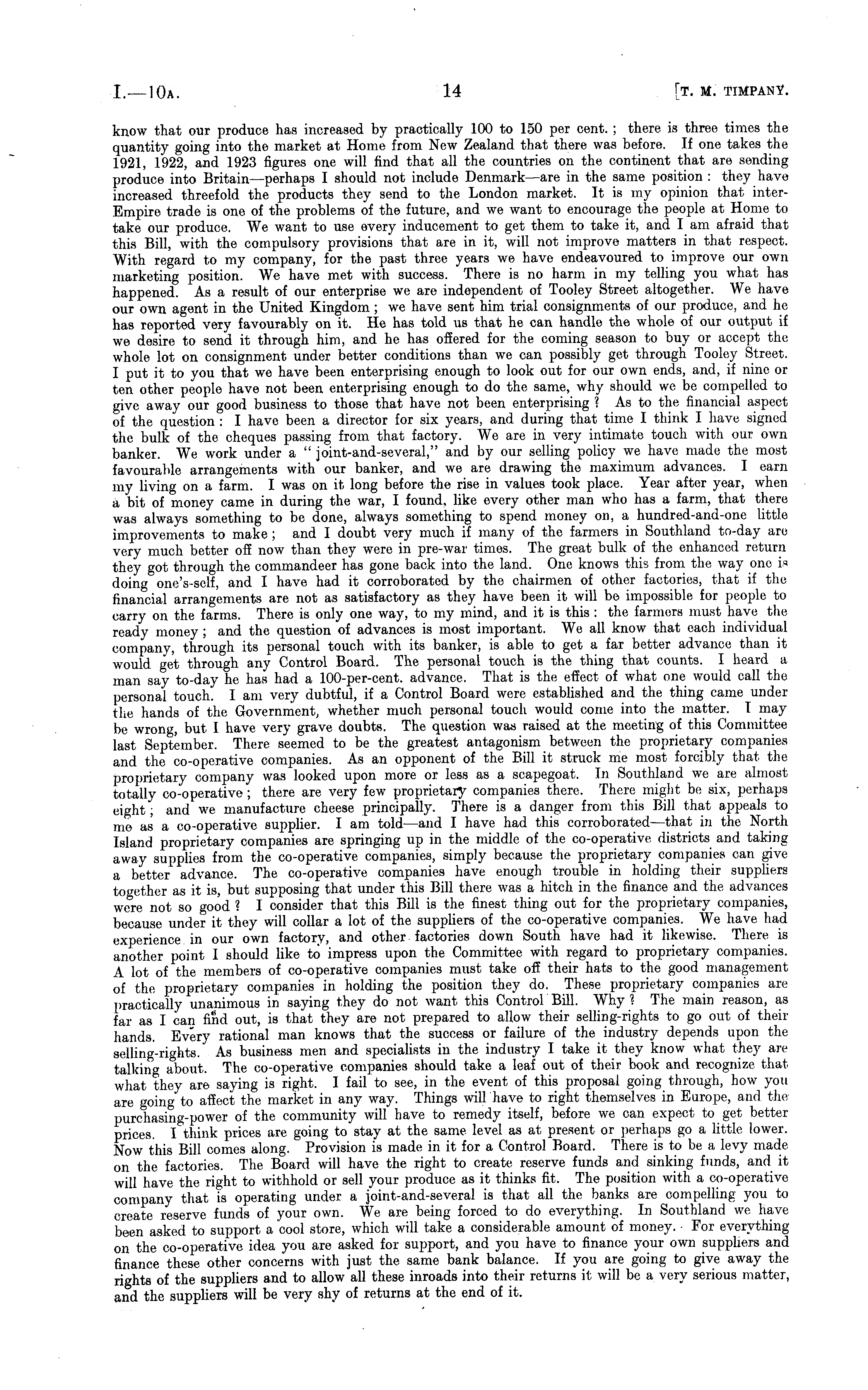 know that our produce has increased by practically 100 to 150 per cent. ; there is three times the quantity going into the market at Home from New Zealand that there was before. If one takes the 1921, 1922, and 1923 figures one will find that all the countries on the continent that are sending produce into Britain —perhaps I should not include Denmark —are in the same position : they have increased threefold the products they send to the London market. It is my opinion that interEmpire trade is one of the problems of the future, and we want to encourage tho people at Home to take our produce. We want to use every inducement to get them to take it, and lam afraid that this Bill, with the compulsory provisions that are in it, will not improve matters in that respect. With regard to my company, for the past three years we have endeavoured to improve our own marketing position. We have met with success. There is no harm in my telling you what has happened. As a result of our enterprise we are independent of Tooley Street altogether. We have our own agent in the United Kingdom ; we have sent him trial consignments of our produce, and he has reported very favourably on it. He has told us that he can handle the whole of our output if we desire to send it through him, and he has offered for the coming season to buy or accept the whole lot on consignment under better conditions than we can possibly get through Tooley Street. I put it to you that we have been enterprising enough to look out for our own ends, and, if nine or ten other people have not been enterprising enough to do the same, why should we be compelled to give away our good business to those that have not been enterprising ? As to the financial aspect of the question : I have been a director for six years, and during that time I think I have signed the bulk of the cheques passing from that factory. We are in very intimate touch with our own banker. We work under a " joint-and-several," and by our selling policy we have made the most favourable arrangements with our banker, and we are drawing the maximum advances. I earn my living on a farm. I was on it long before the rise in values took place. Year after year, when a bit of money came in during tho war, I found, like every other man who has a farm, that there was always something to be done, always something to spend money on, a hundred-and-one little improvements to make ; and I doubt very much if many of the farmers in Southland to-day are very much better off now than they were in pro-war times. The great bulk of the enhanced return they got through the commandeer has gone back into the land. One knows this from the way one is doing one's-self, and I have had it corroborated by the chairmen of other factories, that if tho financial arrangements are not as satisfactory as they have been it will be impossible for people to carry on the farms. There is only one way, to my mind, and it is this : the farmers must have the ready money ; and the question of advances is most important. Wo all know that each individual company, through its personal touch with its banker, is able to get a far better advance than it would get through any Control Board. The personal touch is the thing that counts. I heard a man say to-day he has had a 100-per-cent. advance. That is the effect of what one would call the personal touch. I am very dubtful, if a Control Board were established and the thing came under the hands of the Government, whether much personal touch would come into the matter. I may be wrong, but I have very grave doubts. The question was raised at the meeting of this Committee last September. There seemed to be the greatest antagonism between the proprietary companies and the co-operative companies. As an opponent of the Bill it struck me most forcibly that the proprietary company was looked upon more or less as a scapegoat. In Southland we are almost totally co-operative ; there are very few proprietary companies there. There might be six, perhaps eight; and we manufacture cheese principally. There is a danger from this Bill that appeals to me as a co-operative supplier. I am told —and I have had this corroborated —that in the North Island proprietary companies are springing up in the middle of the co-operative districts and taking away supplies from the co-operative companies, simply because the proprietary companies can give a better advance. The co-operative companies have enough trouble in holding their suppliers together as it is, but supposing that under this Bill there was a hitch in the finance and tho advances were not so good ? I consider that this Bill is the finest thing out for the proprietary companies, because under it they will collar a lot of the suppliers of the co-operative companies. We have had experience in our own factory, and other factories down South have had it likewise. There is another point I should like to impress upon the Committee with regard to proprietary companies. A lot of the members of co-operative companies must take off their hats to the good management of the proprietary companies in holding the position they do. These proprietary companies are practically unanimous in saying they do not want this Control Bill. Why ? The main reason, as far as I can find out, is that they are not prepared to allow their selling-rights to go out of their hands. Every rational man knows that the success or failure of tho industry depends upon the selling-rights. As business men and specialists in the industry I take it they know what they are talking about. The co-operative companies should take a leaf out of their book and recognize that what they are saying is right. I fail to see, in the event of this proposal going through, how you are going to affect the market in any way. Things will have to right themselves in Europe, and. the purchasing-power of the community will have to remedy itself, before we can expect to get better prices. I think prices are 