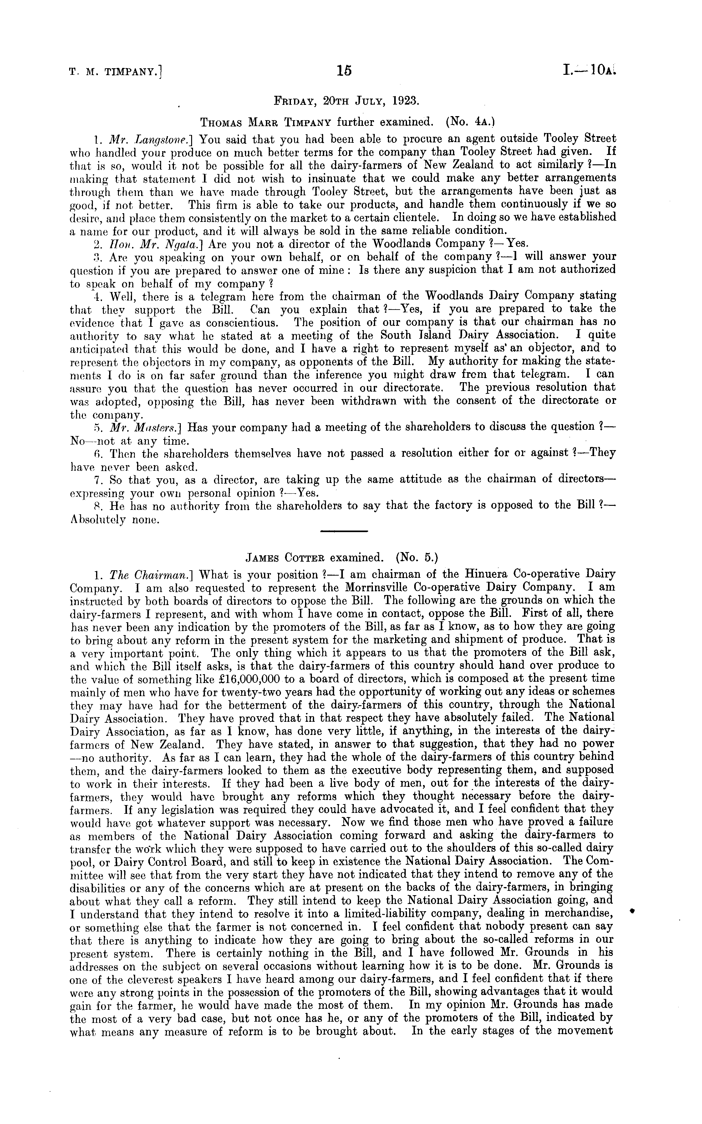 Friday, 20th July, 1923. Thomas Marr Timpany further examined. (No. 4a.) 1. Mr. Langstone.] You said that you had been able to procure an agent outside Tooley Street who handled your produce on much better terms for the company than Tooley Street had given. If that is so, would it not be possible for all the dairy-farmers of Now Zealand to act similarly ? —ln making that statement I did not wish to insinuate that we could make any better arrangements through them than we have made through Tooley Street, but the arrangements have been just as good, if not better. This firm is able to take our products, and handle them continuously if we so desire, and place them consistently on the market to a certain clientele. In doing so we have established a name for our product, and it will always be sold in the same reliable condition. 2. Hon. Mr. Ngala.] Are you not a director of the Woodlands Company ?—Yes. 3. Are you speaking on your own behalf, or on behalf of the company ? —1 will answer your question if you are prepared to answer one of mine : Is there any suspicion that I am not authorized to speak on behalf of my company ? 4. Well, there is a telegram here from the chairman of the Woodlands Dairy Company stating that they support the Bill. Can you explain that ? —Yes, if you are prepared to take the evidence that 1 gave as conscientious. The position of our company is that our chairman has no authority to say what he stated at a meeting of the South Island Dairy Association. I quite anticipated that this would be done, and I have a right to represent myself as' an objector, and to represent the objectors in my company, as opponents of the Bill. My authority for making the statements Idois on far safer ground than the inference you might draw from that telegram. I can assure you that the question has never occurred in our directorate. The previous resolution that was adopted, opposing the Bill, has never been withdrawn with the consent of the directorate or the company. 5. Mr. Masters.] Has your company had a meeting of the shareholders to discuss the question ? — No —not at any time. 6. Then the shareholders themselves have not passed a resolution either for or against ? —They have never been asked. 7. So that you, as a director, arc taking up the same attitude as the chairman of directors — expressing your own personal opinion ?—Yes. 8. He has no authority from the shareholders to say that the factory is opposed to the Bill ? — Absolutely none. James Cotter examined. (No. 5.) 1. The Chairman.] What is your position ?—I am chairman of the Hinuera Co-operative Dairy Company. I am also requested to represent the Morrinsville Co-operative Dairy Company. I am instructed by both boards of directors to oppose the Bill. The following are the grounds on which the dairy-farmers I represent, and with whom I have come in contact, oppose the Bill. First of all, there has never been any indication by tho promoters of the Bill, as far as I know, as to how they are going to bring about any reform in the present system for the marketing and shipment of produce. That is a very important point. The only thing which it appears to us that the promoters of tho Bill ask, and which the Bill itself asks, is that the dairy-farmers of this country should hand over produce to the value of something like £16,000,000 to a board of directors, which is composed at the present time mainly of men who have for twenty-two years had the opportunity of working out any ideas or schemes they may have had for the betterment of the dairy-farmers of this country, through the National Dairy Association. They have proved that in that respect they have absolutely failed. The National Dairy Association, as far as I know, has done very little, if anything, in the interests of the dairyfarmers of New Zealand. They have stated, in answer to that suggestion, that they had no power —no authority. As far as I can learn, they had the whole of the dairy-farmers of this country behind them, and the dairy-farmers looked to them as the executive body representing them, and supposed to work in their interests. If they had been a live body of men, out for the interests of the dairyfarmers, they Would have brought any reforms which they thought necessary before the dairyfarmers. If any legislation was required they could have advocated it, and I feel confident that they would have got whatever support was necessary. Now we find those men who have proved a failure as members of the National Dairy Association coming forward and asking the dairy-farmers to transfer the wo"rk which they were supposed to have carried out to the shoulders of this so-called dairy pool, or Dairy Control Board, and still to keep in existence the National Dairy Association. The Committee will see that from the very start they have not indicated that they intend to remove any of the disabilities or any of the concerns which are at present on the backs of the dairy-farmers, in bringing about what they call a reform. They still intend to keep the National Dairy Association going, and I understand that they intend to resolve it into a limited-liability company, dealing in merchandise, or something else that the farmer is not concerned in. I feel confident that nobody present can say that there is anything to indicate how they are going to bring about the so-called reforms in our present system. There is certainly nothing in the Bill, and I have followed Mr. Grounds in his addresses on the subject on several occasions without learning how it is to be done. Mr. Grounds is one of the cleverest speakers I have heard among our dairy-farmers, and I feel confident that if there were any strong points in the possession of the promoters of the Bill, showing advantages that it would gain for the farmer, he would have made the most of them. In my opinion Mr. Grounds has made the most of a very bad case, but not once has he, or any of the promoters of the Bill, indica