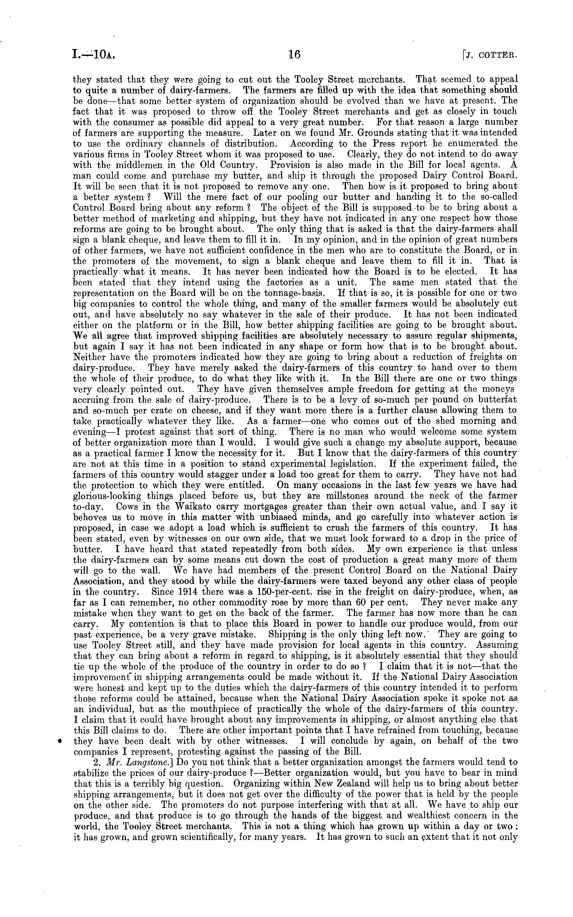they stated that they were going to cut out the Tooley Street merchants. That seemed to appeal to quite a number of dairy-farmers. The farmers are filled up with the idea that something should be done —that some better system of organization should be evolved than we have at present. The fact that it was proposed to throw off the Tooley Street merchants and get as closely in touch with the consumer as possible did appeal to a very great number. For that reason a large number of farmers are supporting the measure. Later on we found Mr. Grounds stating that it was intended to use the ordinary channels of distribution. According to tho Press report he enumerated the various firms in Tooley Street whom it was proposed to use. Clearly, they do not intend to do away with the middlemen in the Old Country. Provision is also made in the Bill for local agents. A man could come and purchase my butter, and ship it through the proposed Dairy Control Board. It will be seen that it is not proposed to remove any one. Then how is it proposed to bring about a better system ? Will the mere fact of our pooling our butter and handing it to the so-called Control Board bring about any reform ? The object of the Bill is supposed.to bo to bring about a better method of marketing and shipping, but they have not indicated in any one respect how those reforms are going to be brought about. The only thing that is asked is that the dairy-farmers shall sign a blank cheque, and leave them to fill it in. In my opinion, and in the opinion of great numbers of other farmers, we have not sufficient confidence in the men who are to constitute the Board, or in the promoters of the movement, to sign a blank cheque and leave them to fill it in. That is practically what it means. It has never been indicated how the Board is to be elected. It has been stated that they intend using the factories as a unit. The same men stated that the representation on the Board will bo on the tonnage-basis. If that is so, it is possible for one or two big companies to control the whole thing, and many of the smaller farmers would be absolutely cut out, and have absolutely no say whatever in the sale of their produce. It has not been indicated either on the platform or in the Bill, how better shipping facilities are going to be brought about. We all agree that improved shipping facilities are absolutely necessary to assure regular shipments, but again I say it has not been indicated in any shape or form how that is to be brought about. Neither have the promoters indicated how they are going to bring about a reduction of freights on dairy-produce. They have merely asked the dairy-farmers of this country to hand over to them the whole of their produce, to do what they like with it. In the Bill there are one or two things very clearly pointed out. They have given themselves ample freedom for getting at the moneys accruing from the sale of dairy-produce. There is to be a levy of so-much per pound on butterfat and so-much per crate on cheese, and if they want more there is a further clause allowing them to take practically whatever they like. As a farmer —one who comes out of the shed morning and evening—l protest against that sort of thing. There is no man who would welcome some system of better organization more than I would. I would give such a change my absolute support, because as a practical farmer I know the necessity for it. But I know that the dairy-farmers of this country are not at this time in a position to stand experimental legislation. If the experiment failed, the farmers of this country would stagger under a load too great for them to carry. They have not had the protection to which they were entitled. On many occasions in the last few years we have had glorious-looking things placed before us, but they are millstones around the neck of the farmer to-day. Cows in the Waikato carry mortgages greater than their own actual value, and I say it behoves us to move in this matter with unbiased minds, and go carefully into whatever action is proposed, in case we adopt a load which is sufficient to crush the farmers of this country. It has been stated, even by witnesses on our own side, that we must look forward to a drop in the price of butter. I have heard that stated repeatedly from both sides. My own experience is that unless the dairy-farmers can by some means cut down the cost of production a great many more of them will go to the wall. We have had members of the present Control Board on the National Dairy Association, and they stood by while the dairy-farmers were taxed beyond any other class of people in the country. Since 1914 there was a 150-per-cent. rise in the freight on dairy-produce, when, as far as I can remember, no other commodity rose by more than 60 per cent. They never make any mistake when they want to get on the back of the farmer. The farmer has now more than he can carry. My contention is that to place this Board in power to handle our produce would, from our past experience, be a very grave mistake. Shipping is the only thing left now.' They are going to use Tooley Street still, and they have made provision for local agents in this country. Assuming that they can bring about a reform in regard.to shipping, is it absolutely essential that they should tie up the whole of the produce of the country in order to do so ? I claim that it is not —that the improvement" in shipping arrangements could be made without it. If the National Dairy Association were honest and kept up to the duties which the dairy-farmers of this country intended it to perform those reforms could be attained, because when the National Dairy Association spoke it spoke not as an individual, but as the mouthpiece of practically the whole of the dairy-farmers of this country. I claim that it could have brought about any improvements in shipping, or almost anything else that this Bill claims to do. There are other important points that I have refrain