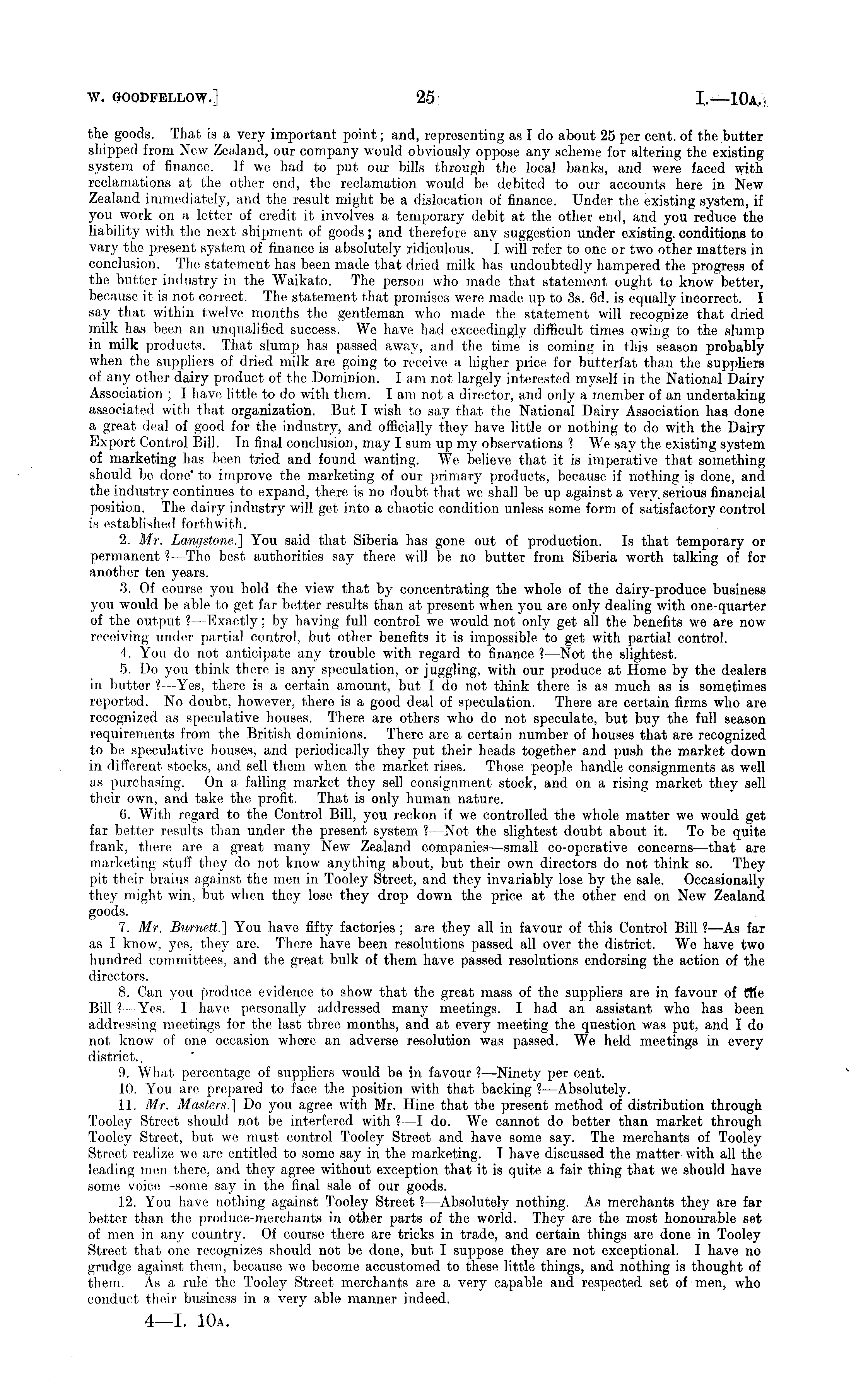 the goods. That is a very important point; and, representing as Ido about 25 per cent, of the butter shipped from New Zealand, our company would obviously oppose any scheme for altering the existing system of finance. If we had to put our bills through the local banks, and were faced with reclamations at the other end, the reclamation would be debited to our accounts here in New Zealand immediately, and the result might be a dislocation of finance. Under the existing system, if you work on a letter of credit it involves a temporary debit at the other end, and you reduce the liability with the next shipment of goods; and therefore any suggestion under existing, conditions to vary the present system of finance is absolutely ridiculous. I will refer to one or two other matters in conclusion. The statement has been made that dried milk has undoubtedly hampered the progress of the butter industry in the Waikato. The person who made that statement ought to know better, because it is not correct. The statement that promises were made up to 3s. 6d. is equally incorrect. I say that within twelve months tho gentleman who made the statement will recognize that dried milk has been an unqualified success. We have had exceedingly difficult times owing to the slump in milk products. That slump has passed away, and the time is coming in this season probably when the suppliers of dried milk are going to receive a higher price for butterfat than the suppliers of any other dairy product of the Dominion. lam not largely interested myself in the National Dairy Association ; I have little to do with them. lam not a director, and only a member of an undertaking associated with that organization. But I wish to say that the National Dairy Association has done a great deal of good for the industry, and officially they have little or nothing to do with the Dairy Export Control Bill. In final conclusion, may I sum up my observations ? We say the existing system of marketing has been tried and found wanting. We believe that it is imperative that something should be done' to improve the marketing of our primary products, because if nothing is done, and the industry continues to expand, there is no doubt that wo shall be up against a very serious financial position. The dairy industry will get into a chaotic condition unless some form of satisfactory control is established forthwith. 2. Mr. Langstone.] You said that Siberia has gone out of production. Is that temporary or permanent ? —The best authorities say there will be no butter from Siberia worth talking of for another ten years. 3. Of course you hold the view that by concentrating the whole of the dairy-produce business you would be able to get far better results than at present when you are only dealing with one-quarter of the output ? —Exactly; by having full control we would not only get all the benefits we are now receiving under partial control, but other benefits it is impossible to get with partial control. 4. You do not anticipate any trouble with regard to finance ? —Not the slightest. 5. Do you think there is any speculation, or juggling, with our produce at Home by the dealers in butter ?—Yes, there is a certain amount, but I do not think there is as much as is sometimes reported. No doubt, however, there is a good deal of speculation. There are certain firms who are recognized as speculative houses. There are others who do not speculate, but buy the full season requirements from the British dominions. There are a certain number of houses that are recognized to be speculative houses, and periodically they put their heads together and push the market down in different stocks, and sell them when the market rises. Those people handle consignments as well as purchasing. On a falling market they sell consignment stock, and on a rising market they sell their own, and take the profit. That is only human nature. 6. With regard to the Control Bill, you reckon if we controlled the whole matter we would get far better results than under the present system ? —Not the slightest doubt about it. To be quite frank, there are a great many New Zealand companies—small co-operative concerns —that are marketing stuff they do not know anything about, but their own directors do not think so. They pit their brains against the men in Tooley Street, and they invariably lose by the sale. Occasionally they might win, but when they lose they drop down the price at the other end on New Zealand goods. 7. Mr. Burnett.] You have fifty factories ; are they all in favour of this Control Bill ? —As far as I know, yes, they are. There have been resolutions passed all over the district. We have two hundred committees, and the great bulk of them have passed resolutions endorsing the action of the directors. 8. Can you produce evidence to show that the great mass of the suppliers are in favour of the Bill ?—Yes. I have personally addressed many meetings. I had an assistant who has been addressing meetings for the last three months, and at every meeting the question was put, and I do not know of one occasion where an adverse resolution was passed. We held meetings in every district., 9. What percentage of suppliers would be in favour ? —Ninety per cent. 10. You are prepared to face the position with that backing ?—Absolutely. 11. Mr. Masters.] Do you agree with Mr. Hine that the present method of distribution through Tooley Street should not be interfered with ? —I do. We cannot do better than market through Tooley Street, but we must control Tooley Street and have some say. The merchants of Tooley Street realize we are entitled to some say in the marketing. I have discussed the matter with all the leading men there, and they agree without exception that it is quite a fair thing that we should have some voice—some say in the final sale of our goods. 12. You have nothing against Tooley Street ? —Absolutely nothing. As merchants they are far better than the produce-