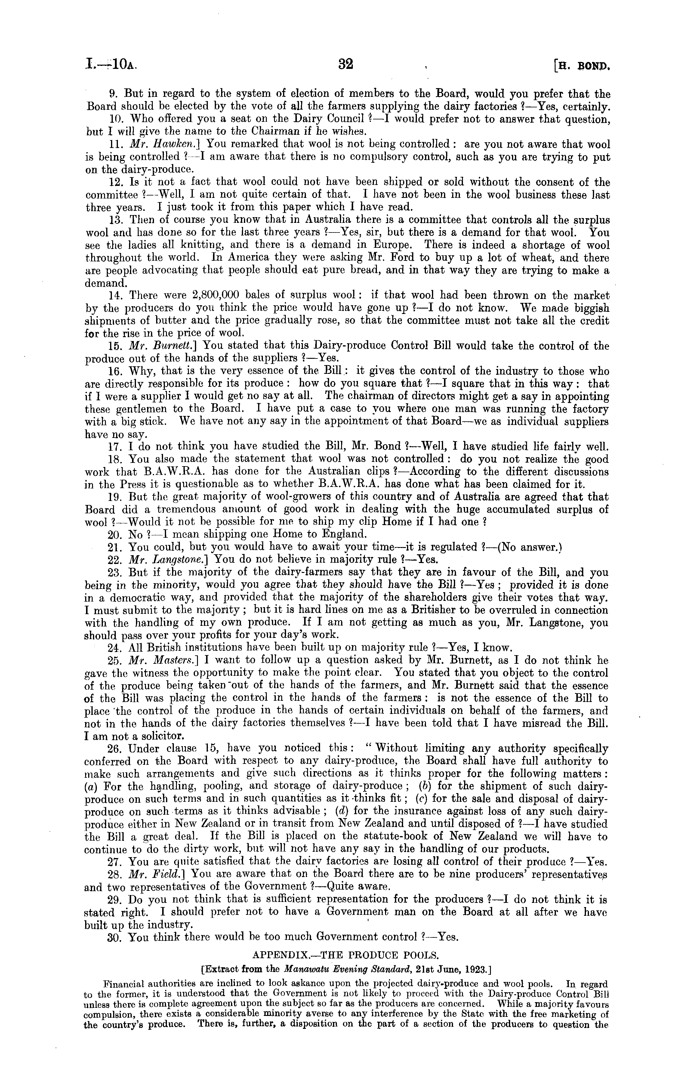 9. But in regard to the system of election of members to the Board, would you prefer that the Board should be elected by the vote of all the farmers supplying the dairy factories ? —Yes, certainly. 10. Who offered you a seat on the Dairy Council ?—I would prefer not to answer that question, but I will give the name to the Chairman if he wishes. 11. Mr. Hawken.] You remarked that wool is not being controlled : are you not aware that wool is being controlled ? —I am aware that there is no compulsory control, such as you are trying to put on the dairy-produce. 12. Is it not a fact that wool could not have been shipped or sold without the consent of the committee ?—Well, lam not quite certain of that. I have not been in the wool business these last three years. I just took it from this paper which I have read. 13. Then of course you know that in Australia there is a committee that controls all the surplus wool and has done so for the last three years ?—Yes, sir, but there is a demand for that wool. You see the ladies all knitting, and there is a demand in Europe. There is indeed a shortage of wool throughout the world. In America they were asking Mr. Ford to buy up a lot of wheat, and there are people advocating that people should eat pure bread, and in that way they are trying to make a demand. 14. There were 2,800,000 bales of surplus wool: if that wool had been thrown on the market by the producers do you think the price would have gone up ? —I do not know. We made biggish shipments of butter and the price gradually rose, so that the committee must not take all the credit for the rise in the price of wool. 15. Mr. Burnett] You stated that this Dairy-produce Control Bill would take the control of the produce out of the hands of the suppliers ? —Yes. 16. Why, that is the very essence of the Bill: it gives the control of the industry to those who are directly responsible for its produce : how do you square that ? —I square that in this way : that if I were a supplier I would get no say at all. The chairman of directors might get a say in appointing these gentlemen to the Board. I have put a case to you where one man was running the factory with a big stick. We have not any say in the appointment of that Board —we as individual suppliers have no say. 17. I do not think you have studied the Bill, Mr. Bond ?—Well, I have studied life fairly well. 18. You also made the statement that wool was not controlled : do you not realize the good work that B.A.W.R.A. has done for the Australian clips ? —According to the different discussions in the Press it is questionable as to whether B.A.W.R.A. has done what has been claimed for it. 19. But the great majority of wool-growers of this country and of Australia are agreed that that Board did a tremendous amount of good work in dealing with the huge accumulated surplus of wool ? —Would it not be possible for me to ship my clip Home if I had one ? 20. No ? —I mean shipping one Home to England. 21. You could, but you would have to await your time —it is regulated ? —(No answer.) 22. Mr. Langstone.] You do not believe in majority rule ?—Yes. 23. But if the majority of the dairy-farmers say that they are in favour of the Bill, and you being in the minority, would you agree that they should have the Bill ? —Yes ; provided it is done in a democratic way, and provided that the majority of the shareholders give their votes that way. I must submit to the majority ; but it is hard lines on me as a Britisher to be overruled in connection with the handling of my own produce. If I am not getting as much as you, Mr. Langstone, you should pass over your profits for your day's work. 24. All British institutions have been built up on majority rule ? —Yes, I know. 25. Mr. Masters.] I want to follow up a question asked by Mr. Burnett, as I do not think he gave the witness the opportunity to make the point clear. You stated that you object to the control of the produce being taken "out of the hands of the farmers, and Mr. Burnett said that the essence of the Bill was placing the control in the hands of the farmers : is not the essence of the Bill to place 'the control of the produce in the hands of certain individuals on behalf of the farmers, and not in the hands of the dairy factories themselves ? —I have been told that I have misread the Bill. I am not a solicitor. 26. Under clause 15, have you noticed this: "Without limiting any authority specifically conferred on the Board with respect to any dairy-produce, the Board shall have full authority to make such arrangements and give such directions as it thinks proper for the following matters : (a) For the handling, pooling, and storage of dairy-produce ; (b) for the shipment of such dairyproduce on such terms and in such quantities as it thinks fit; (c) for the sale and disposal of dairyproduce on such terms as it thinks advisable ; (d) for the insurance against loss of any such dairyproduce either in New Zealand or in transit from New Zealand and until disposed of ? —I have studied the Bill a great deal. If the Bill is placed on the statute-book of New Zealand we will have to continue to do the dirty work, but will not have any say in the handling of our products. 27. You are quite satisfied that the dairy factories are losing all control of their produce ? —Yes. 28. Mr. Field.] You are aware that on the Board there are to be nine producers' representatives and two representatives of the Government ? —Quite aware. 29. Do you not think that is sufficient representation for the producers ? —I do not think it is stated right. I should prefer not to have a Government man on the Board at all after we have built up the industry. 30. You think there would be too much Government control ? —Yes. APPENDIX.—THE PRODUCE POOLS. [Extract from the Manawatu Evening Standard, 21st June, 1923.] Financial authorities are inclined to look askance upon tho projected dairy-produce and wool pools. 