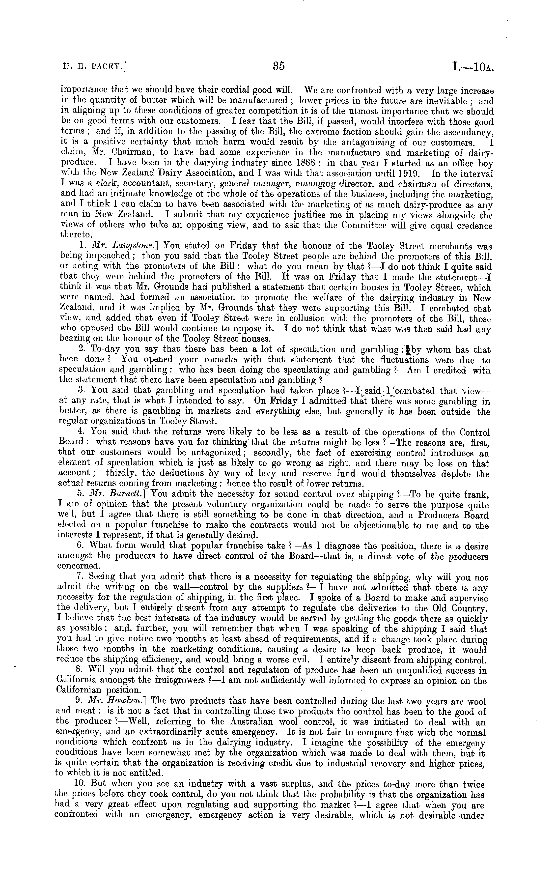 importance that we should have their cordial good will. We are confronted with a very large increase in the quantity of butter which will be manufactured; lower prices in the future are inevitable ; and in aligning up to these conditions of greater competition it is of the utmost importance that we should be on good terms with our customers. I fear that the Bill, if passed, would interfere with those good terms ; and if, in addition to the passing of the Bill, the extreme faction should gain the ascendancy, it is a positive certainty that much harm would result by the antagonizing of our customers. I claim, Mr. Chairman, to have had some experience in the manufacture and marketing of dairyproduce. I have been in the dairying industry since 1888 :in that year I started as an office boy with the New Zealand Dairy Association, and I was with that association until 1.919. In the interval I was a clerk, accountant, secretary, general manager, managing director, and chairman of directors, and had an intimate knowledge of the whole of the operations of the business, including the marketing, and I think I can claim to have been associated with the marketing of as much dairy-produce as any man in New Zealand. I submit that my experience justifies me in placing my views alongside the views of others who take an opposing view, and to ask that the Committee will give equal credence thereto. 1. Mr. Tjangstone.] You stated on Friday that the honour of the Tooley Street merchants was being impeached; then you said that the Tooley Street people are behind the promoters of this Bill, or acting with the promoters of the Bill: what do you mean by that ?—I do not think I quite said that they were behind the promoters of the Bill. It was on Friday that I made the statement—l think it was that Mr. Grounds had published a statement that certain houses in Tooley Street, which were named, had formed an association to promote the welfare of the dairying industry in New Zealand, and it was implied by Mr. Grounds that they were supporting this Bill. I combated that view, and added that even if Tooley Street were in collusion with the promoters of the Bill, those who opposed the Bill would continue to oppose it. Ido not think that what was then said had any bearing on the honour of the Tooley Street houses. 2. To-day you say that there has been a lot of speculation and gambling: |by whom has that been done ? You opened your remarks with that statement that the fluctuations were due to speculation and gambling : who has been doing the speculating and gambling ?—Am I credited with the statement that there have been speculation and gambling ? 3. You said that gambling and speculation had taken place?—l-said I combated that view— at any rate, that is what I intended to say. On Friday I admitted that there was some gambling in butter, as there is gambling in markets and everything else, but generally it has been outside the regular organizations in Tooley Street. 4. You said that the returns were likely to be less as a result of the operations of the Control Board : what reasons have you for thinking that the returns might be less ?—The reasons are, first, that our customers would be antagonized ; secondly, the fact of exercising control introduces an element of speculation which is just as likely to go wrong as right, and there may be loss on that account; thirdly, the deductions by way of levy and reserve fund would themselves deplete the actual returns coming from marketing : hence the result of lower returns. 5. Mr. Burnett.] You admit the necessity for sound control over shipping ?—To be quite frank, lam of opinion that the present voluntary organization could be made to serve the purpose quite well, but I agree that there is still something to be done in that direction, and a Producers Board elected on a popular franchise to make the contracts would not be objectionable to me and to the interests I represent, if that is generally desired. 6. What form would that popular franchise take ? —As I diagnose the position, there is a desire amongst the producers to have direct control of the Board—that is, a direct vote of the producers concerned. 7. Seeing that you admit that there is a necessity for regulating the shipping, why will you not admit the writing on the wall—control by the suppliers ?—I have not admitted that there is any necessity for the regulation of shipping, in the first place. I spoke of a Board to make and supervise the delivery, but I entirely dissent from any attempt to regulate the deliveries to the Old Country. I believe that the best interests of the industry would be served by getting the goods there as quickly as possible ; and, further, you will remember that when I was speaking of the shipping I said that you had to give notice two months at least ahead of requirements, and if a change took place during those two months in the marketing conditions, causing a desire to keep back produce, it would reduce the shipping efficiency, and would bring a worse evil. I entirely dissent from shipping control. 8. Will you admit that the control and regulation of produce has been an unqualified success in California amongst the fruitgrowers ?—I am not sufficiently well informed to express an opinion on the Californian position. 9. Mr. Hawken.] The two products that have been controlled during the last two years are wool and meat: is it not a fact that in controlling those two products the control has been to the good of the producer ?—Well, referring to the Australian wool control, it was initiated to deal with an emergency, and an extraordinarily acute emergency. It is not fair to compare that with the normal conditions which confront us in the dairying industry. I imagine the possibility of the emergeny conditions have been somewhat met by the organization which was made to deal with them, but it is quite certain that the organization is receiving credit due to industrial recover
